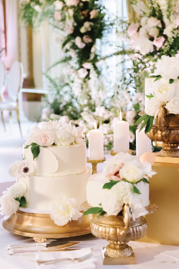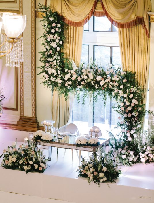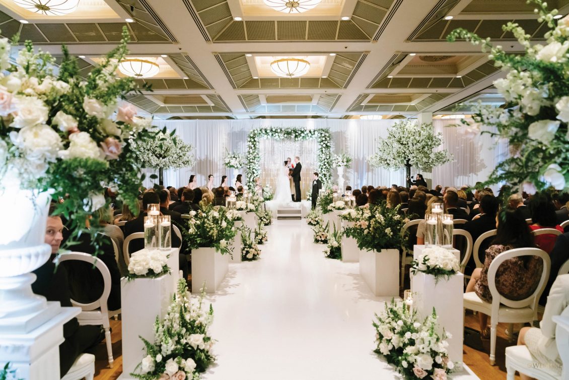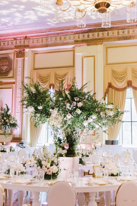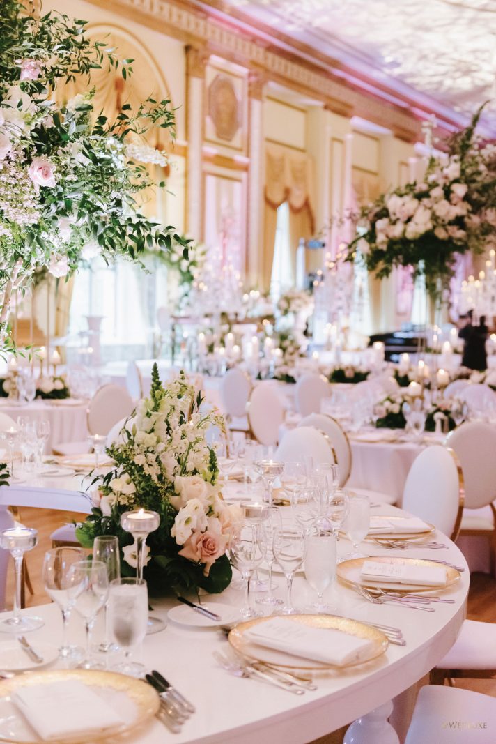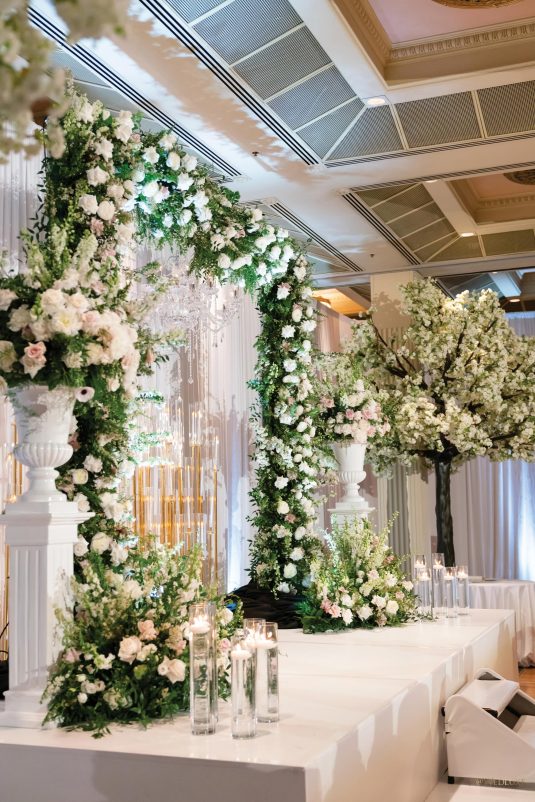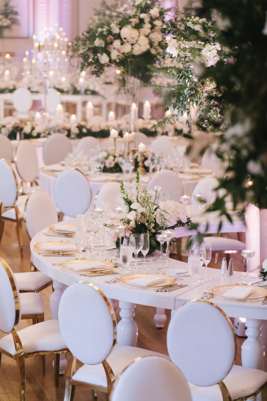 draping, plinths, chairs, linens, dinnerware, furniture, and cherry blossoms,