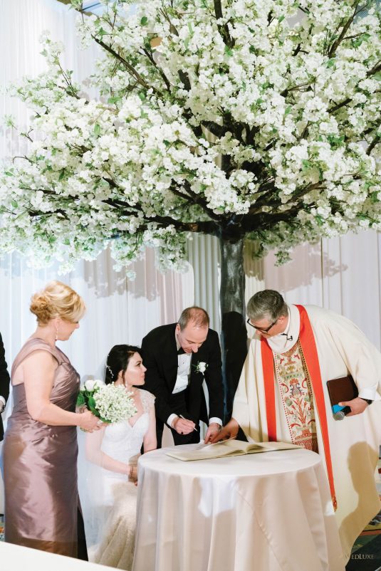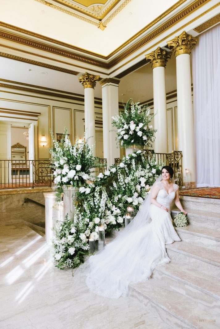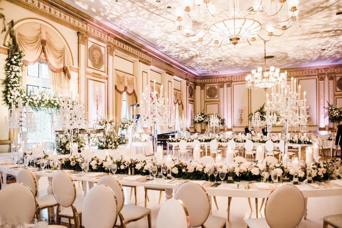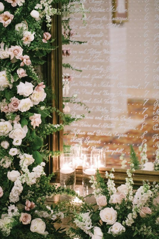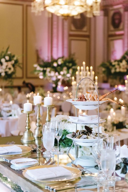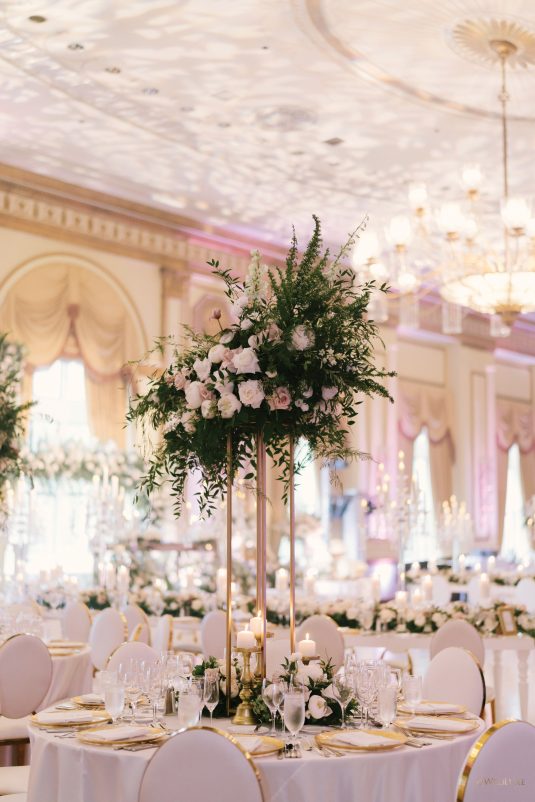 draping, plinths, chairs, linens, dinnerware, furniture, and cherry blossoms,