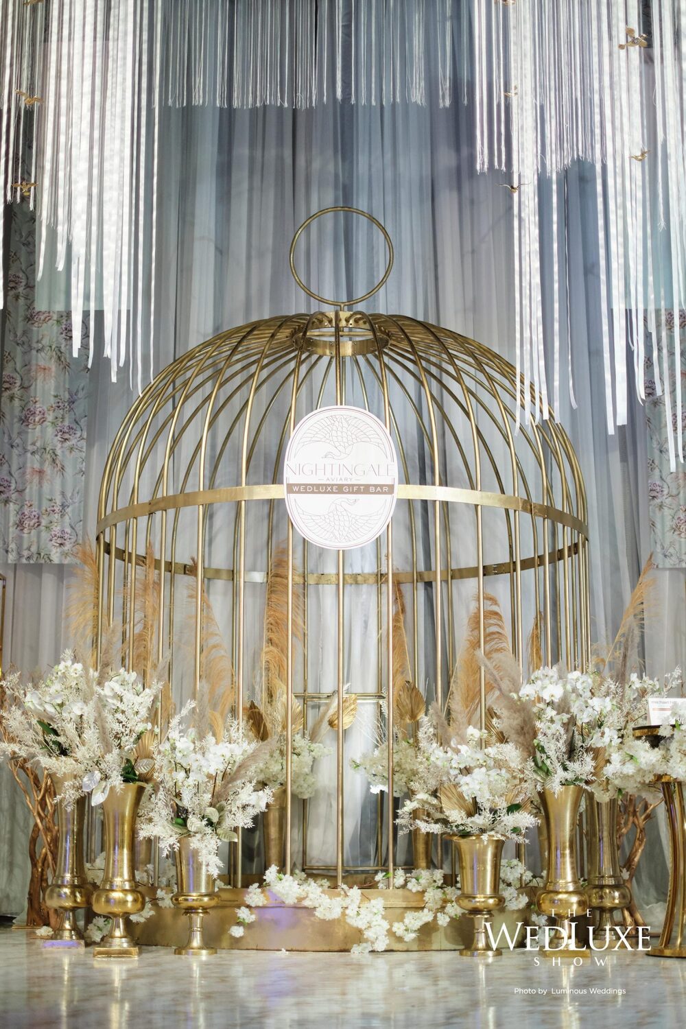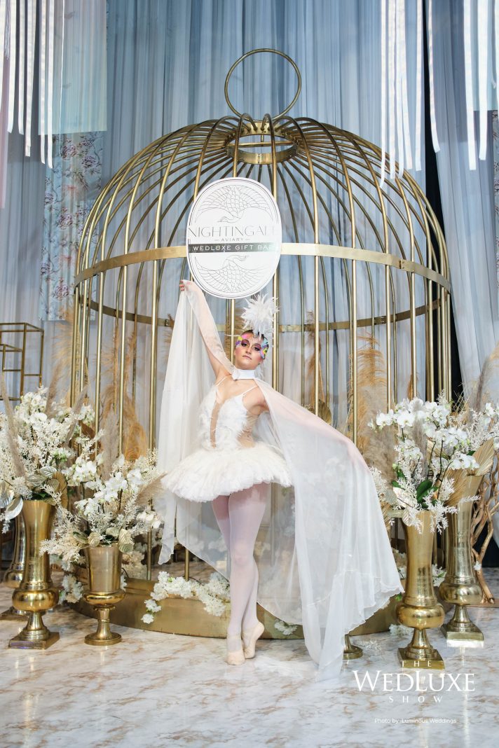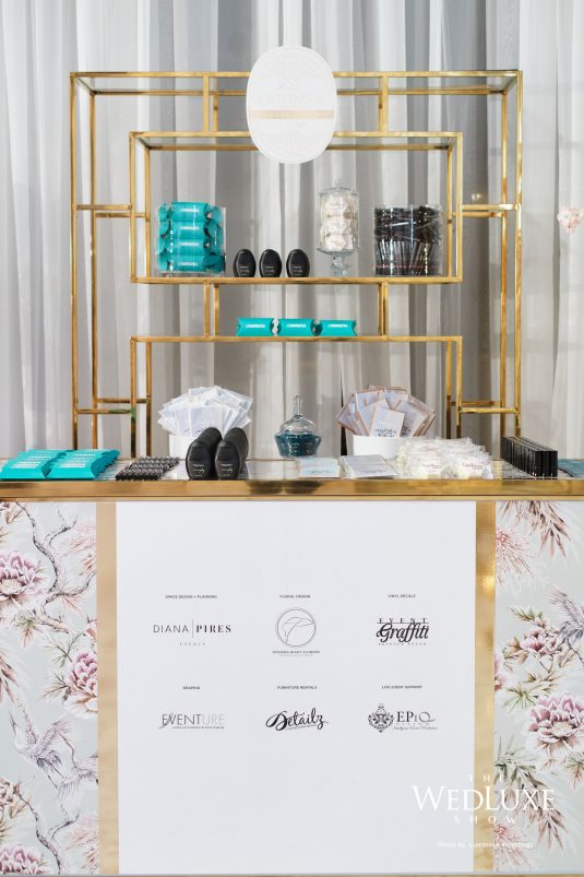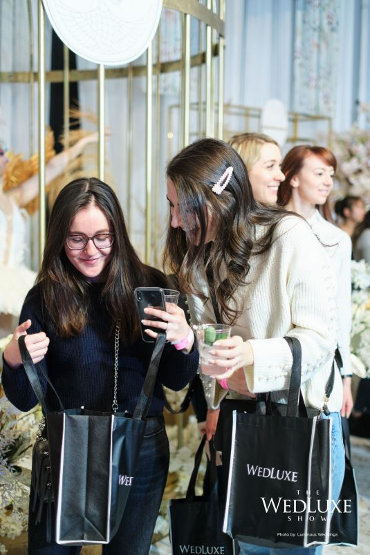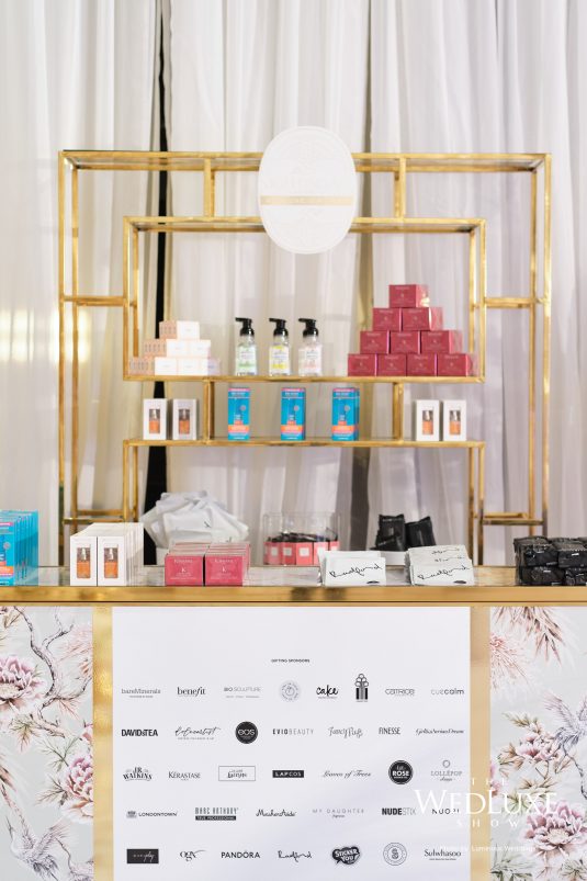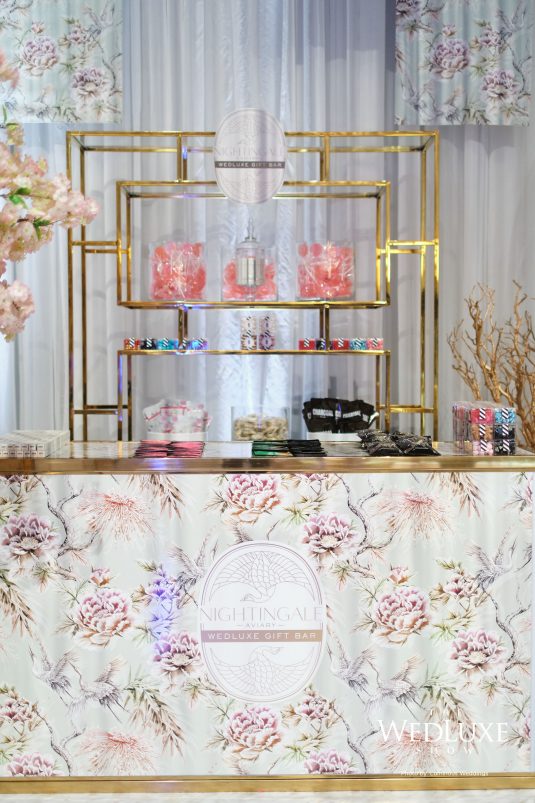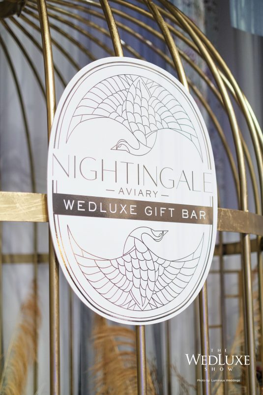 The Concert Hall was turned into a dreamy aviary (complete with hanging fringe, a 12-ft birdcage, and live performances) for the occasion, with the gifting experience set up on the stage. The coveted WedLuxe Gift Bar is always one of the most talked-about experiences at the WedLuxe Show and this year was no exception! Guests were treated to a “complimentary shopping experience”, where they could choose from a variety of luxury gifts, ranging from skincare and makeup to sweet treats and tea. Attendees