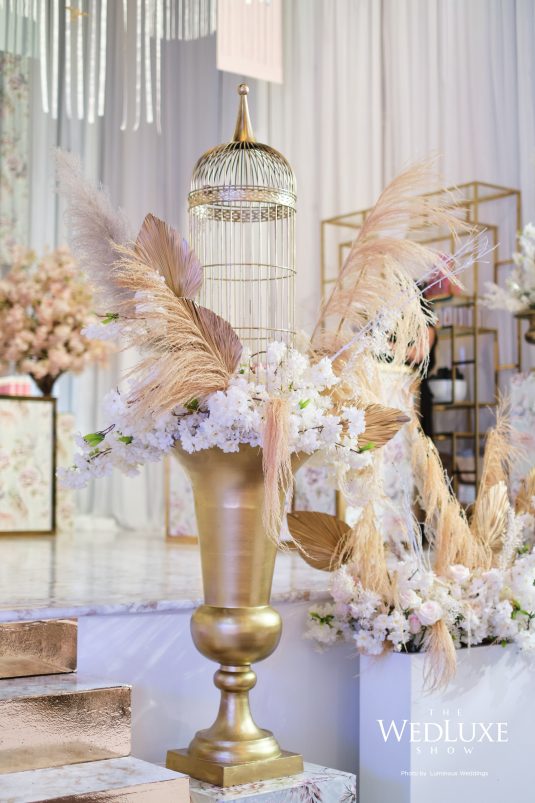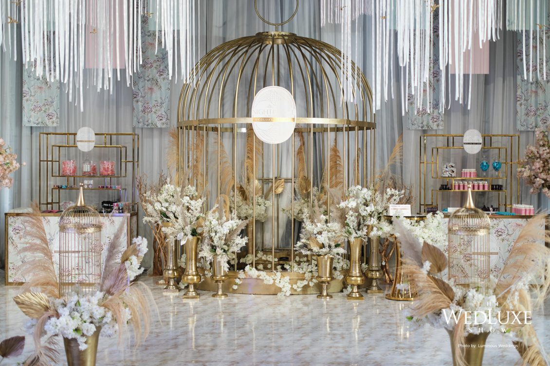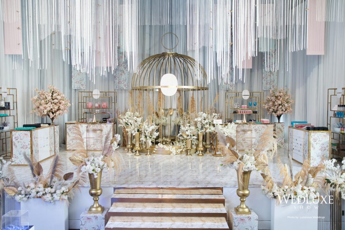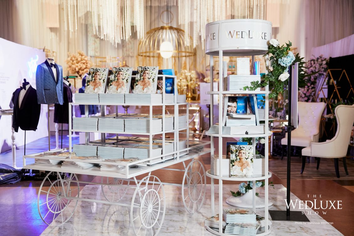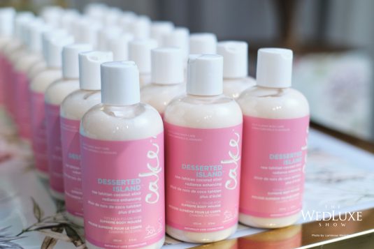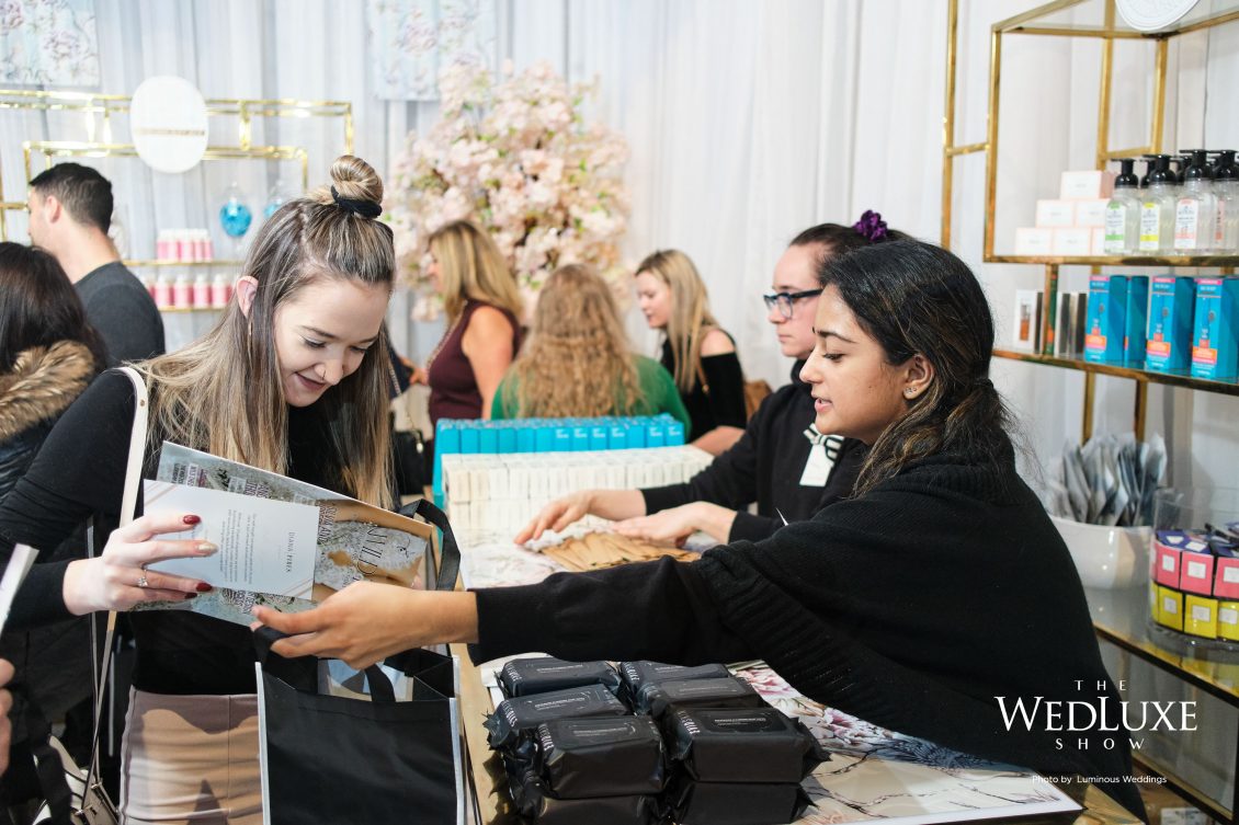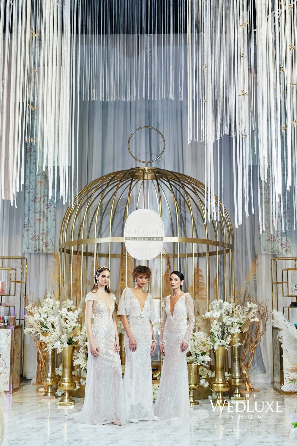 The Concert Hall was turned into a dreamy aviary (complete with hanging fringe, a 12-ft birdcage, and live performances) for the occasion, with the gifting experience set up on the stage. The coveted WedLuxe Gift Bar is always one of the most talked-about experiences at the WedLuxe Show and this year was no exception! Guests were treated to a “complimentary shopping experience”, where they could choose from a variety of luxury gifts, ranging from skincare and makeup to sweet treats and tea. Attendees