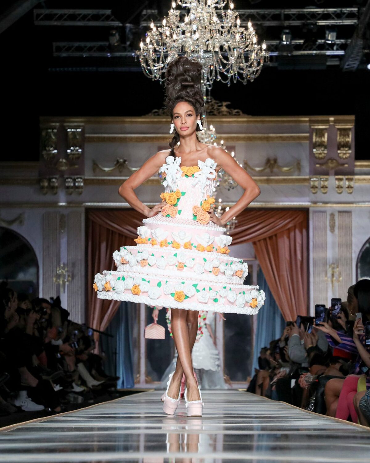 What can we say? Moschino‘s Fall 2020 collection is bringing the drama! Using a pastel color palette, this collection blends Rococo style and cake decorating, solidifying the comeback of the tiered dress (check out Bridal Fall 2020 Fashion Week for more examples). Other elements we’re loving include the return of the bustle, the Marie Antoinette hair, and lace-up shoes. Whether you’re looking for cake design inspiration or pastel decor, keep scrolling to see more #OTT gowns.