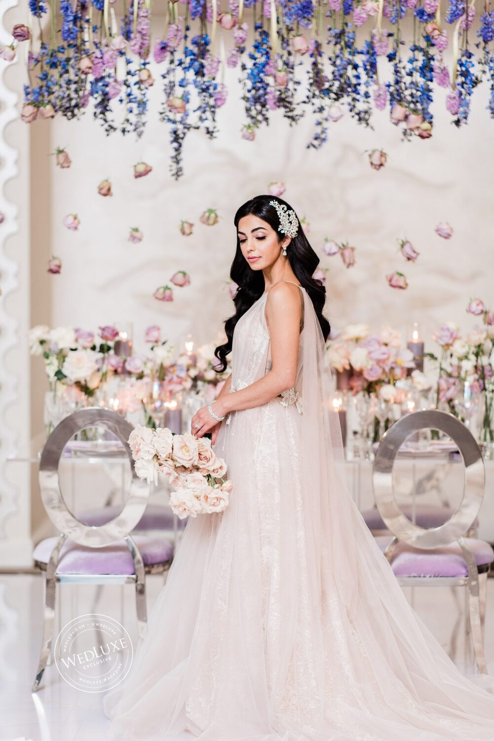 We are LIVING for every shade of lavender used in this gorgeous styled shoot. Blush, lilac, blue, and of course lavender, come together to create a beautiful design statement, complemented by iridescent glassware and silver touches. And can we have a moment of appreciation for the hanging flowers? Romance personified!