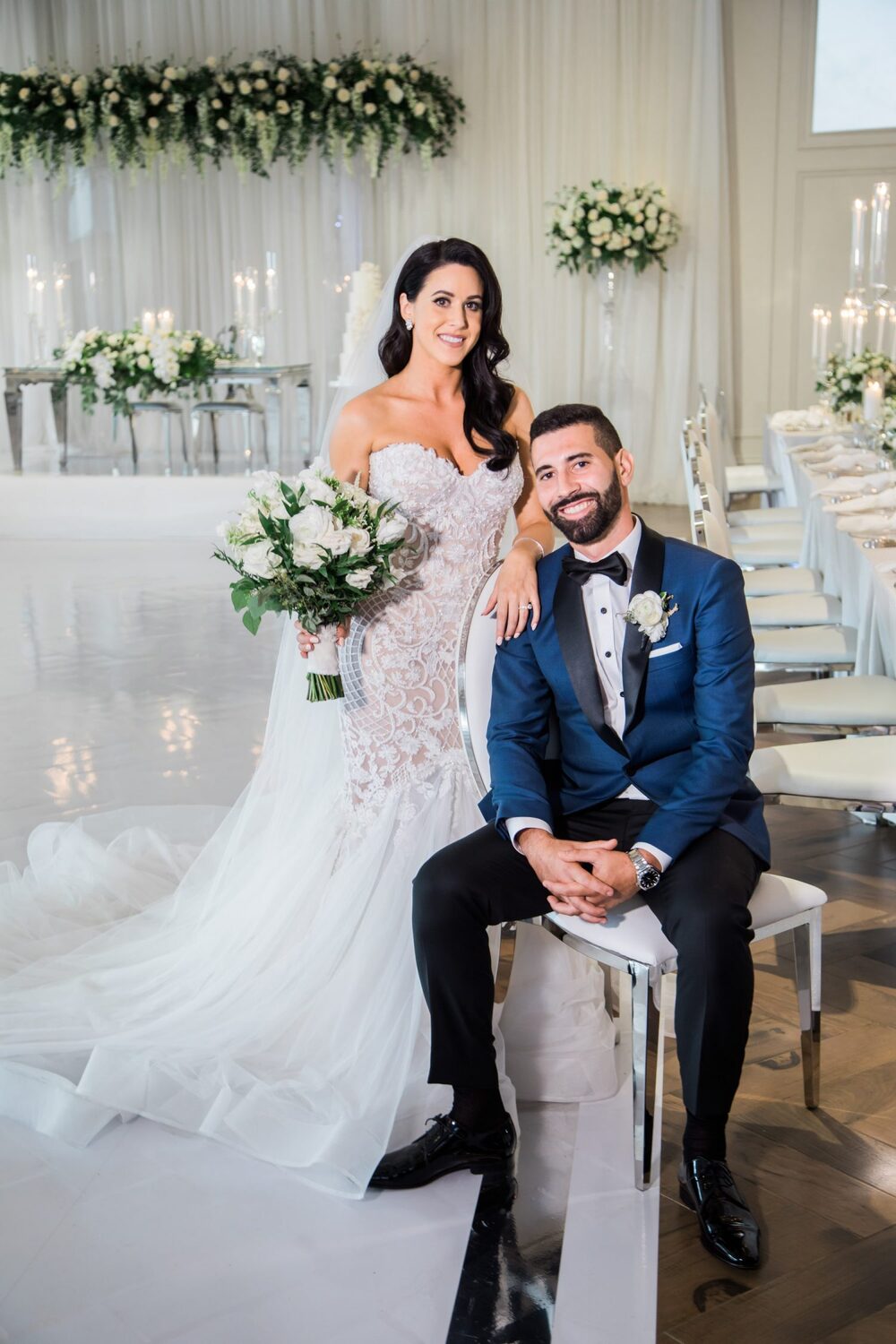 Radiating cool and contemporary, Vanessa and Sal’s monochromatic wedding is perfect for the cooler weather! Grey hues are given the luxe treatment with rows of crystal candelabras, silver accents, and a variety of high and low centerpieces.