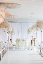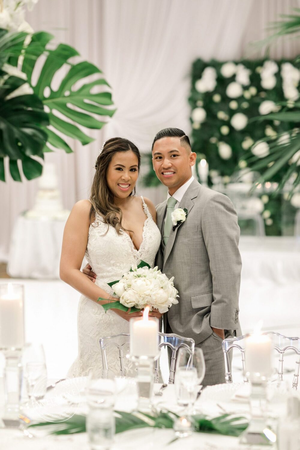 Talk about a lush affair! For their big day, Karen and Dean wanted to evoke a tropical paradise. “Our theme was tropical greens with a modern twist. I really love green leaves and lush arrangements, so I wanted to incorporate that into the day. To achieve this we had clouds of green leaves and tropical lush arrangements floating above the family tables and incorporated many different green tones,” shares the bride.