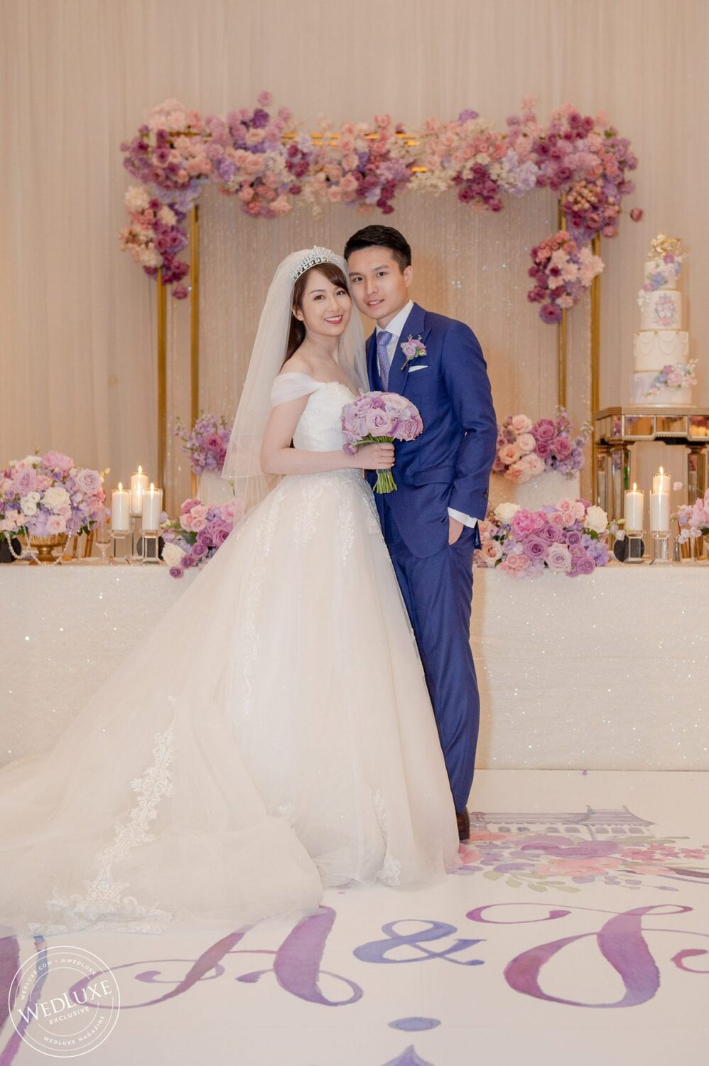 From start to end, Angelina and Jacky’s wedding embraced purple hues and all things fairytale with whimsical blooms and crystal accents. The sun-drenched ceremony stole the show with an ombre floral arch that gave off a vibrant glow. Following the couple’s I do’s, guests made their way to the reception decorated with punchy hues of purple, crystal accents, and a striking watercolour monogram that was showcased across the dance floor and wedding cake!