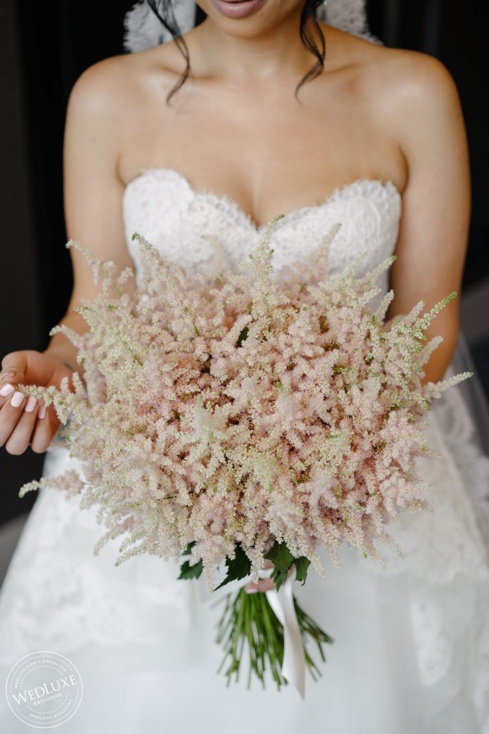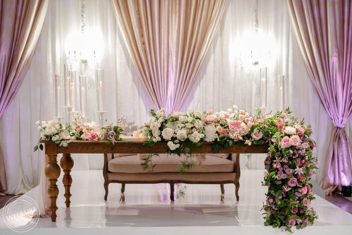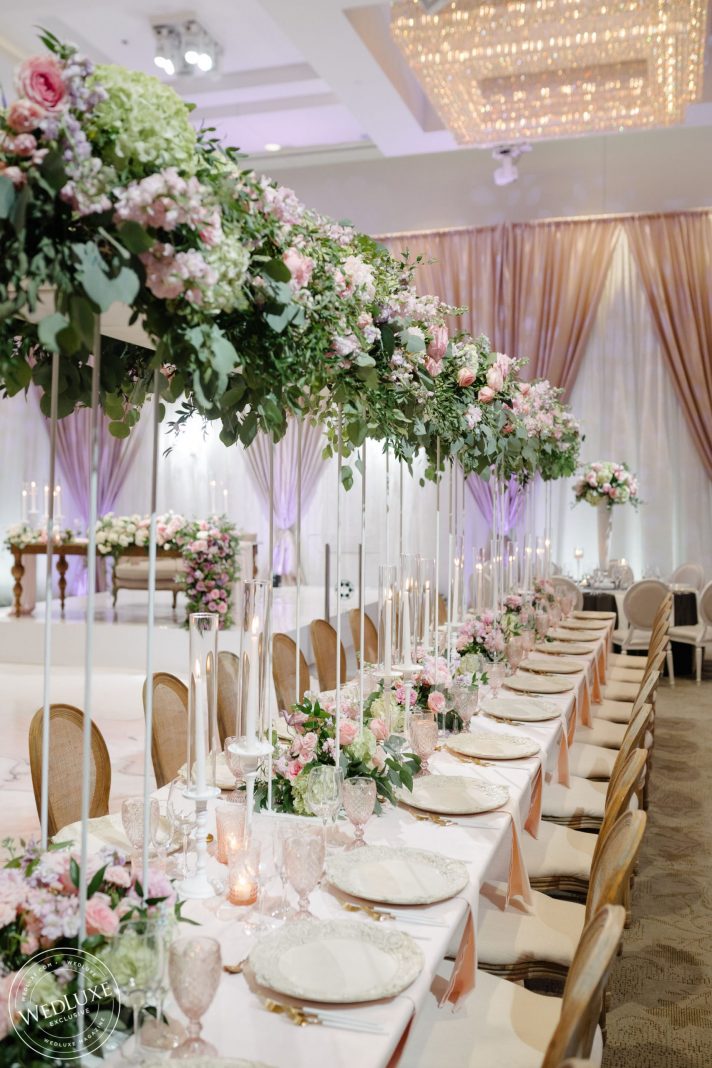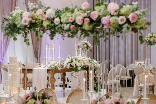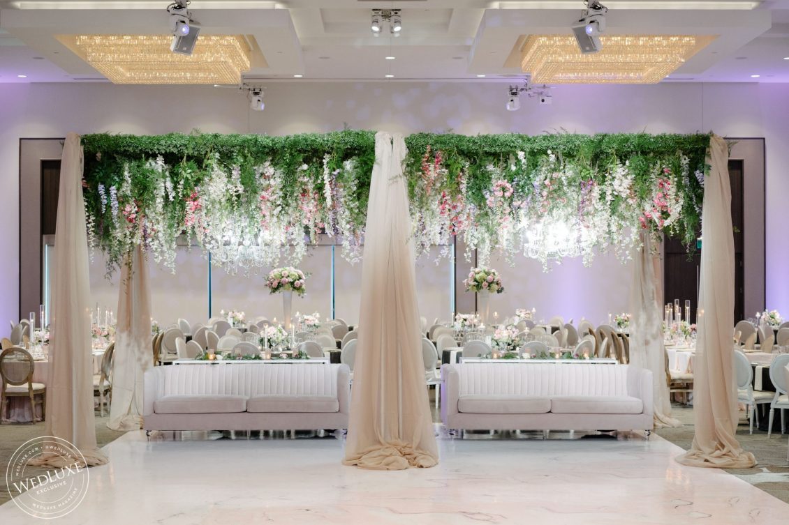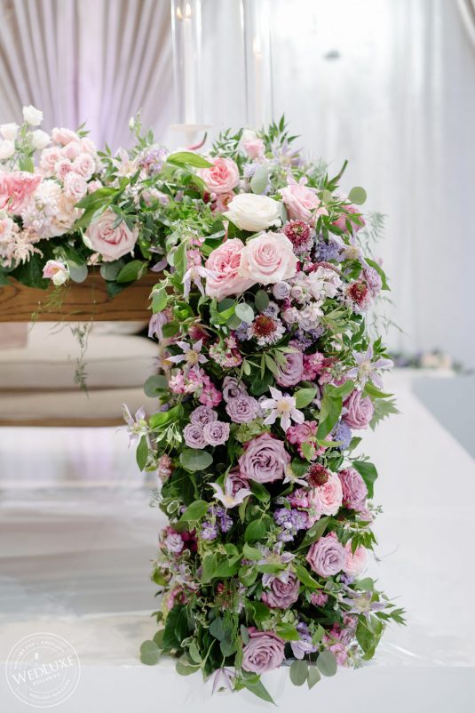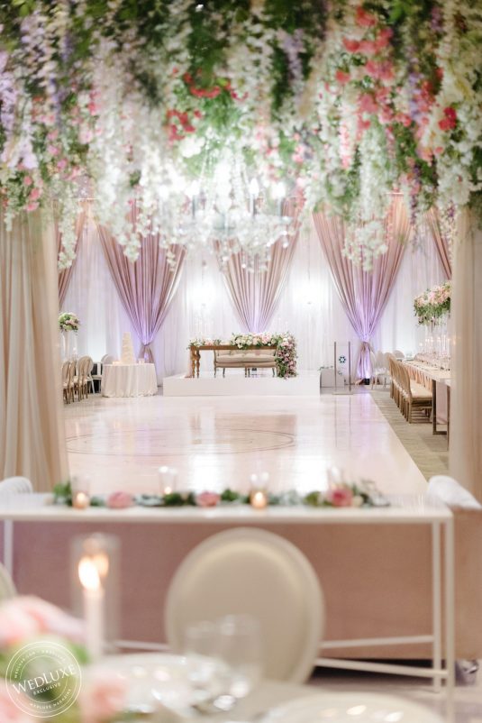 We love an indoor garden wedding and Caroline and Beshoui’s is a stand-out! The ballroom was transformed into a garden paradise, with an overflow of loose hanging greenery, pretty pink and purple florals, and complemented with modern accents in soft, neutral tones. We particularly love the ornate-meets-modern tableware and blush textured bouquets.