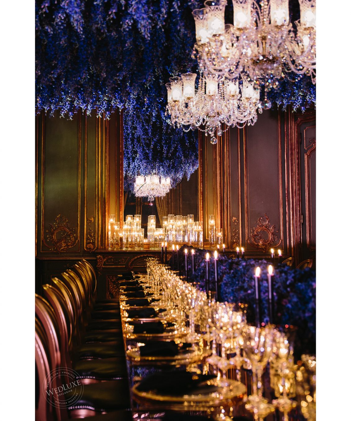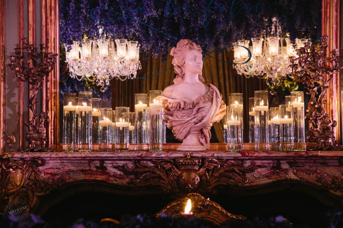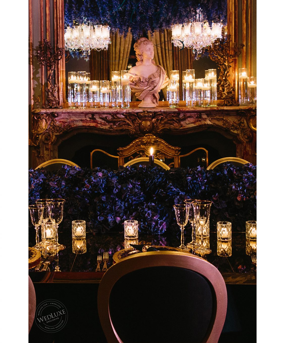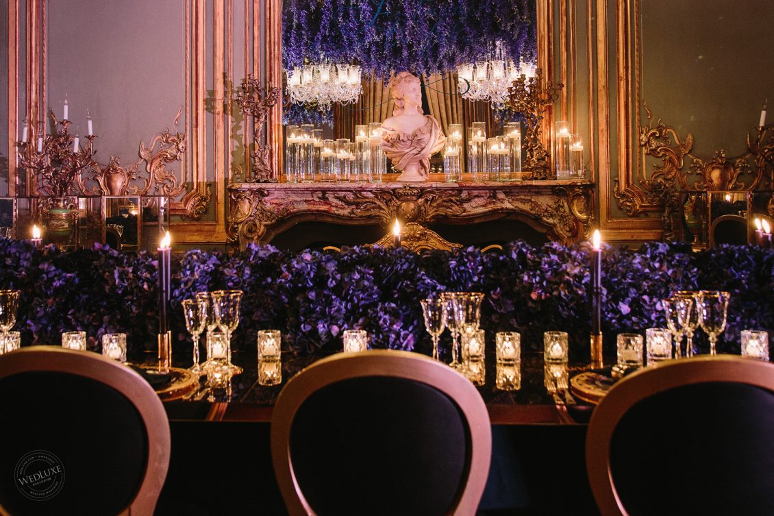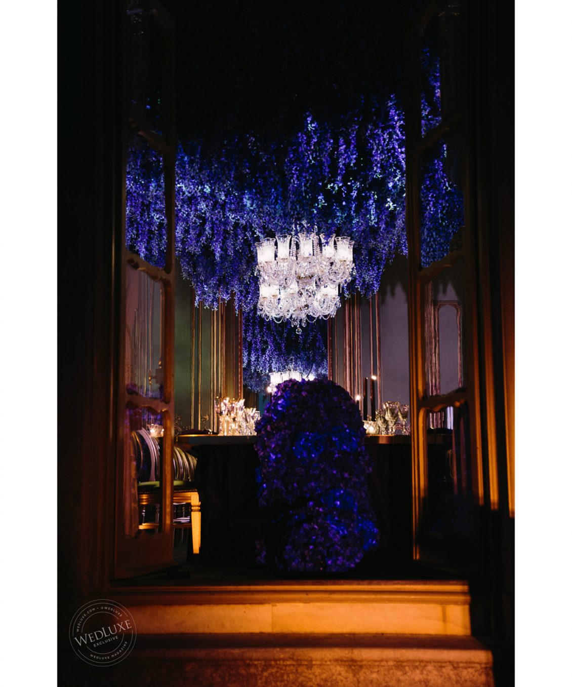 This wedding is perfectly intimate, spectacular, and incredibly glam. The (extremely private, hence not shown!) couple were married at the iconic – Cliveden House just outside of London, England. Designer and floral genius Larry Walshe created a sweeping mirrored aisle that featured a MAJOR design moment with a floor-to-ceiling recreation of a magnolia tree. The incredible design ambiance continued into the evening with a small, yet sultry, reception that contrasted the earlier light-hued ceremony design with rich midnight blues, mirrors, candlelight, and metallics.