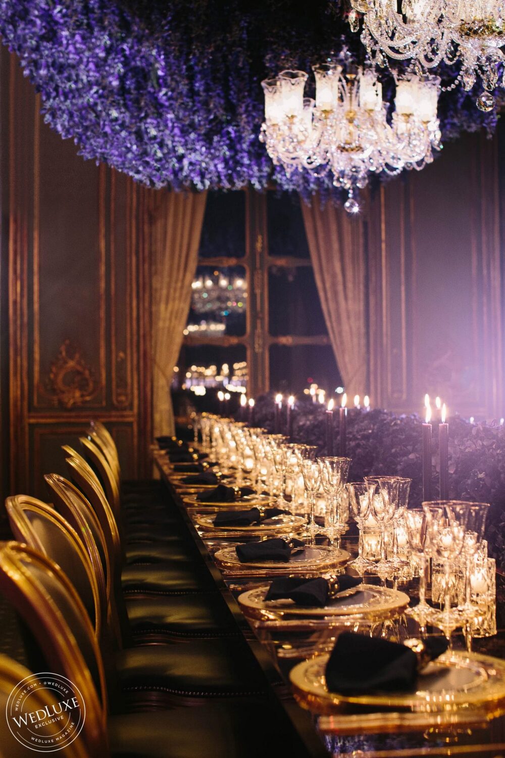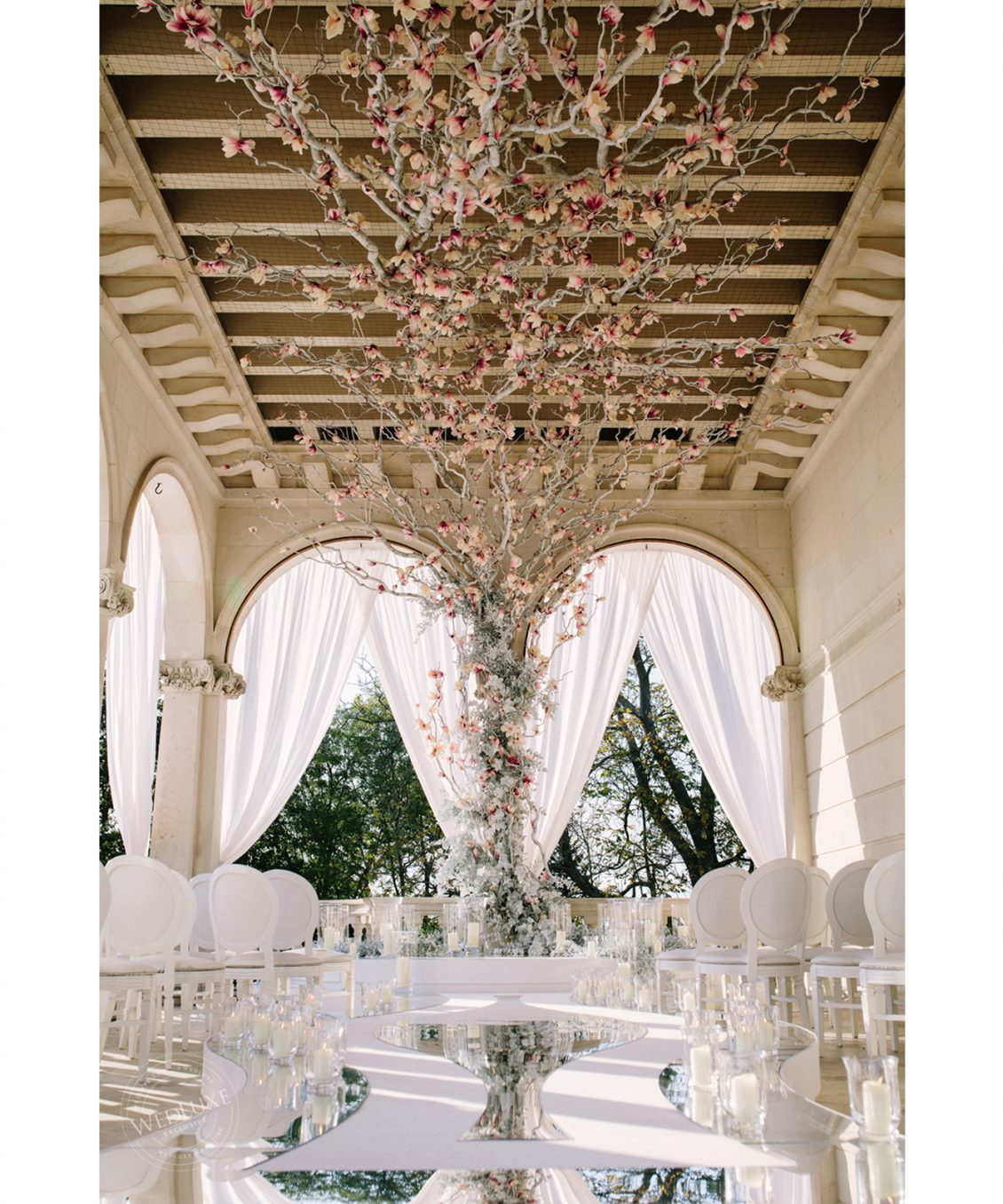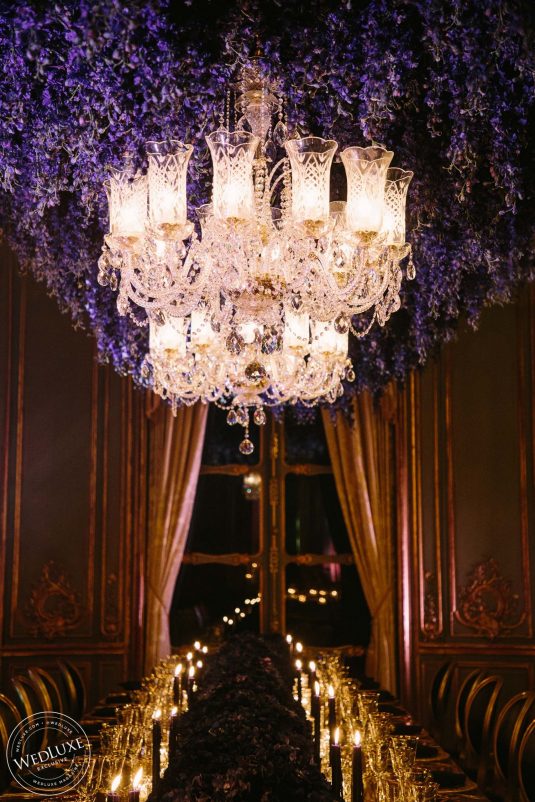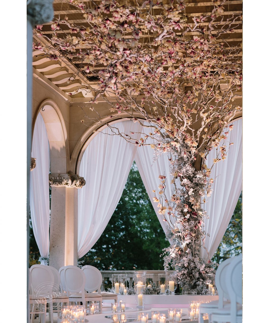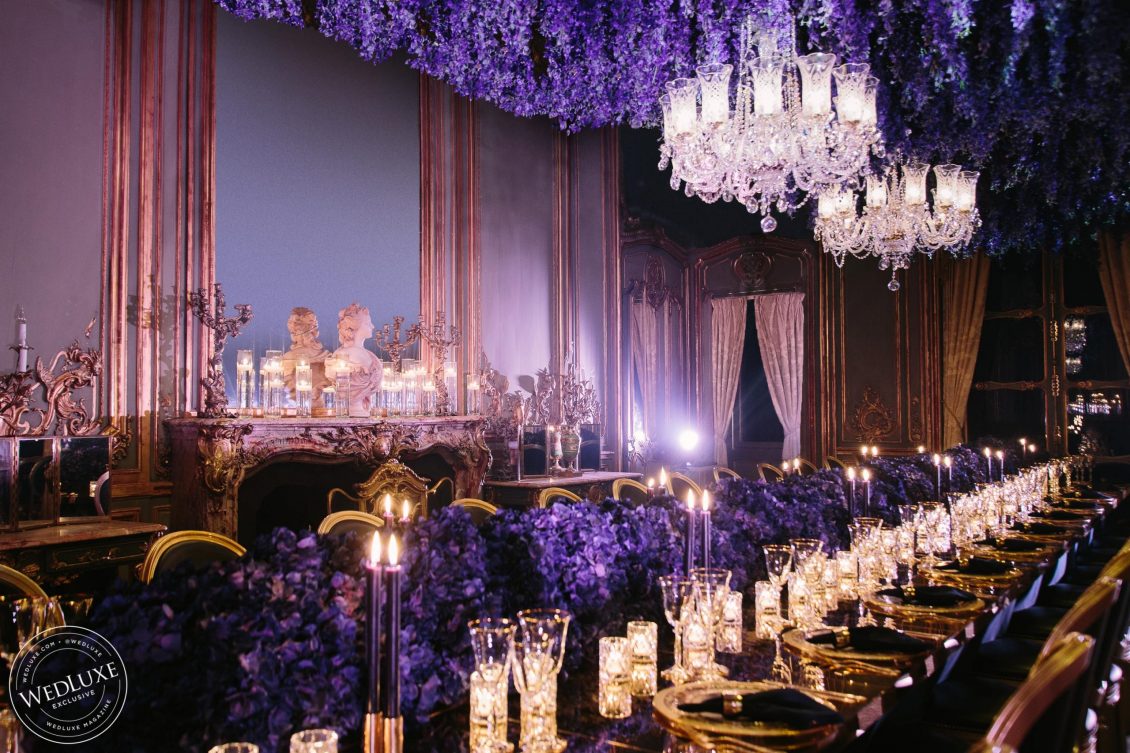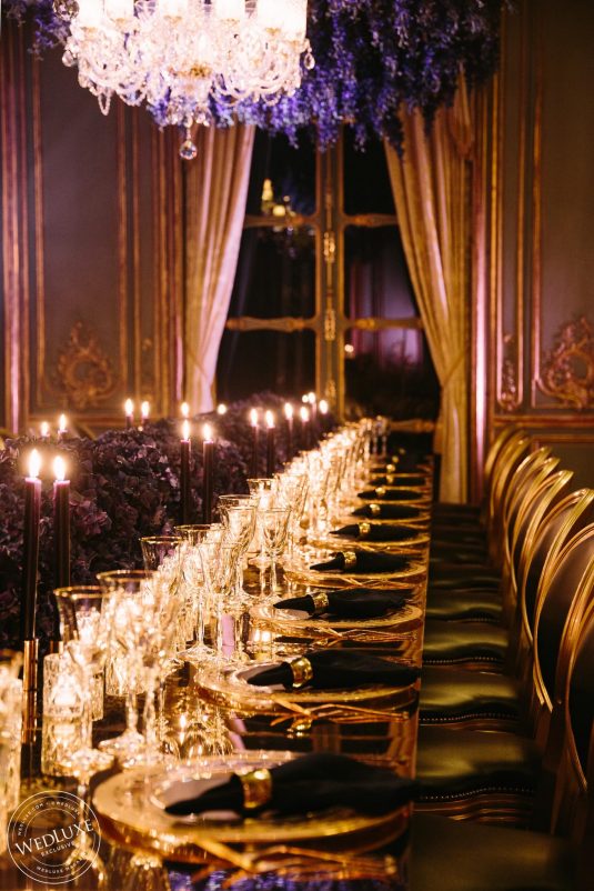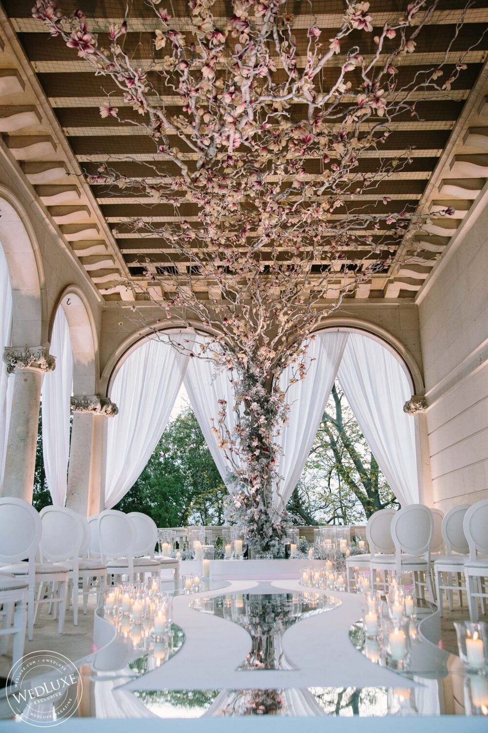 This wedding is perfectly intimate, spectacular, and incredibly glam. The (extremely private, hence not shown!) couple were married at the iconic – Cliveden House just outside of London, England. Designer and floral genius Larry Walshe created a sweeping mirrored aisle that featured a MAJOR design moment with a floor-to-ceiling recreation of a magnolia tree. The incredible design ambiance continued into the evening with a small, yet sultry, reception that contrasted the earlier light-hued ceremony design with rich midnight blues, mirrors, candlelight, and metallics.