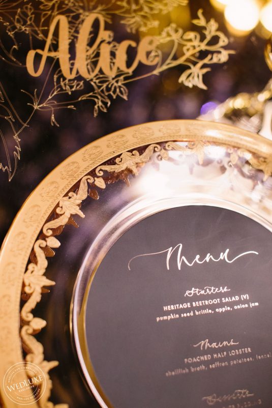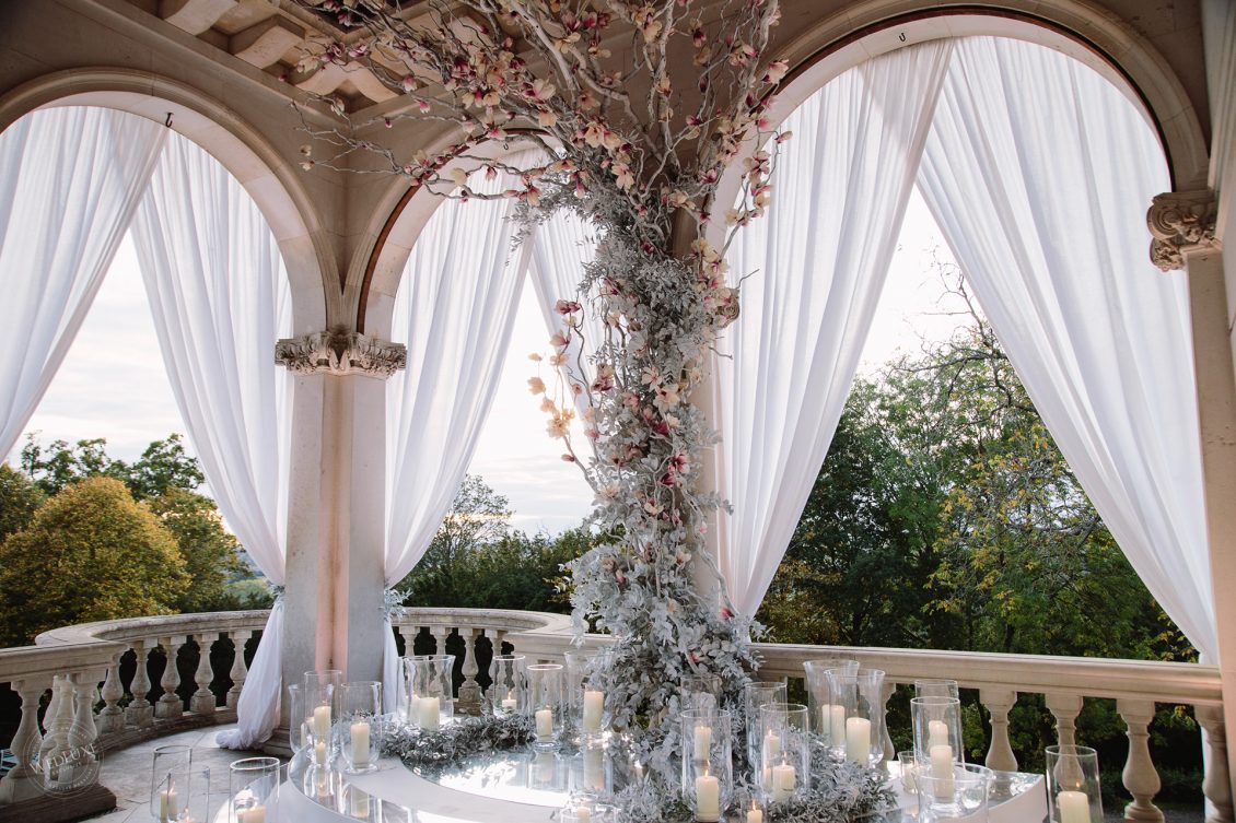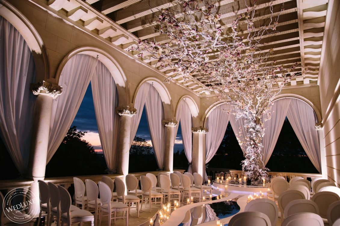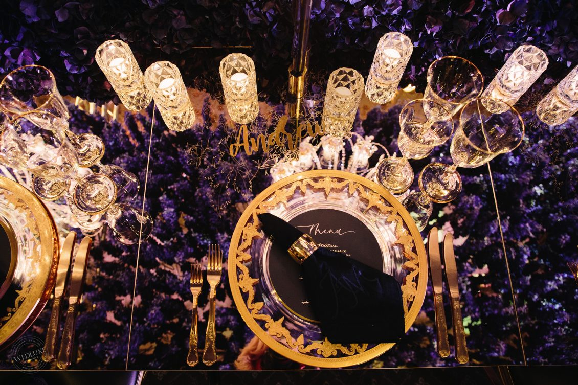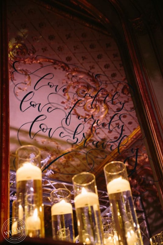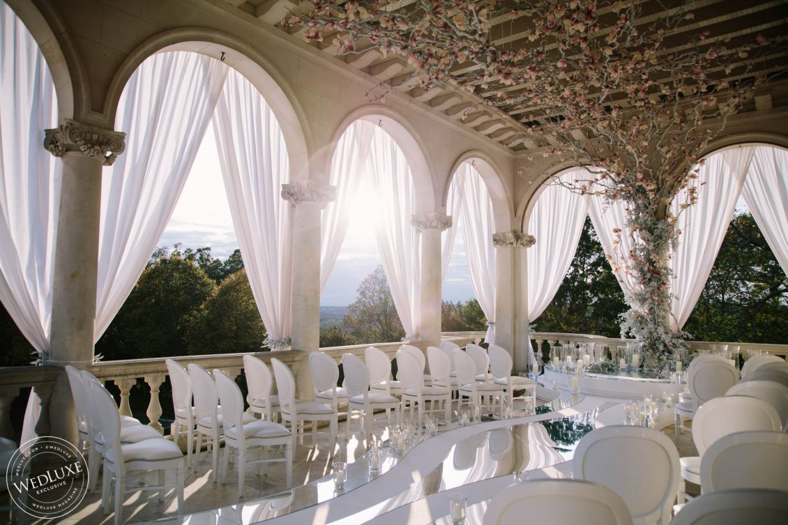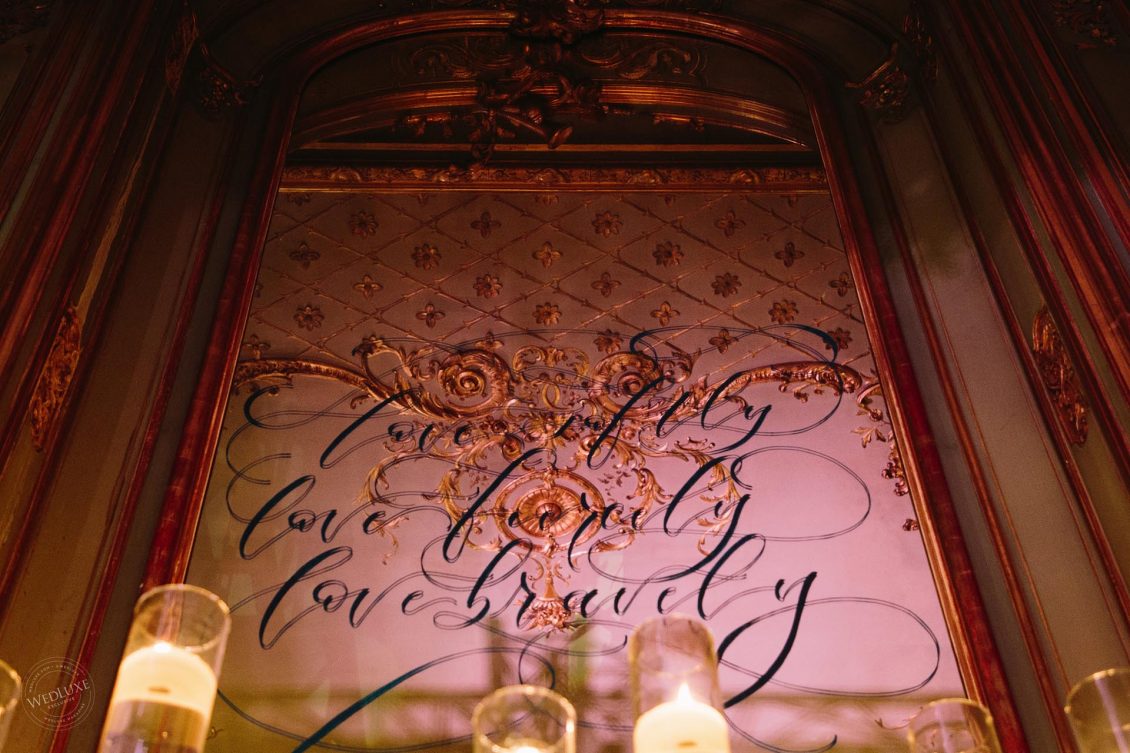 This wedding is perfectly intimate, spectacular, and incredibly glam. The (extremely private, hence not shown!) couple were married at the iconic – Cliveden House just outside of London, England. Designer and floral genius Larry Walshe created a sweeping mirrored aisle that featured a MAJOR design moment with a floor-to-ceiling recreation of a magnolia tree. The incredible design ambiance continued into the evening with a small, yet sultry, reception that contrasted the earlier light-hued ceremony design with rich midnight blues, mirrors, candlelight, and metallics.