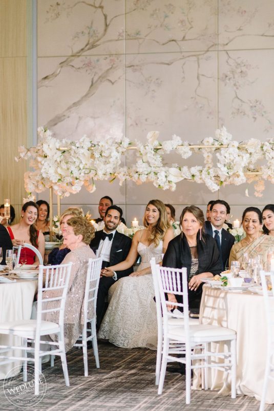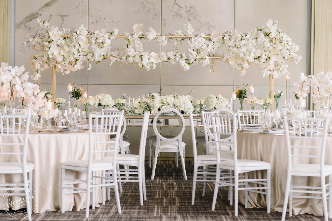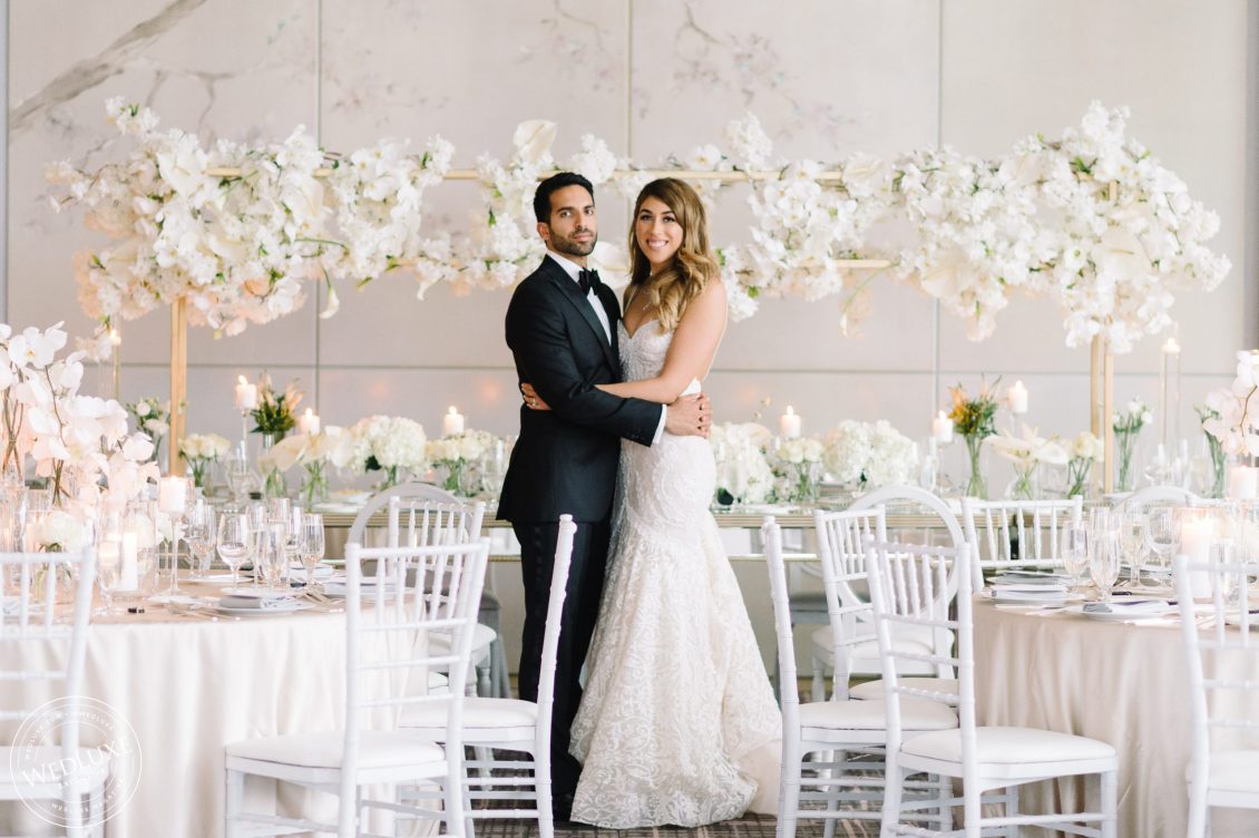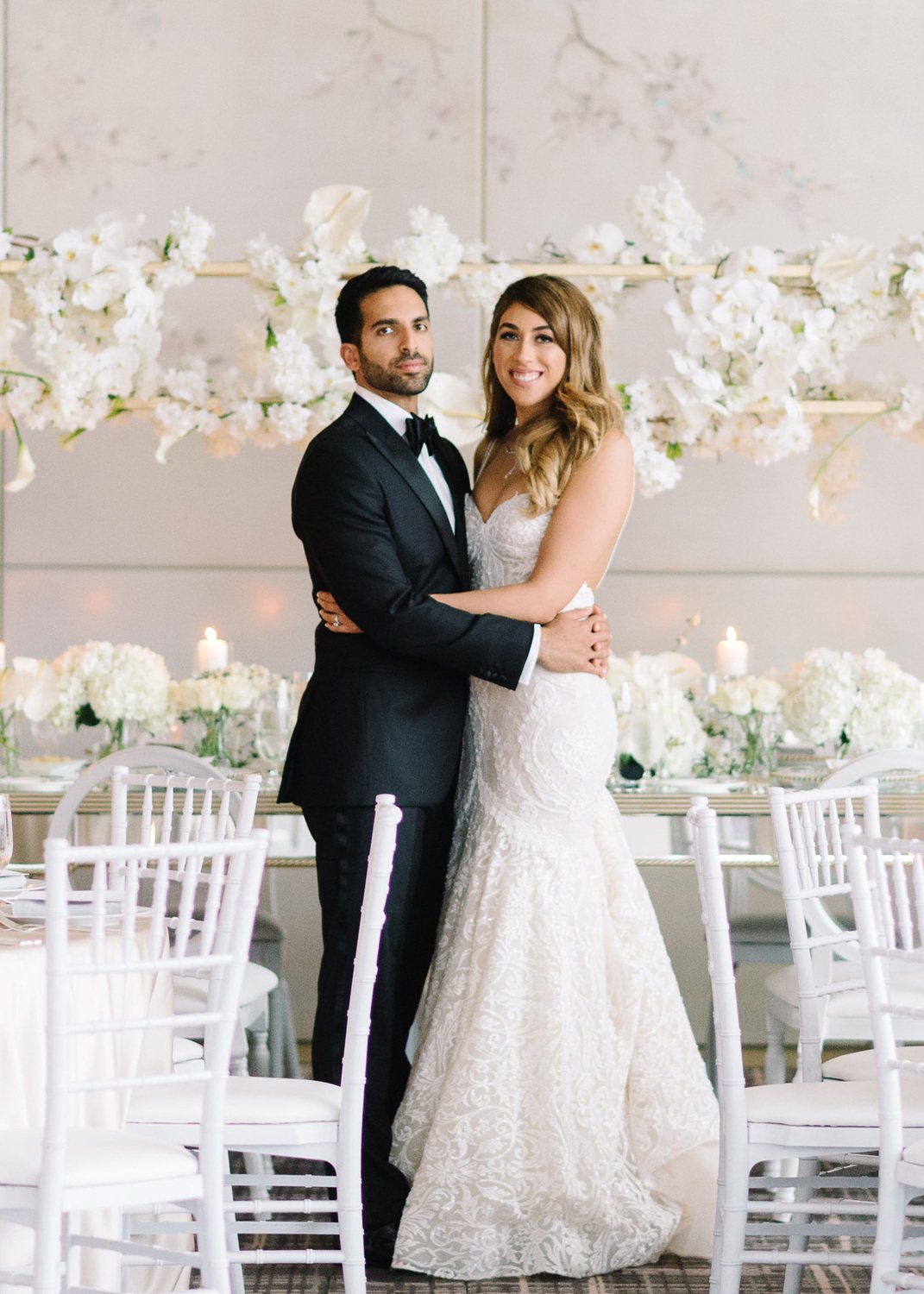 Brittany and Ganesh’s wedding is a breath of fresh air in this summer heatwave! Timeless white wedding decor was as far as the eye can see, complemented by crystal and gold accents. The true showstopper of the day (besides the blushing bride) was the head table, adorned with dreamy ivory blooms.