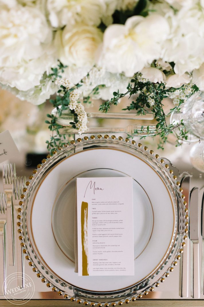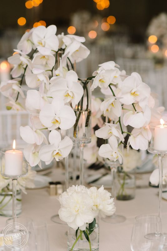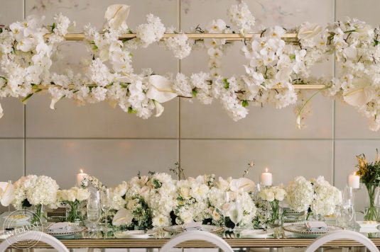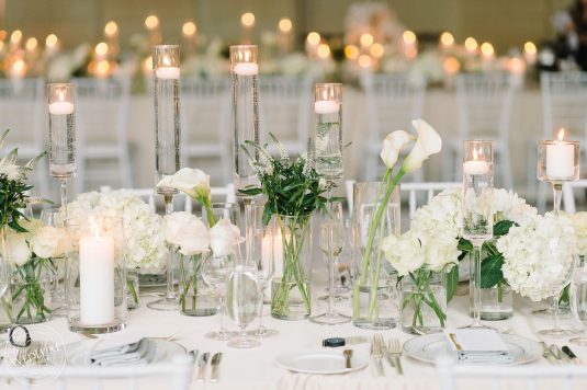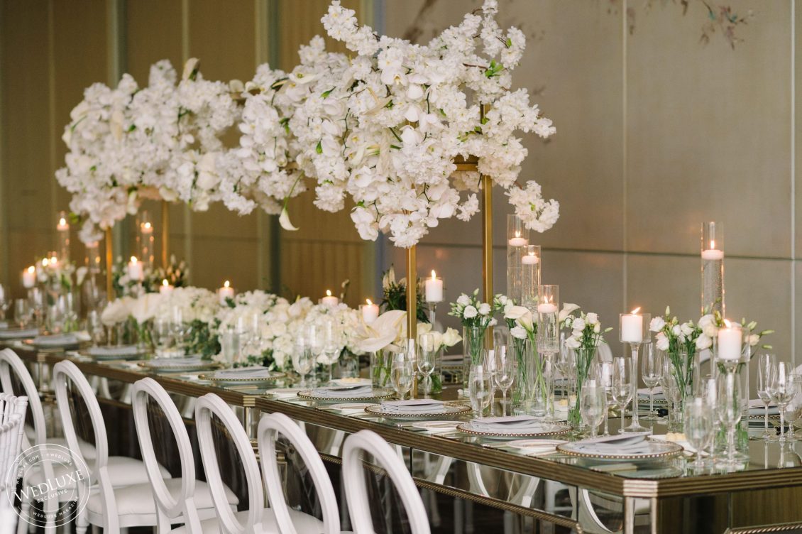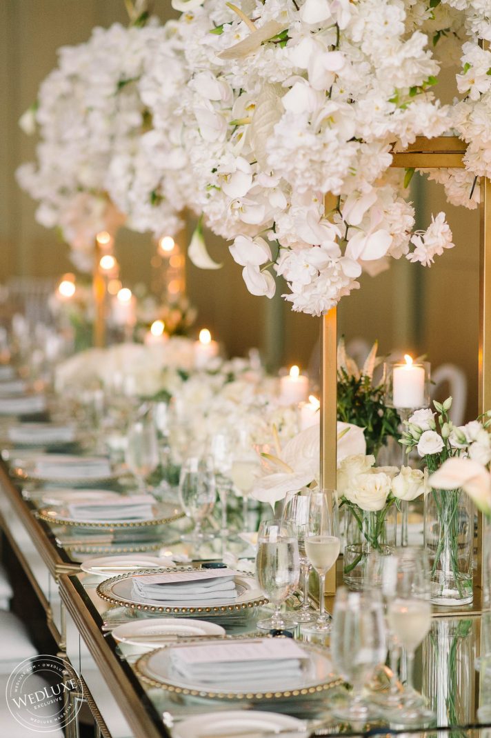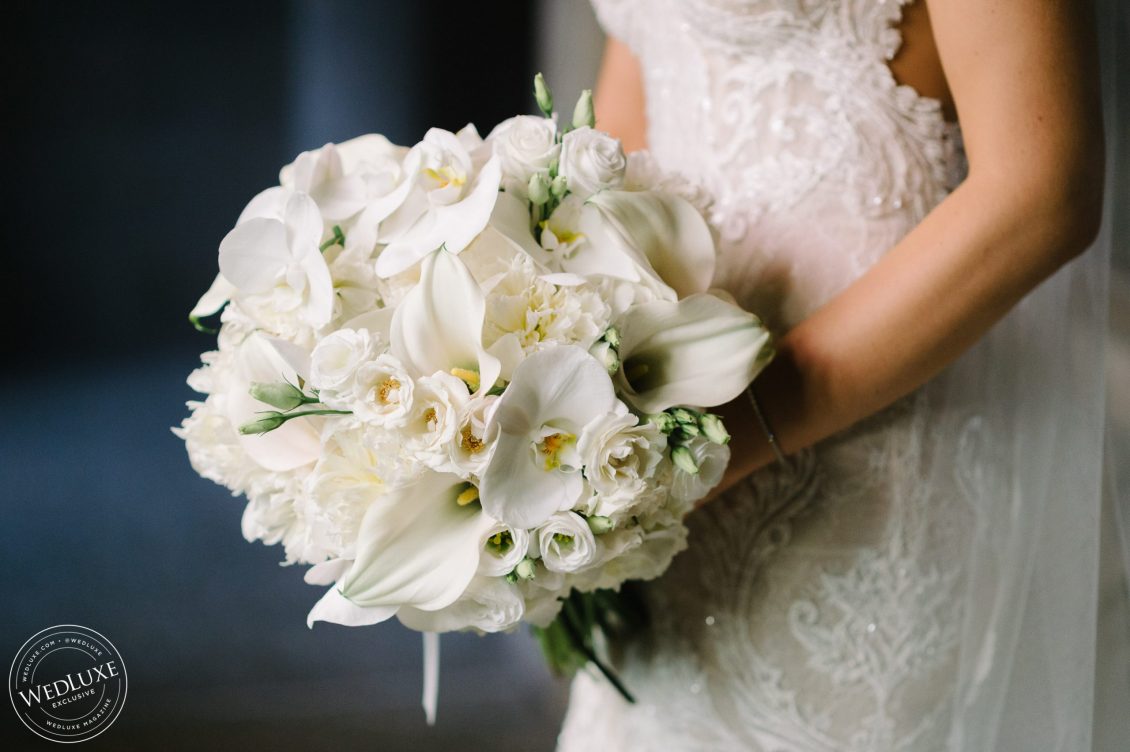Brittany and Ganesh’s wedding is a breath of fresh air in this summer heatwave! Timeless white wedding decor was as far as the eye can see, complemented by crystal and gold accents. The true showstopper of the day (besides the blushing bride) was the head table, adorned with dreamy ivory blooms.