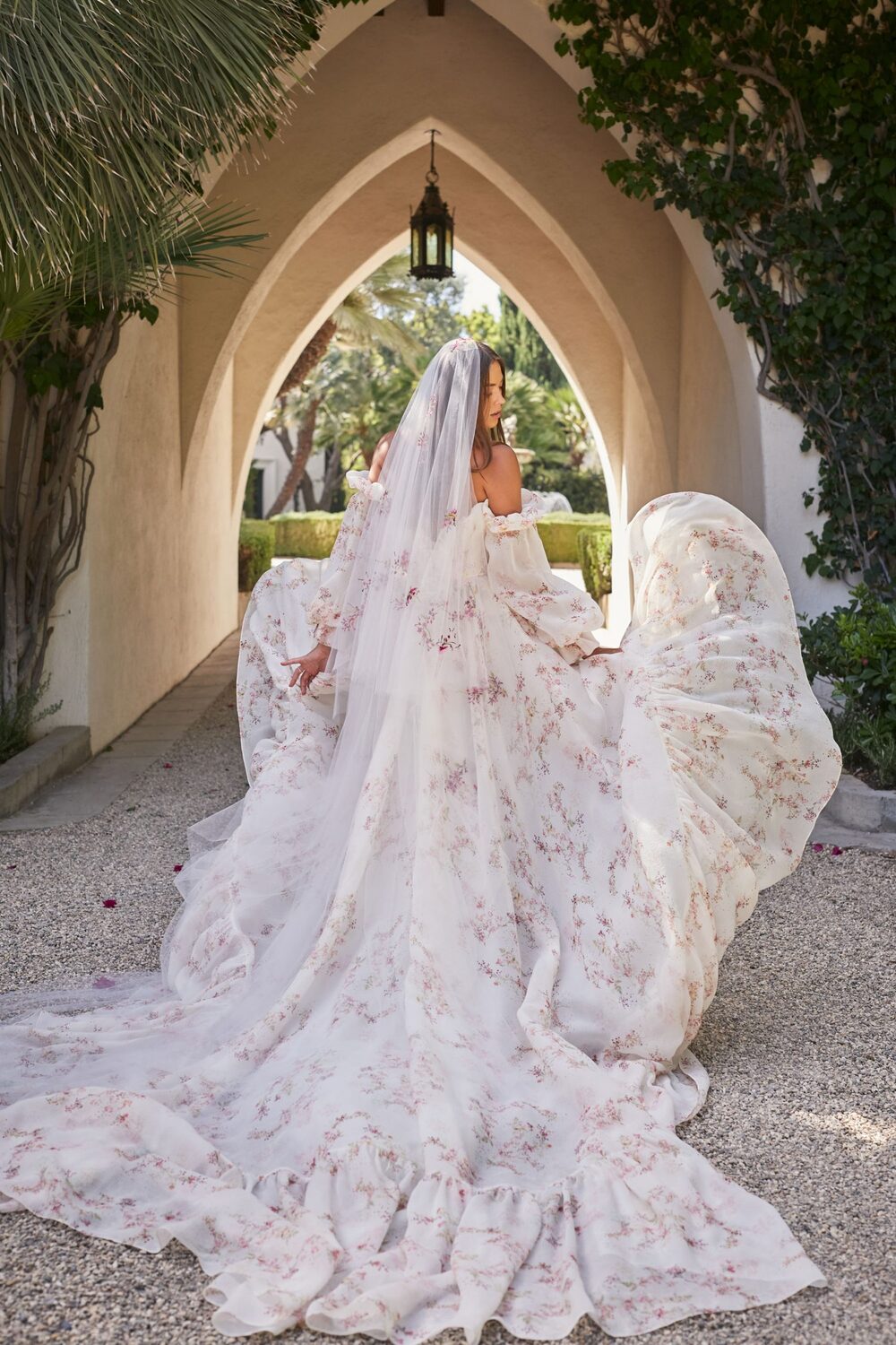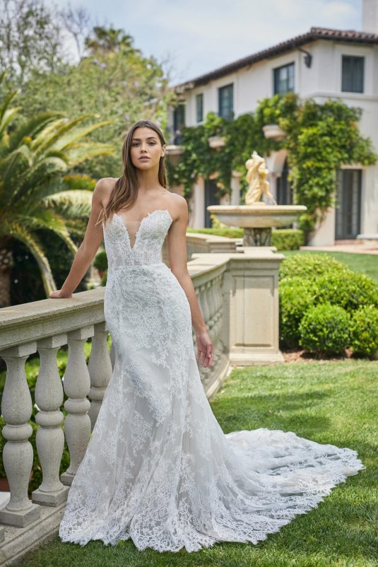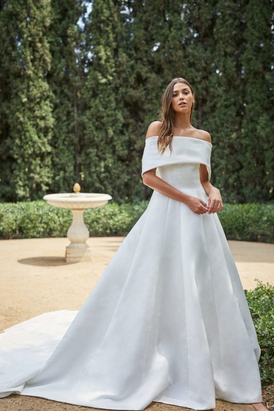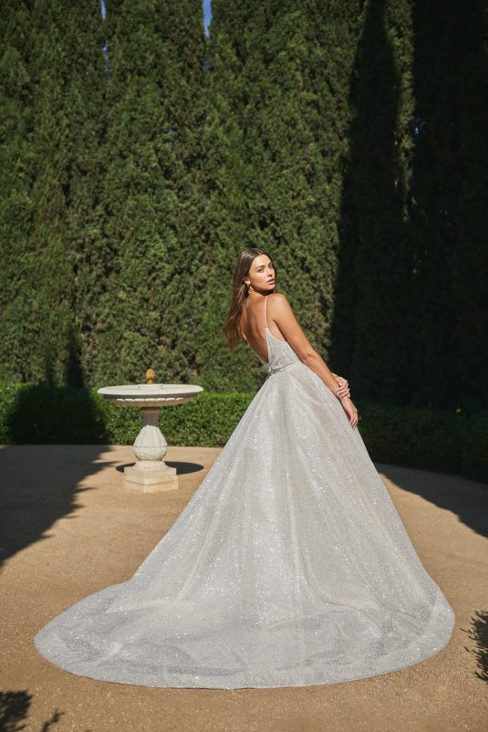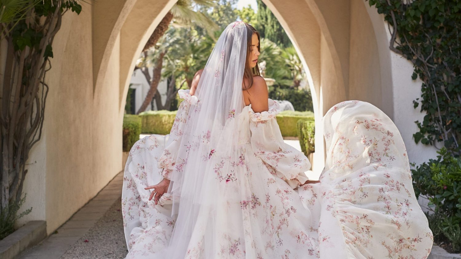 Monique Lhuillier Spring 2021 Bridal collection evokes a Spanish flair with California ease. This season is all about luminous embroideries, traditional laces, delicate floral details, and regal proportions. Flowing silhouettes with voluminous sleeves, deep v-necks and flamenco-style skirts dance into the night with poetic elegance as femininity and romance reign supreme!
