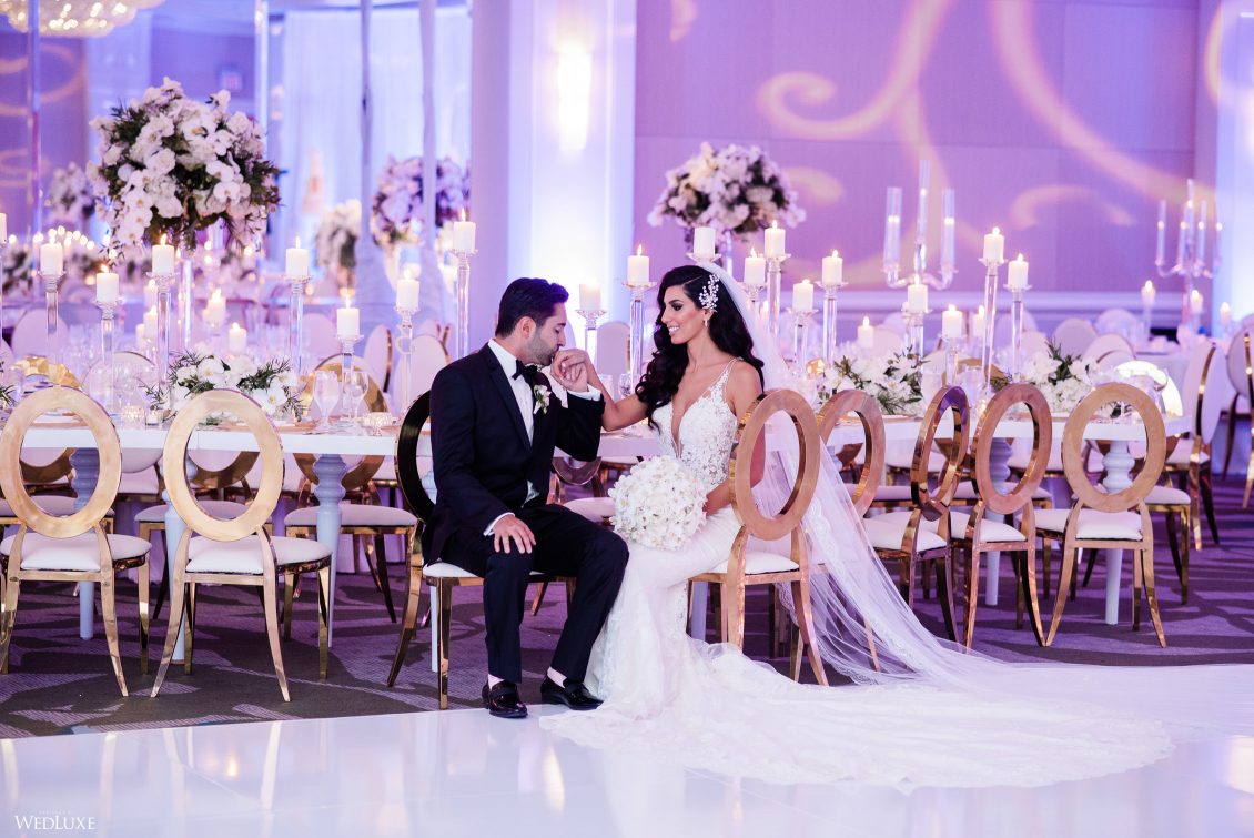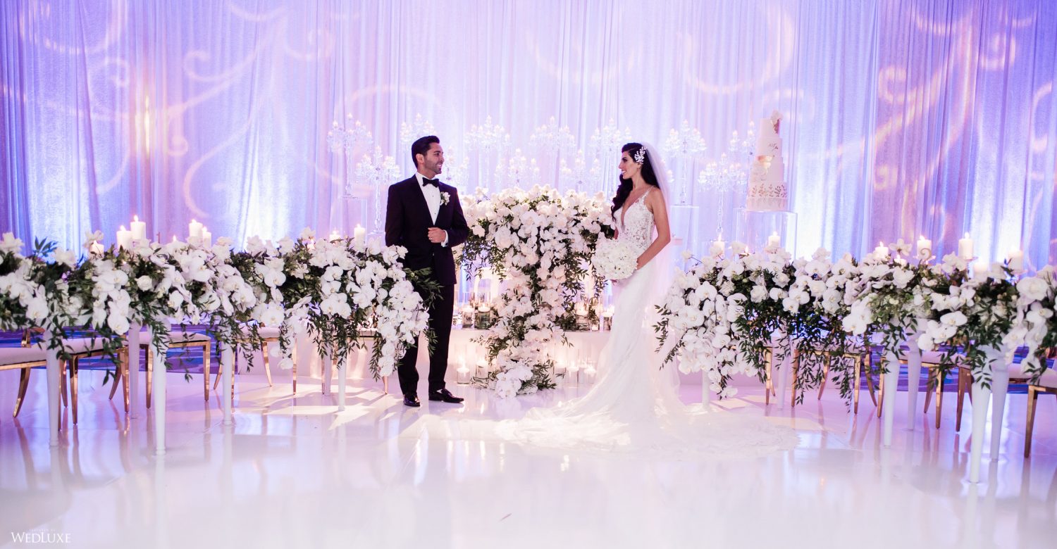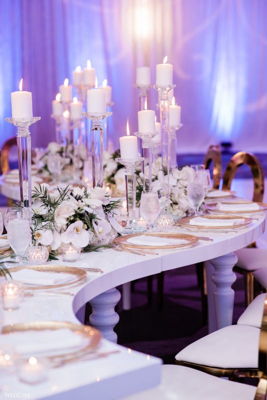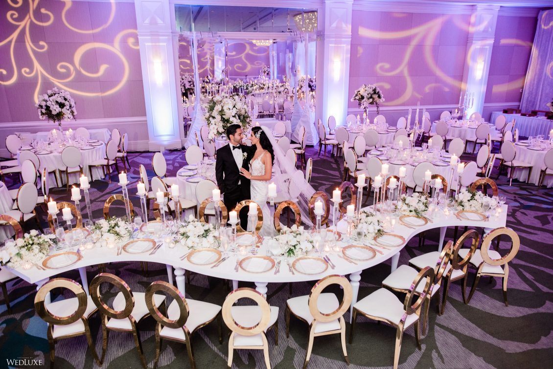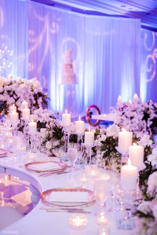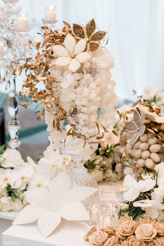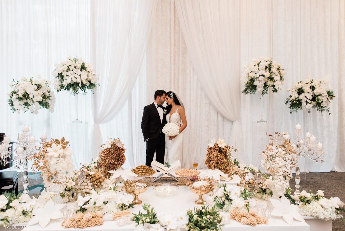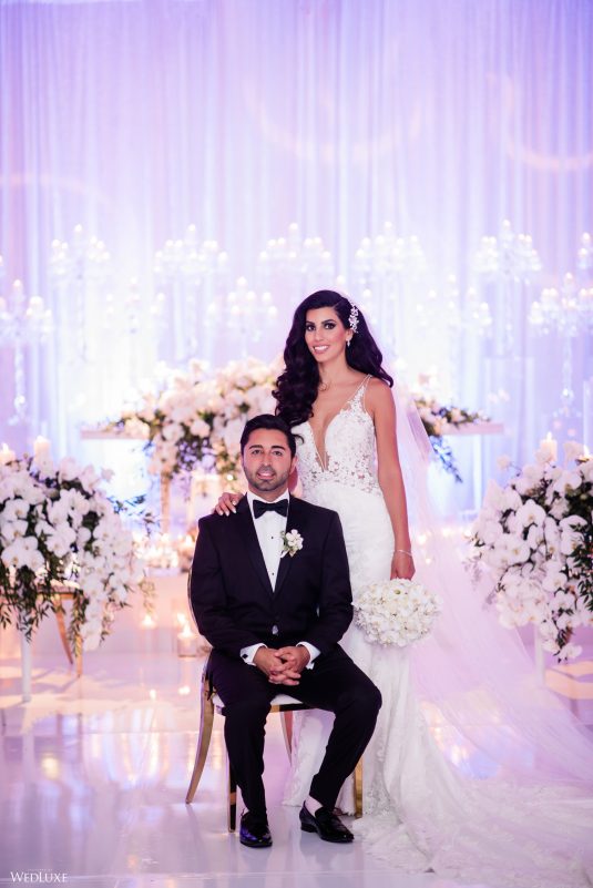 Now THIS is what we call dining by candlelight! Atoosa and Farham’s white wonderland wedding featured a traditional Persian Sofreh, 30-feet of ethereal draping, and a 16-ft custom stage for the couple’s head table. To further add to the ambience, Le Marais Décor supplied over 150 glistening crystal candlesticks for the occasion and twenty candelabras to create a magical aesthetic. “The glow of the sea of candles reflected through the entire venue, creating the perfect backdrop for the royal garden theme of the night,” recalls planner, Haleh Tafteh of Details by Haleh Luxury Event Planning and Sofreh Design.