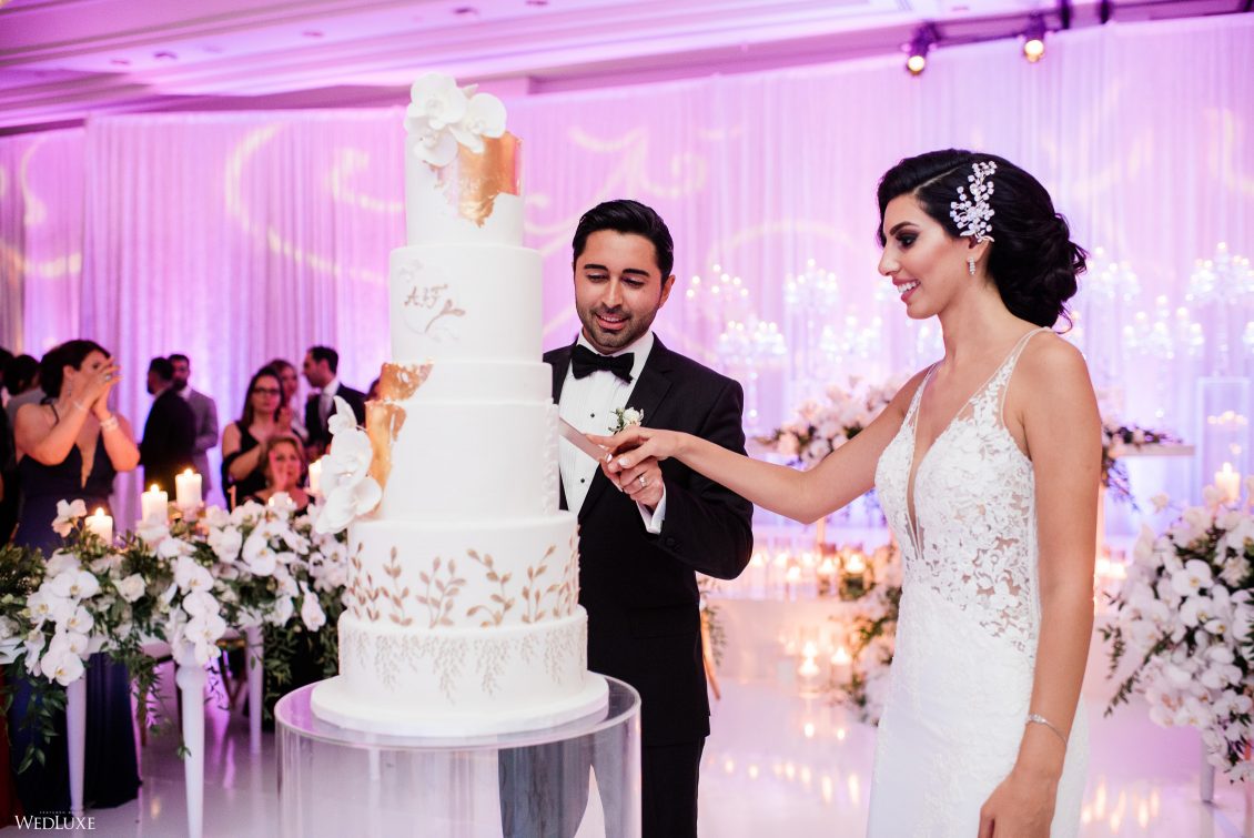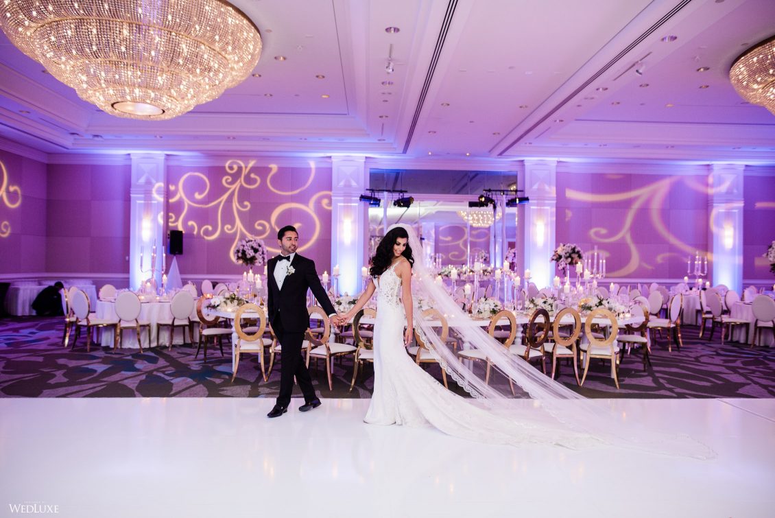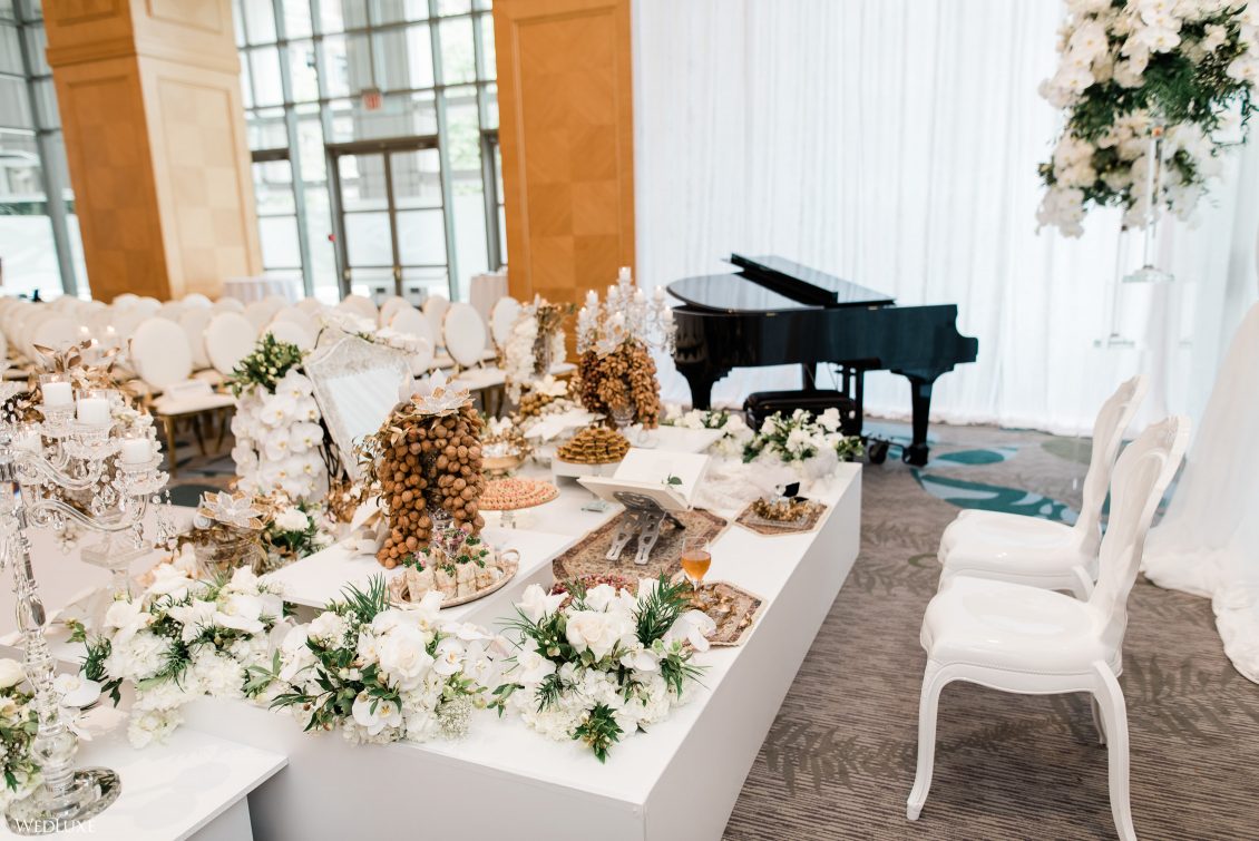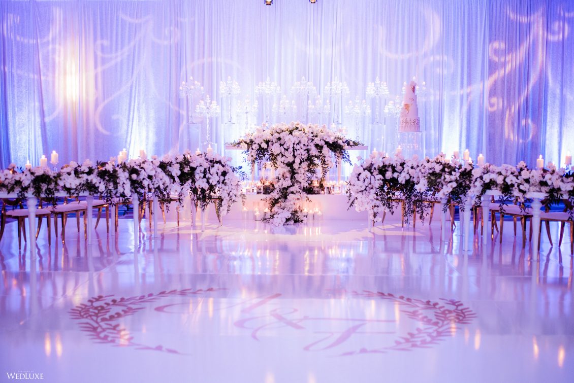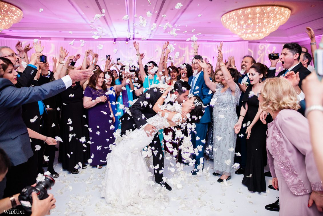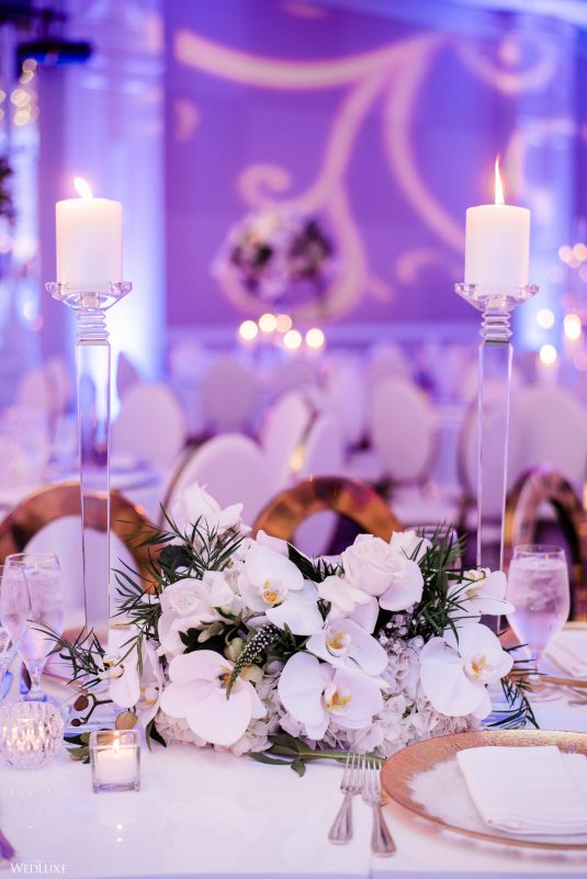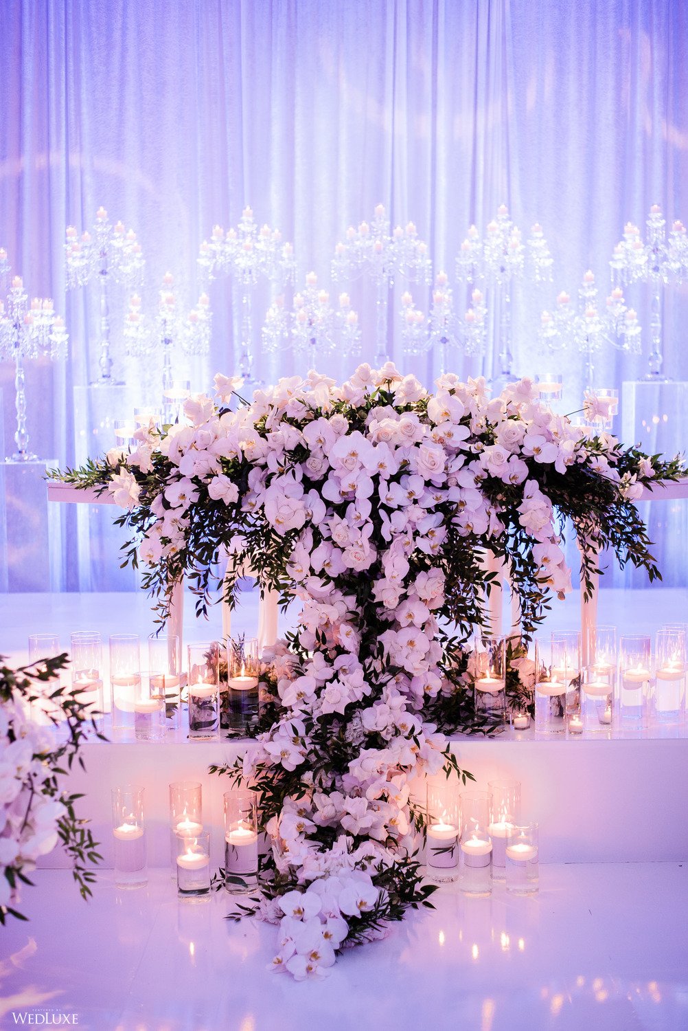 Now THIS is what we call dining by candlelight! Atoosa and Farham’s white wonderland wedding featured a traditional Persian Sofreh, 30-feet of ethereal draping, and a 16-ft custom stage for the couple’s head table. To further add to the ambience, Le Marais Décor supplied over 150 glistening crystal candlesticks for the occasion and twenty candelabras to create a magical aesthetic. “The glow of the sea of candles reflected through the entire venue, creating the perfect backdrop for the royal garden theme of the night,” recalls planner, Haleh Tafteh of Details by Haleh Luxury Event Planning and Sofreh Design.