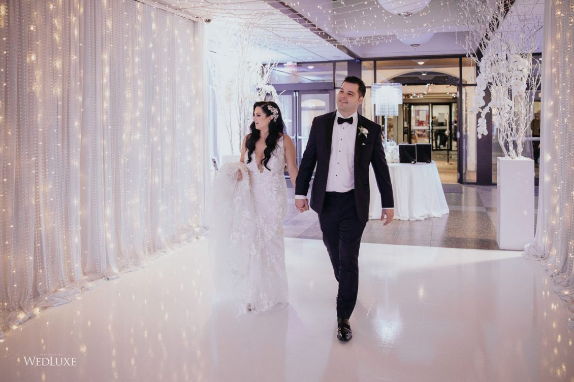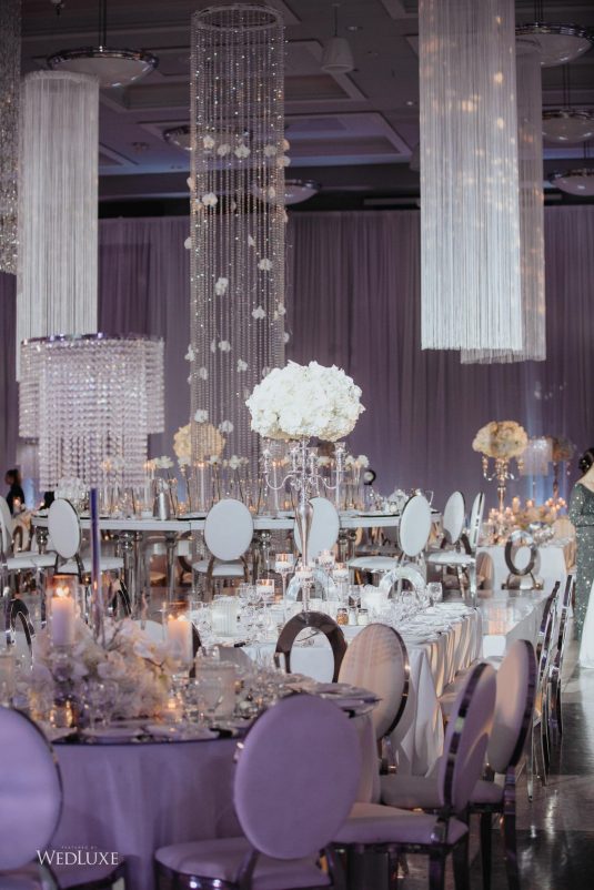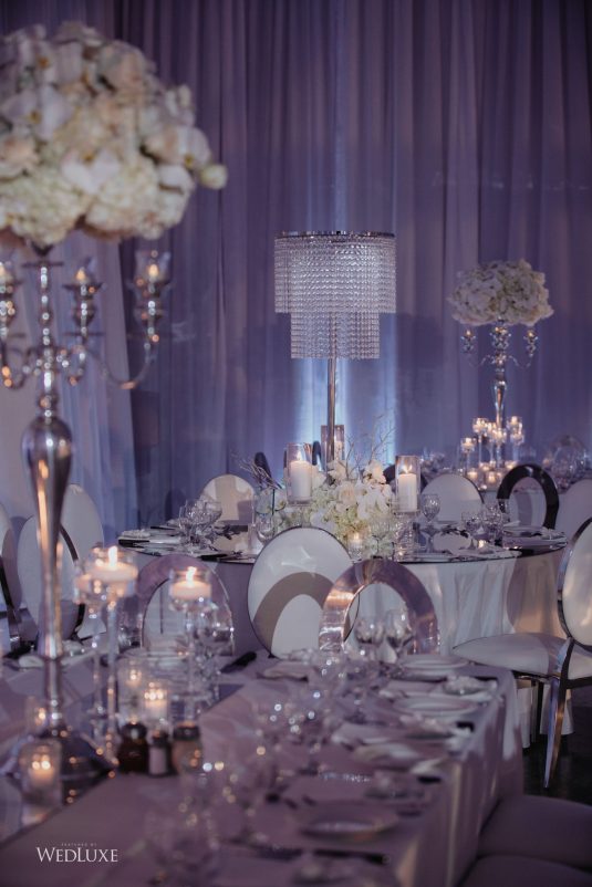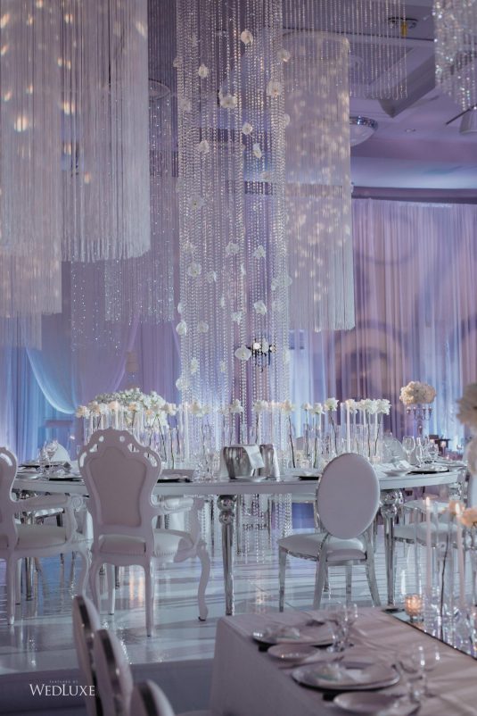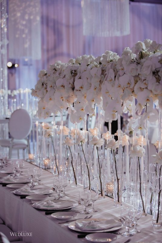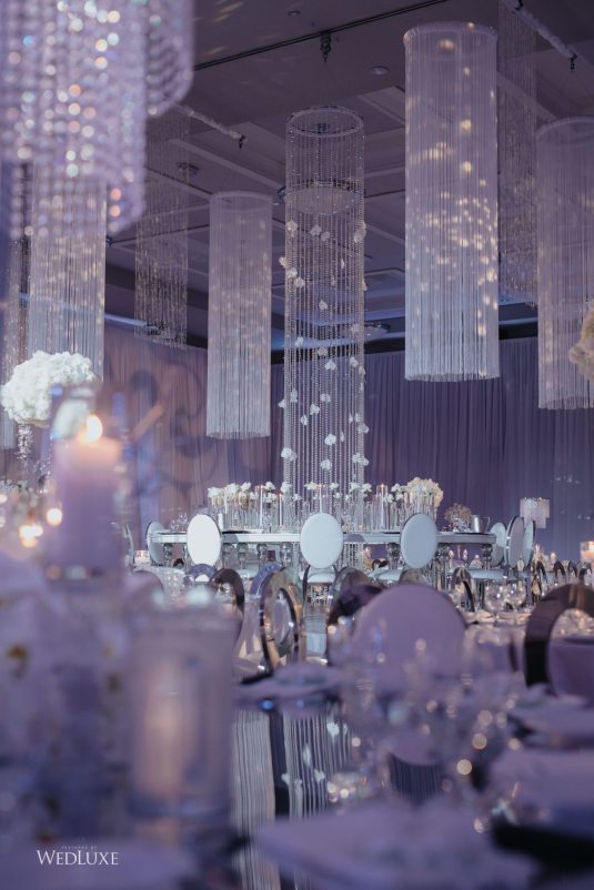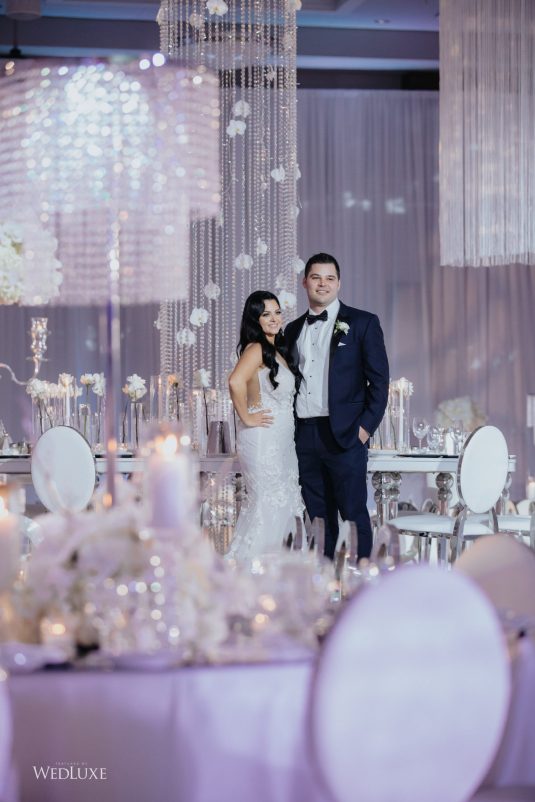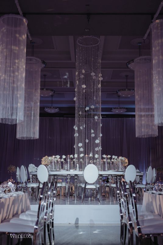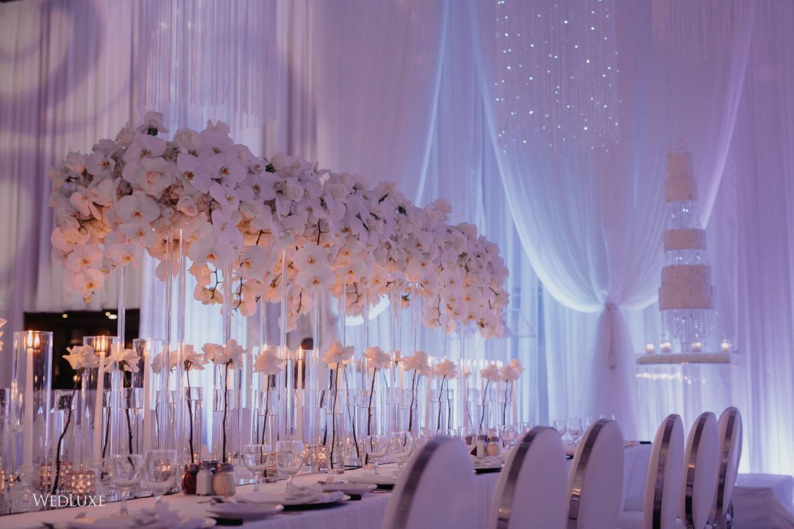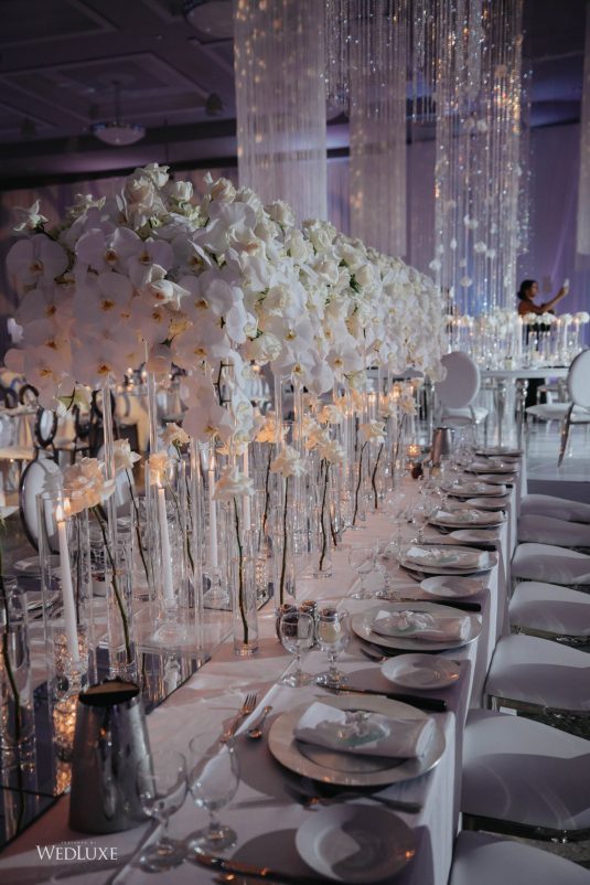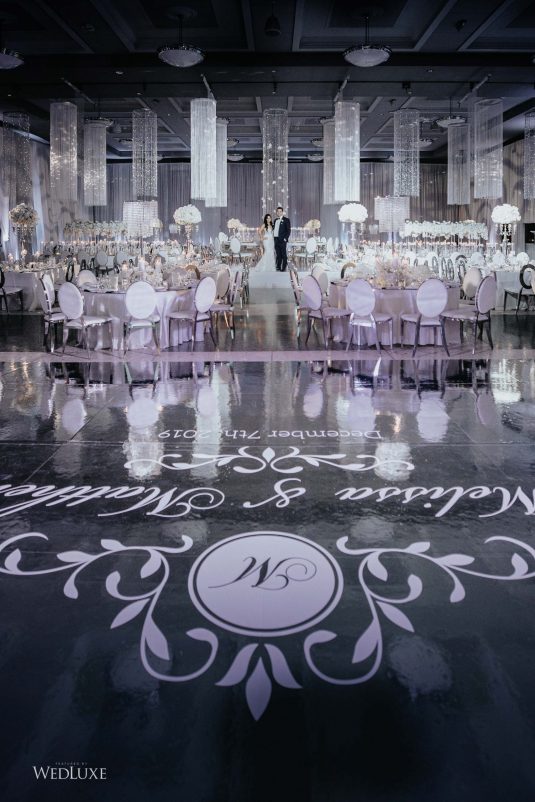 As seen in the Fall 2020 Vancouver Edition of WedLuxe Magazine, Melissa and Matthew had a winter wonderland extravaganza, highlighted by two 8-ft clouds of orchids and fourteen crystal hoops hanging from the ceiling! The newlyweds got to dine in luxury as one statement crystal and an orchid chandelier was placed in the centre of the circular head table. Surrounding the room hung 500 feet of romantic white draping from Debut Event Design, and swirling Gobo lights added a whimsical blizzard-like effect. A 24-ft chrome dance floor complimented the crystal theme.