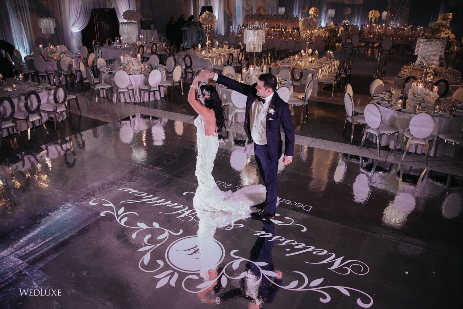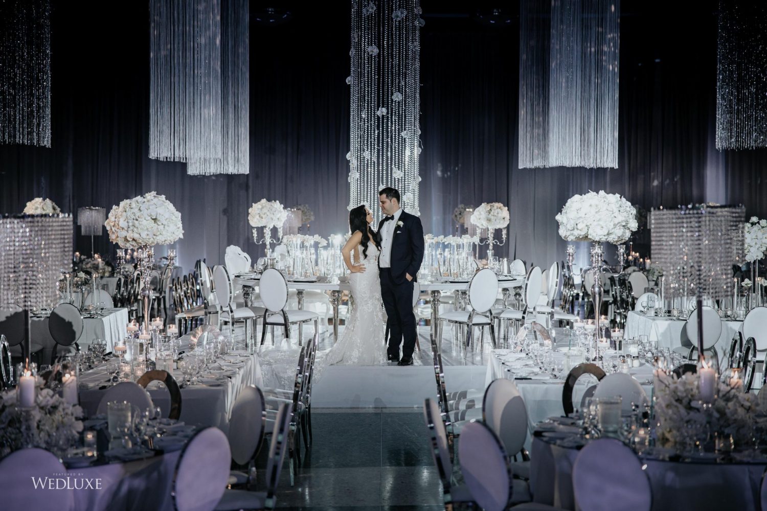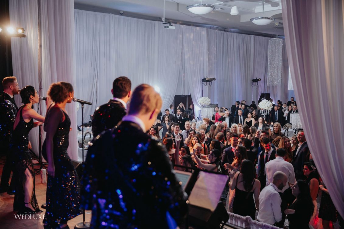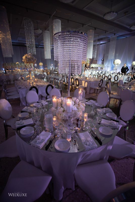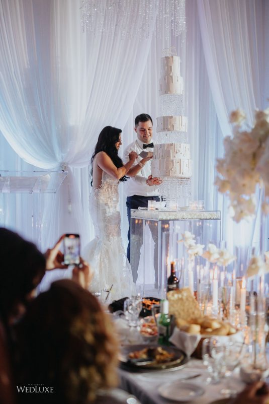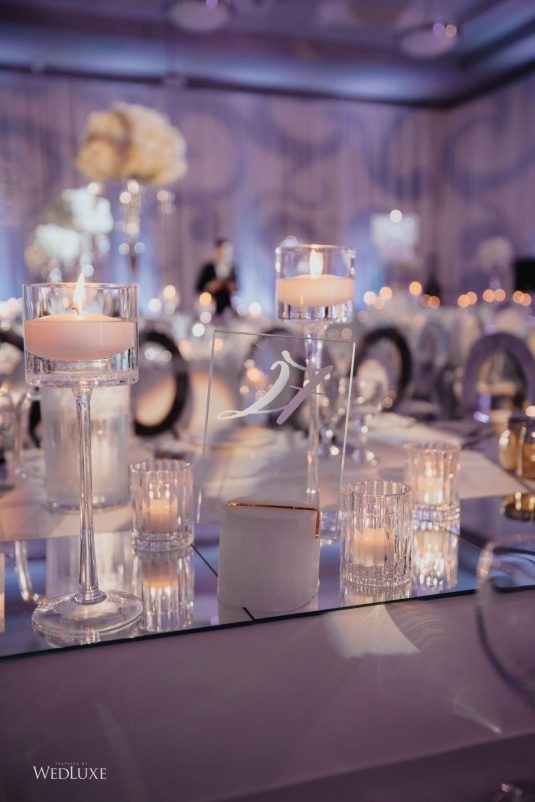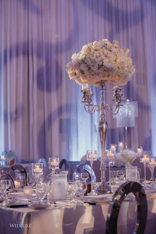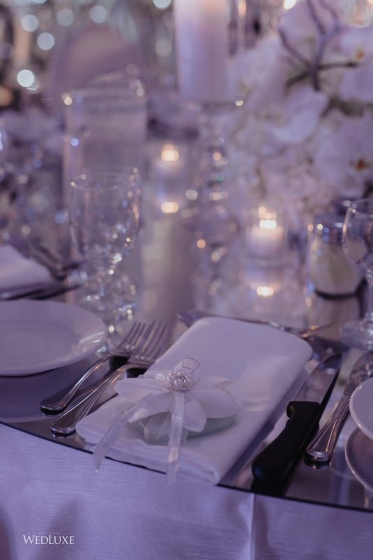As seen in the Fall 2020 Vancouver Edition of WedLuxe Magazine, Melissa and Matthew had a winter wonderland extravaganza, highlighted by two 8-ft clouds of orchids and fourteen crystal hoops hanging from the ceiling! The newlyweds got to dine in luxury as one statement crystal and an orchid chandelier was placed in the centre of the circular head table. Surrounding the room hung 500 feet of romantic white draping from Debut Event Design, and swirling Gobo lights added a whimsical blizzard-like effect. A 24-ft chrome dance floor complimented the crystal theme.