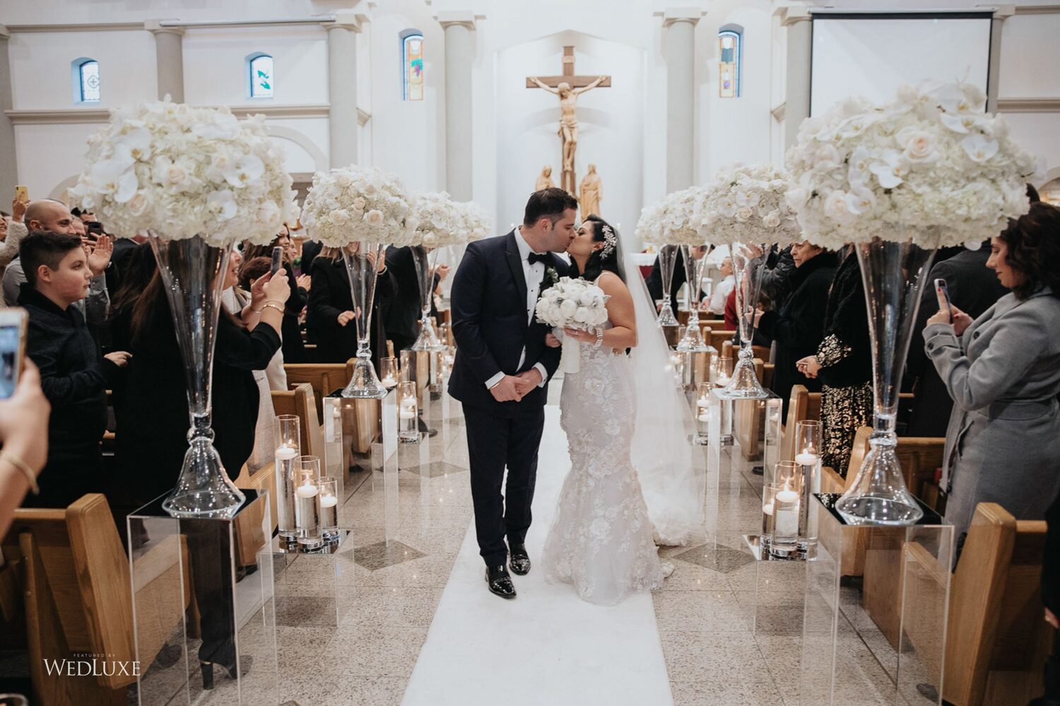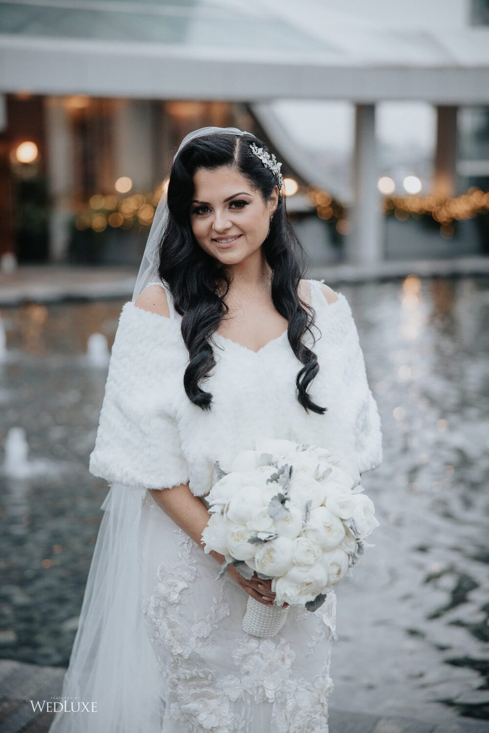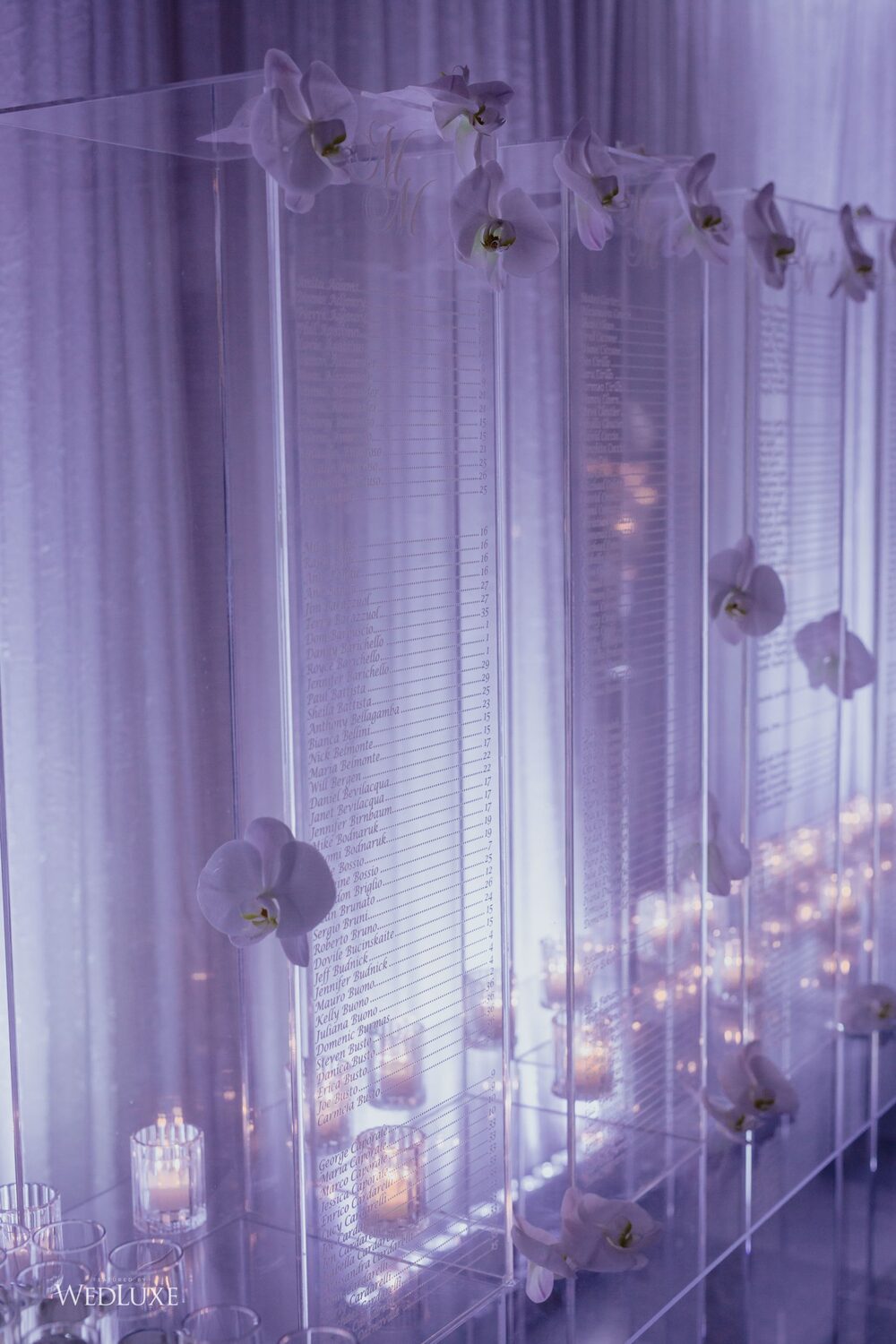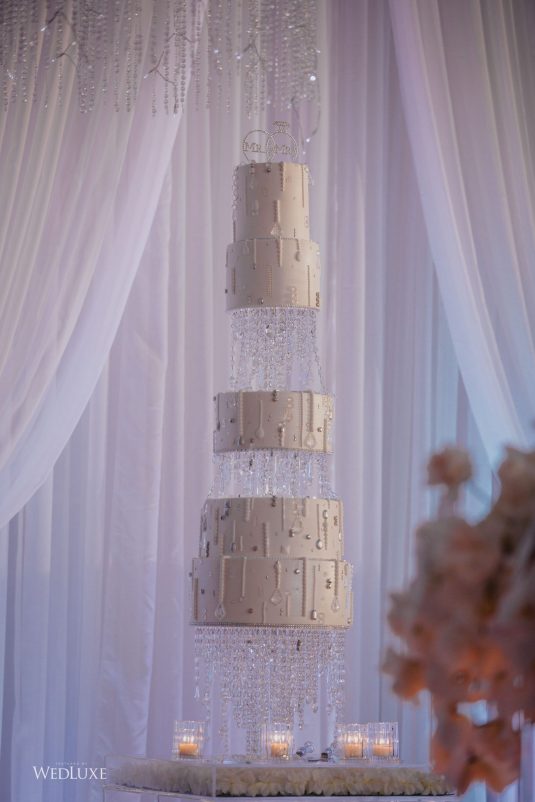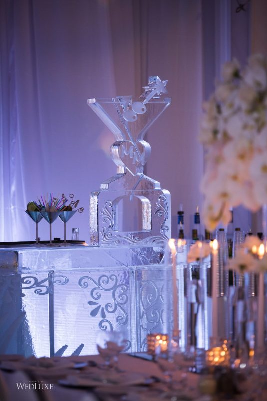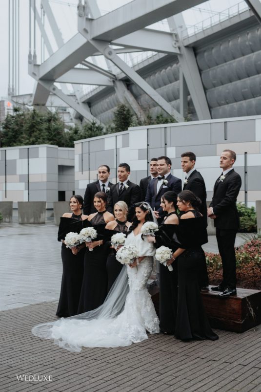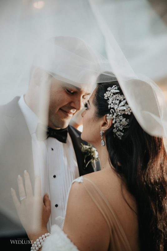As seen in the Fall 2020 Vancouver Edition of WedLuxe Magazine, Melissa and Matthew had a winter wonderland extravaganza, highlighted by two 8-ft clouds of orchids and fourteen crystal hoops hanging from the ceiling! The newlyweds got to dine in luxury as one statement crystal and an orchid chandelier was placed in the centre of the circular head table. Surrounding the room hung 500 feet of romantic white draping from Debut Event Design, and swirling Gobo lights added a whimsical blizzard-like effect. A 24-ft chrome dance floor complimented the crystal theme.