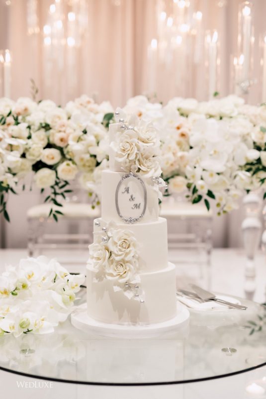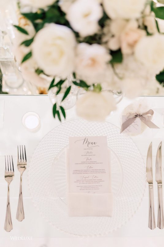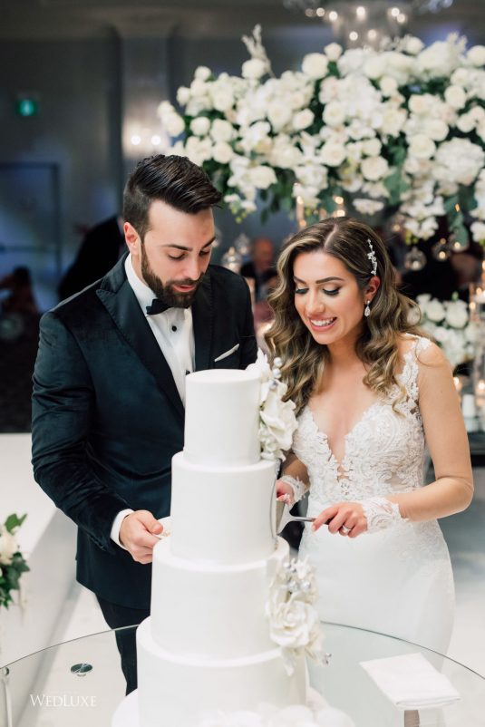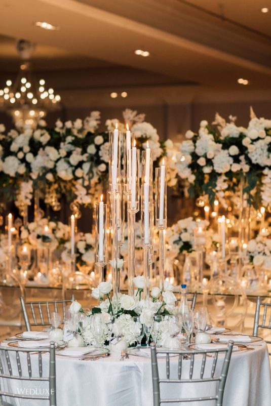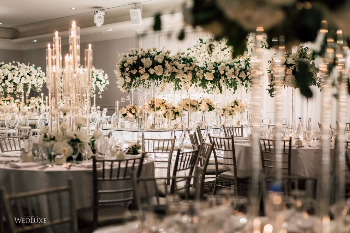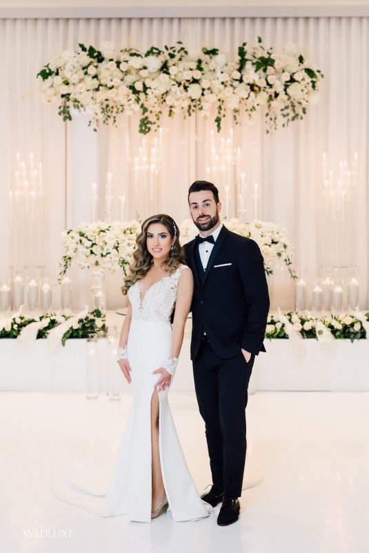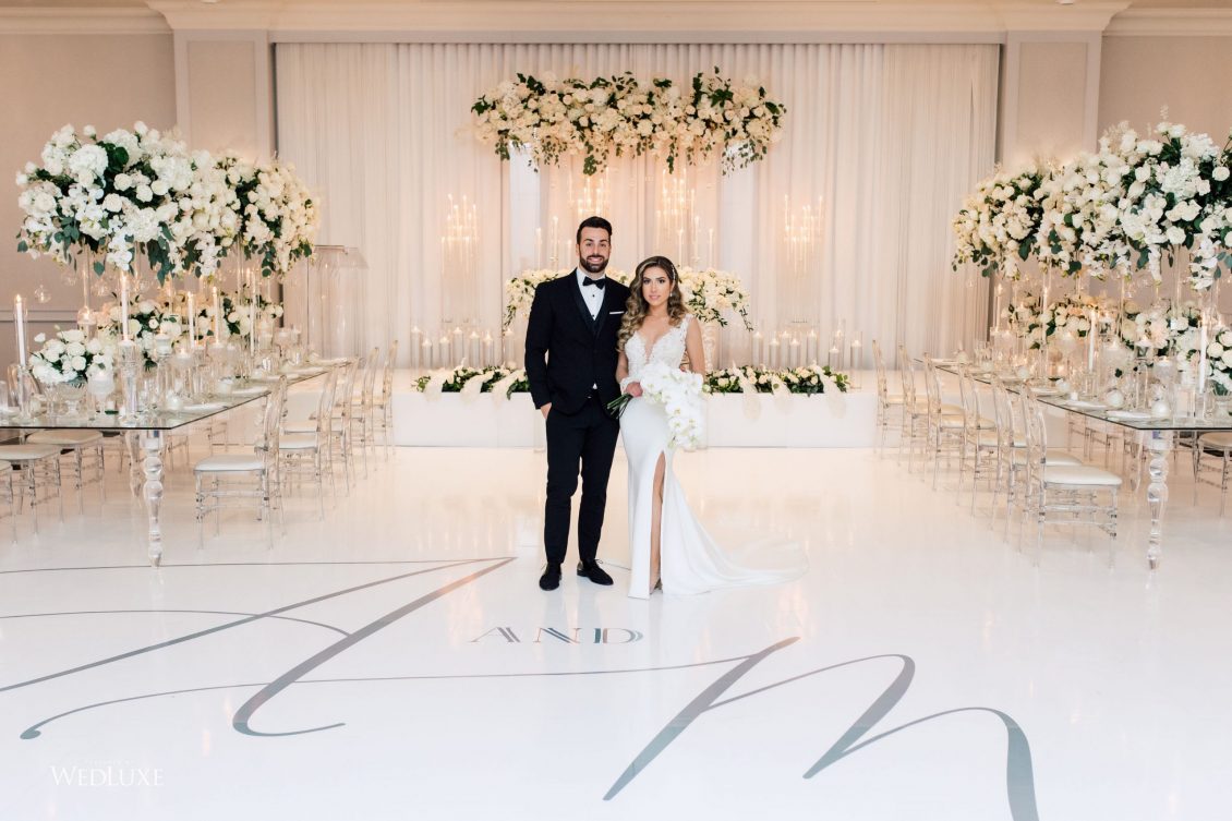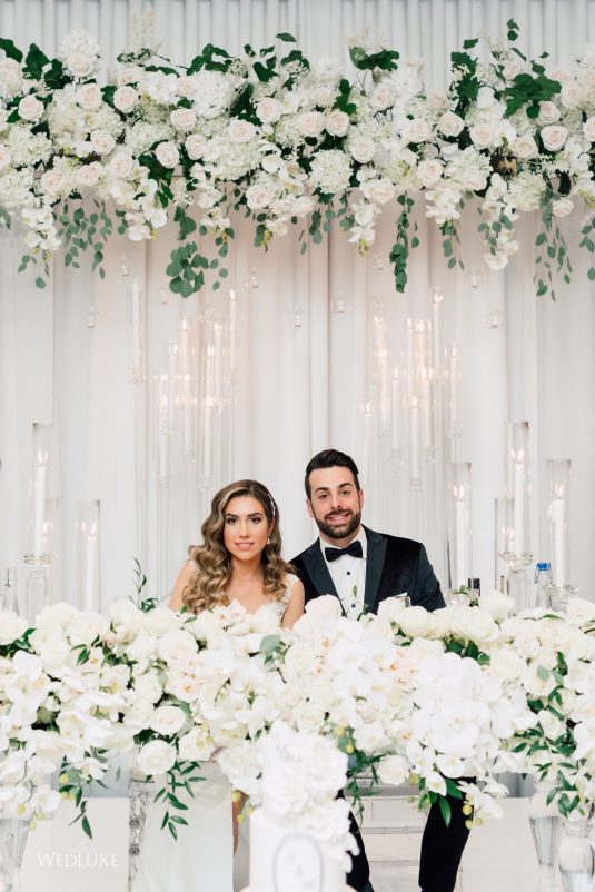 Now this is what we call classic whimsy! Amanda and Michael’s monochromatic wedding (as seen in the Fall 2020 Toronto Edition of WedLuxe) was planned entirely by the couple themselves. With the theme of winter elegance, the bride was very particular about her choices. “I was adamant that we have only white, silver, and acrylic decor,” Amanda recalls. With the cool-toned florals and rentals, the bride and groom’s venue was transformed into an exquisitely modern winter palace, warmed only by the sleek taper candles and their loving friends and family.