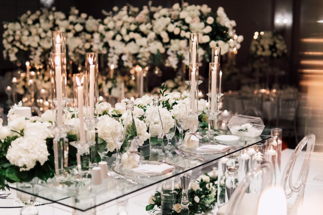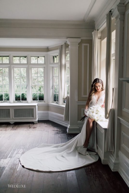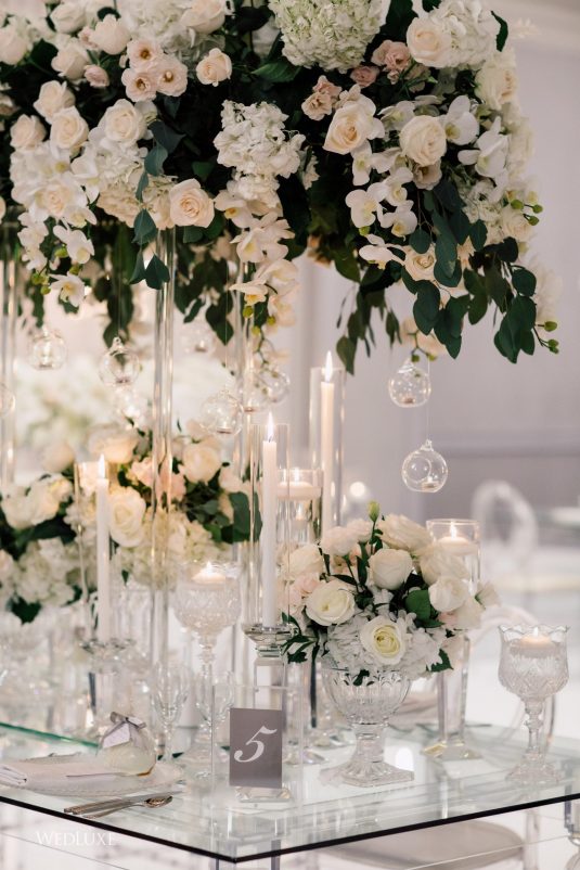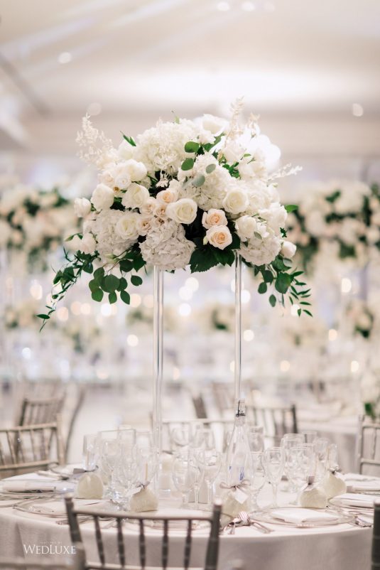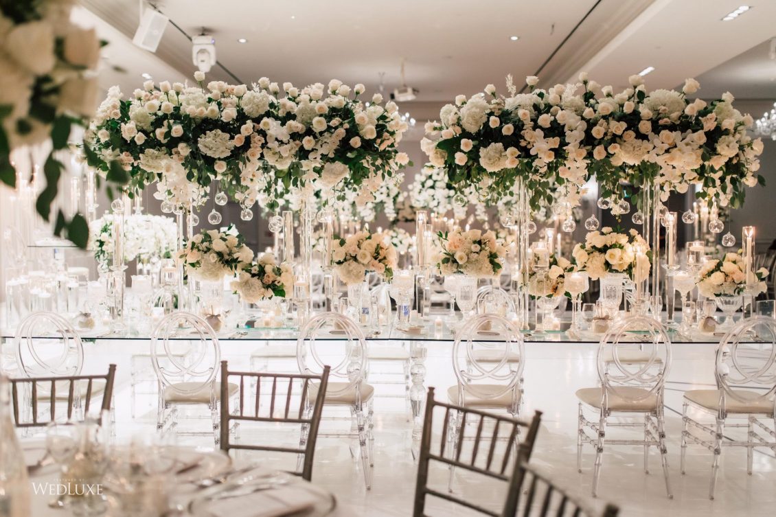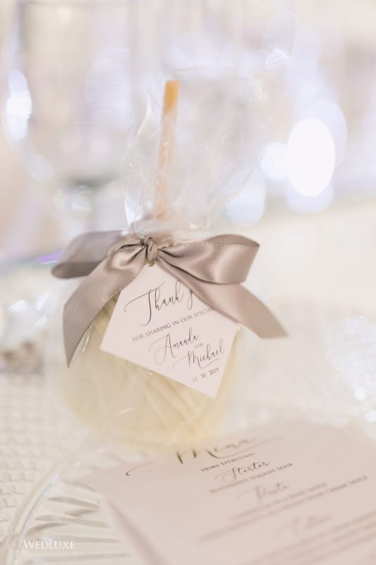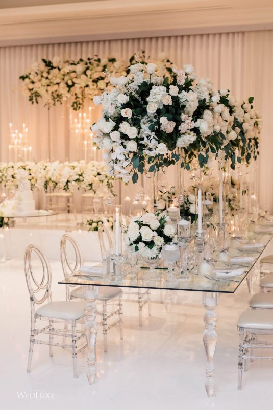 Now this is what we call classic whimsy! Amanda and Michael’s monochromatic wedding (as seen in the Fall 2020 Toronto Edition of WedLuxe) was planned entirely by the couple themselves. With the theme of winter elegance, the bride was very particular about her choices. “I was adamant that we have only white, silver, and acrylic decor,” Amanda recalls. With the cool-toned florals and rentals, the bride and groom’s venue was transformed into an exquisitely modern winter palace, warmed only by the sleek taper candles and their loving friends and family.