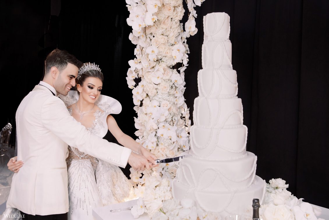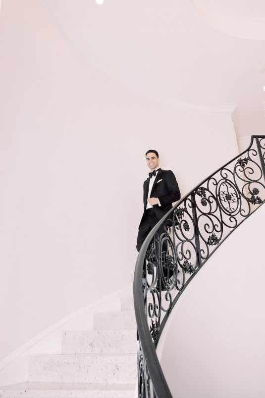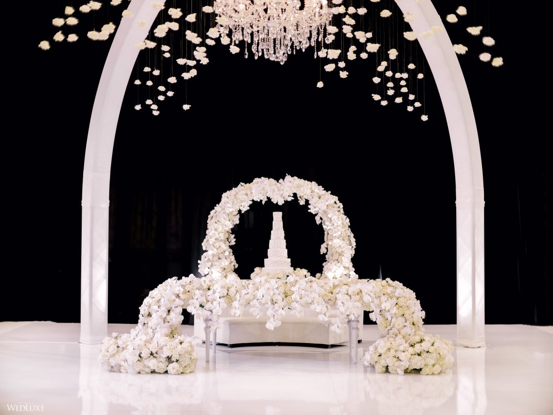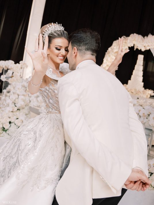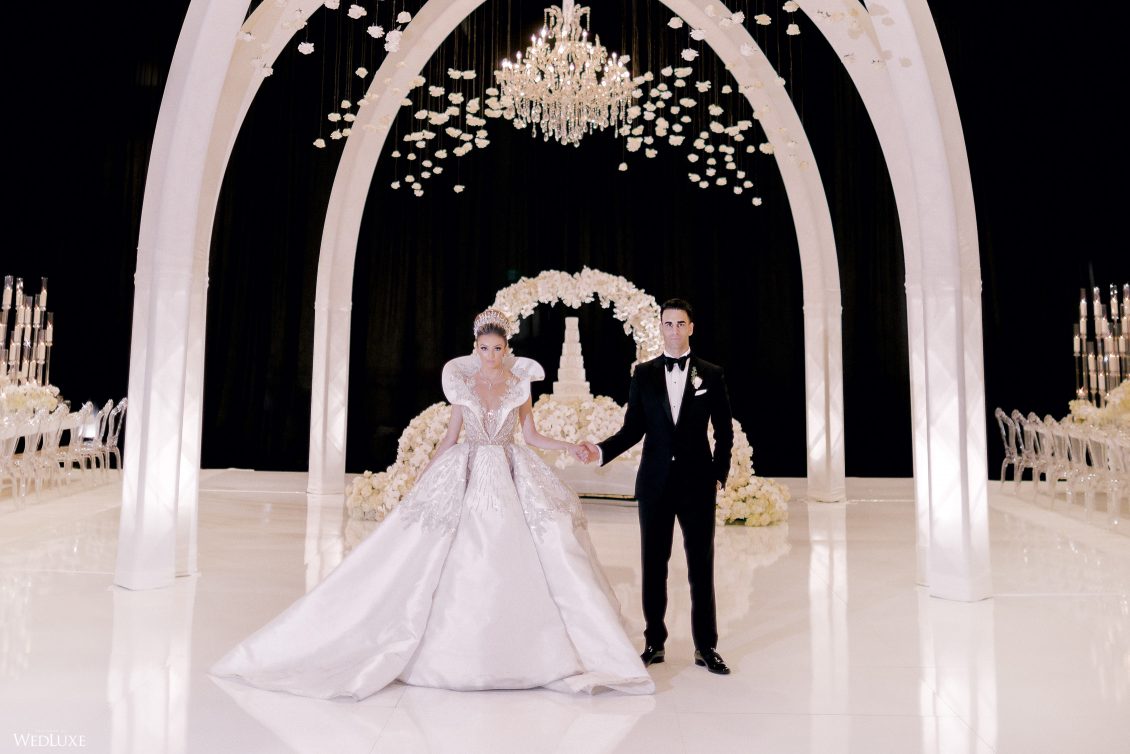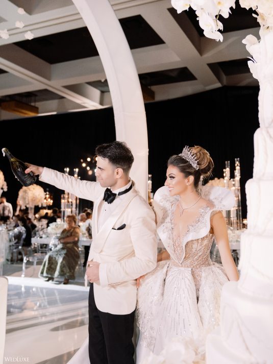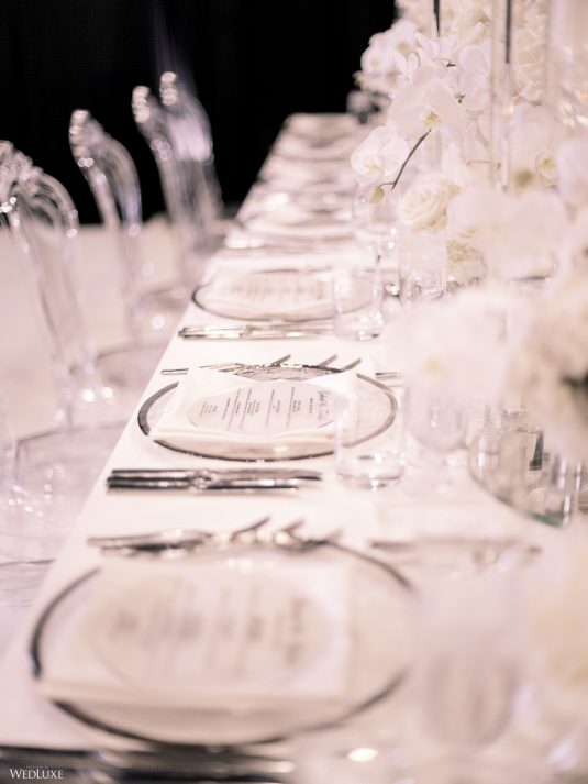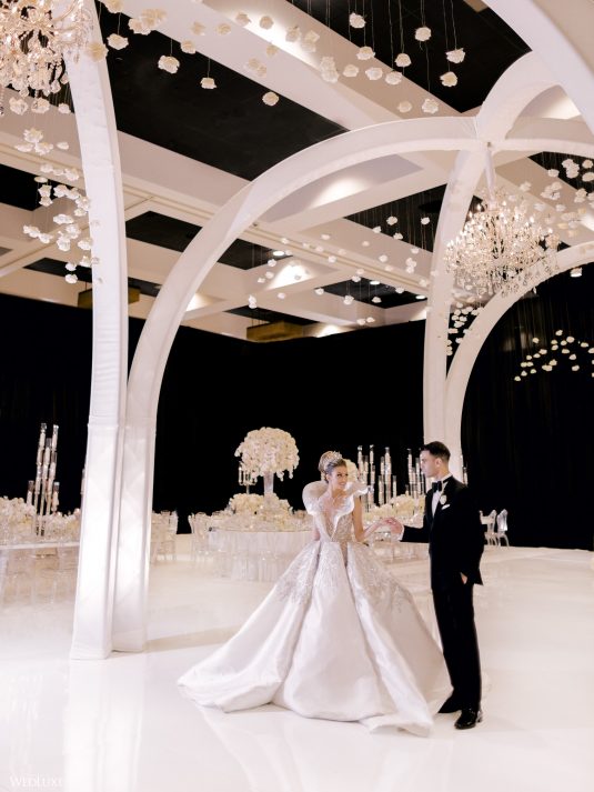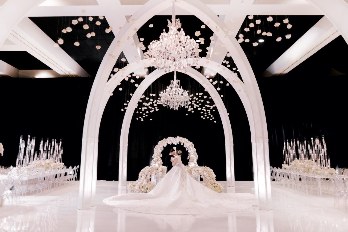 Get ready to be WOWED! Gabriel and Tabitha’s wedding was a true testament to their ‘Architecture meets Design theme.’ First-things-first, let’s discuss Tabitha’s OUTSTANDING styling. Her gown… OMG!!!! This statement-loving couple wanted an elegant and timeless aesthetic and went with an all-white ultra-modern black and white reception design. The pièce de résistance – large scale white arches encircling the room, framing the tables, and creating a truly dramatic layout!