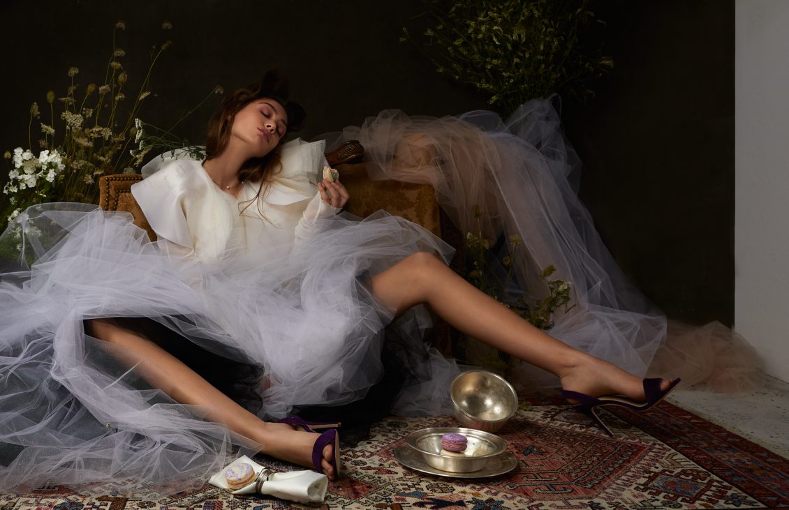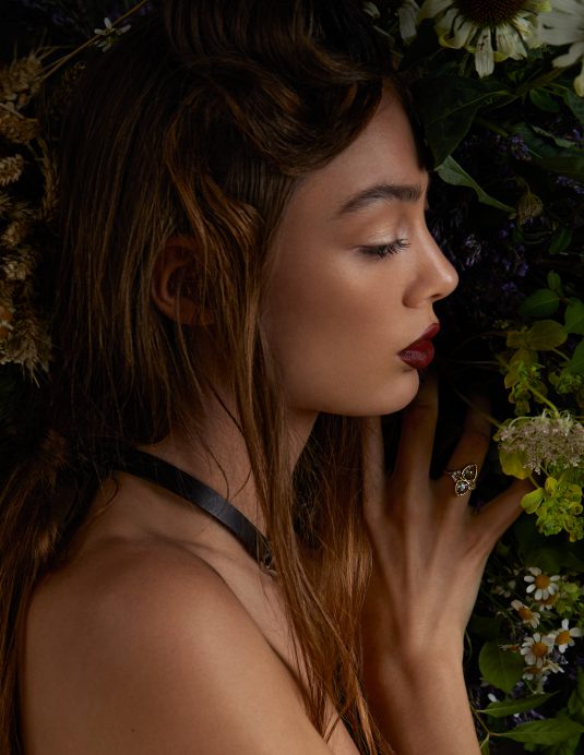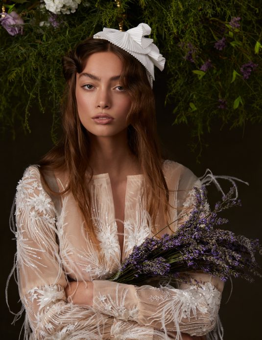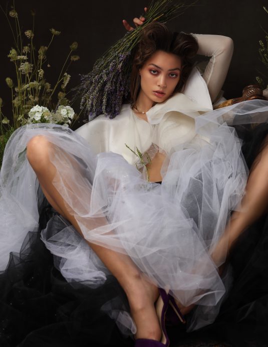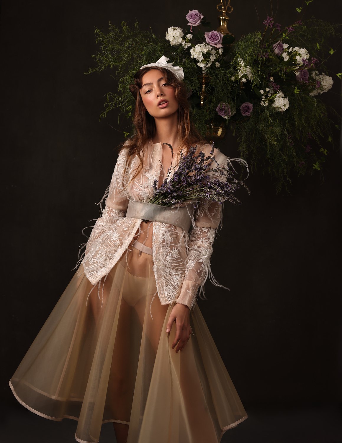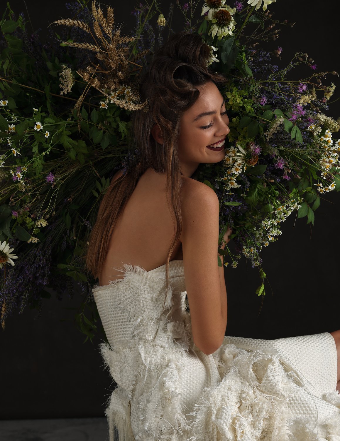 We specifically selected contemporary silhouettes to contrast the dreamlike state of romance and whimsy. To achieve these looks we sourced garments from Canadian fashion-forward wedding designers such as Brosche Bridal, Lesley Hampton, Serge Jevagine, and Israella Kobla. Our vision was to show a beautiful bride sinking in a field of lavenders. The editorial is named lavender dreams based on the many legends associated with lavender and love. According to Ancient Egyptian folklore, it is said Cleopatra used lavender to seduce both Julius Caesar and Mark Antony. In European mythology, alpine girls would put lavender in tea to help bring visions of their ‘true love’, and place lavender under a lover’s pillow to foster romantic dreams. Today lavender can be found in our daily beauty routines. We wanted to showcase not only the beautiful field flower (within the props and set décor), but also convey the euphoric feelings of happiness, luxury, and love, in our images. We added a hefty dose of field flowers and lavender sourced from Ontario farms.