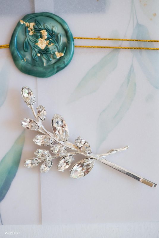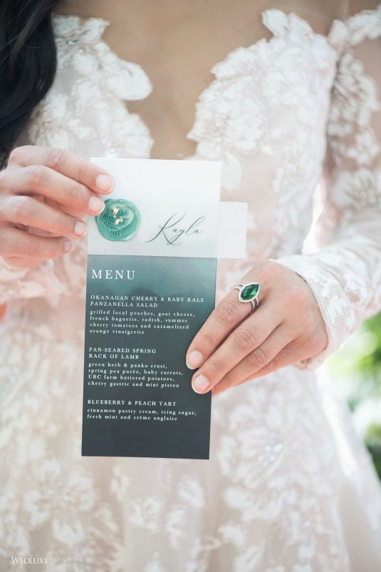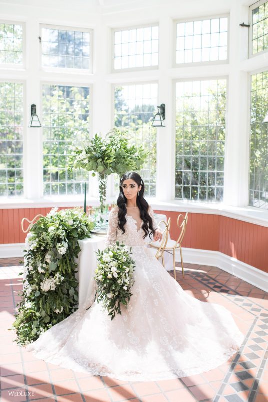 Emerald green, one of our all-time fav jewel-tone winter colors inspired this shoot. Set in a beautiful solarium, with garden vibes, we love how various shades of emerald are woven into the tablescape, flowers, stationery, and jewelry.
