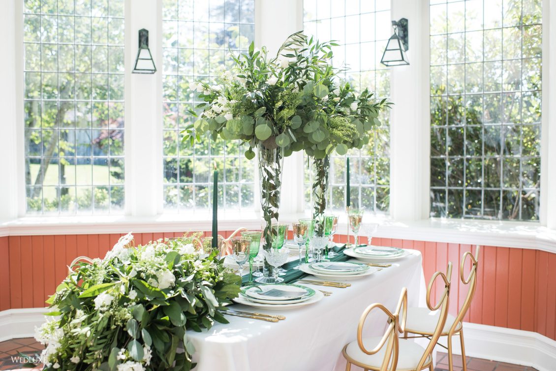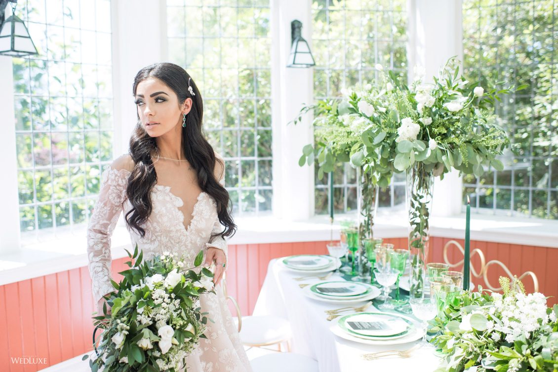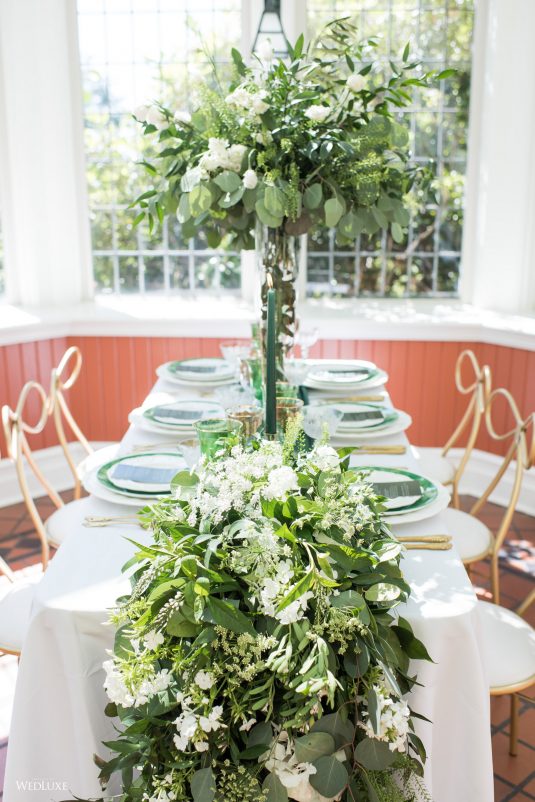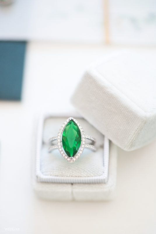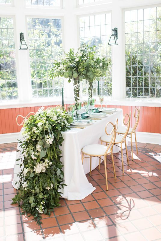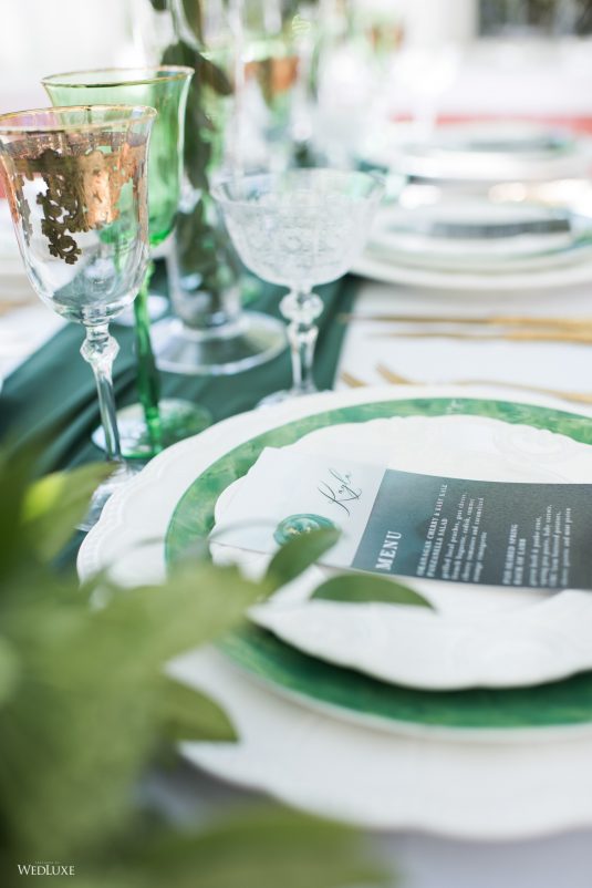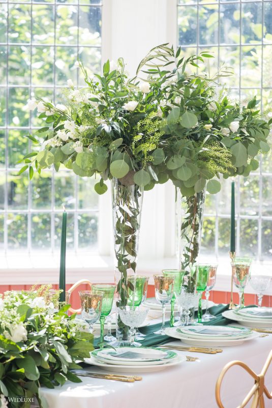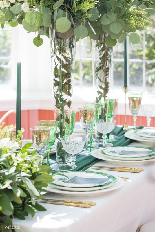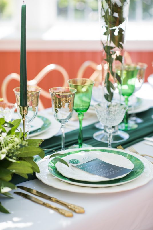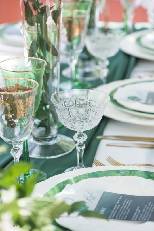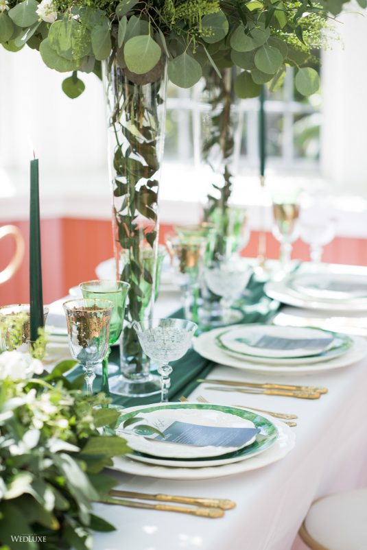 Emerald is a lovely color that can be carried into any season. We created this shoot with a lively garden feel in mind. The beautiful solarium with cascading florals bring the outdoors in, and every detail in between had emerald accents woven throughout.