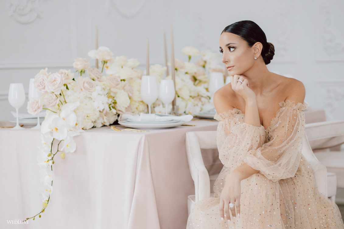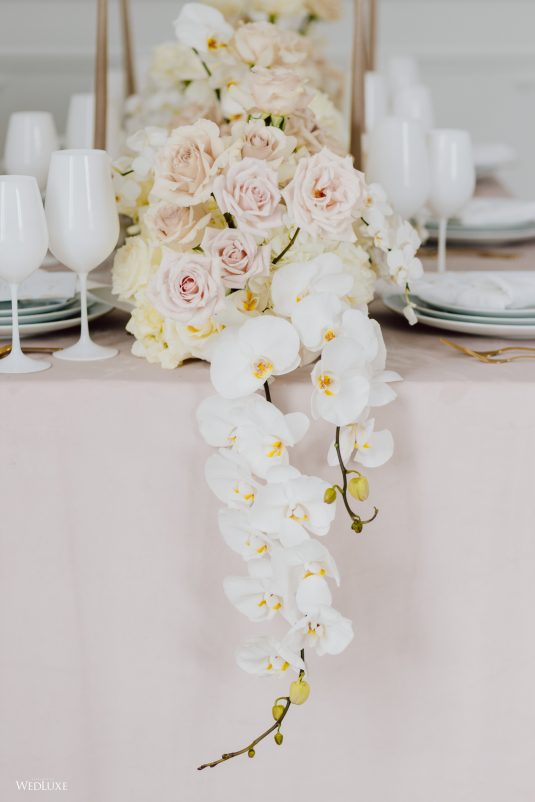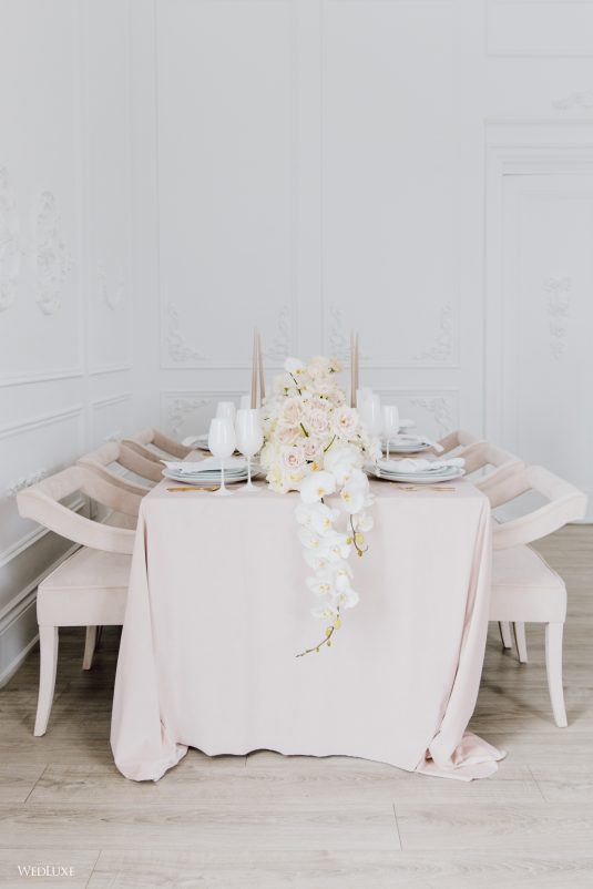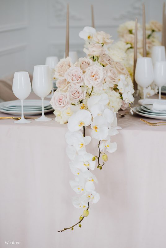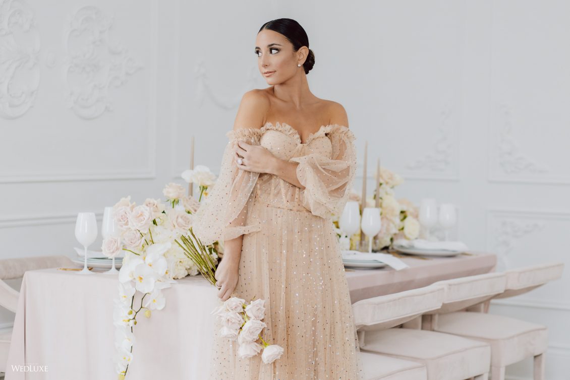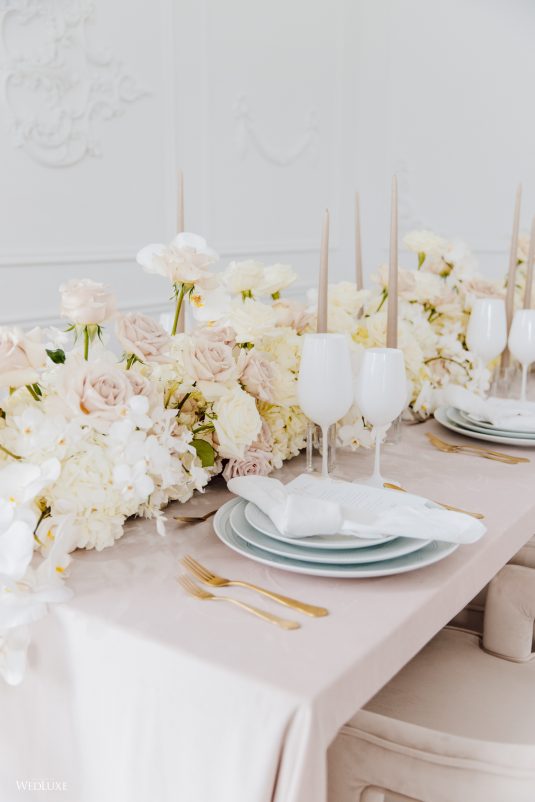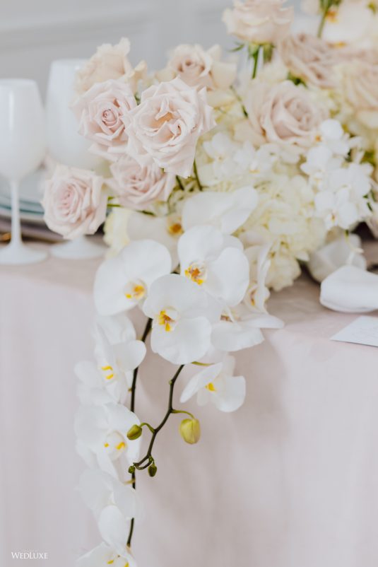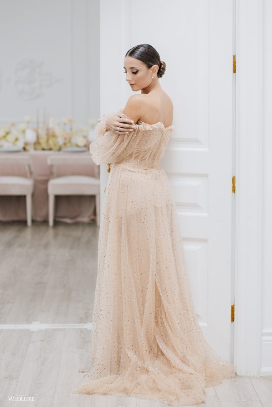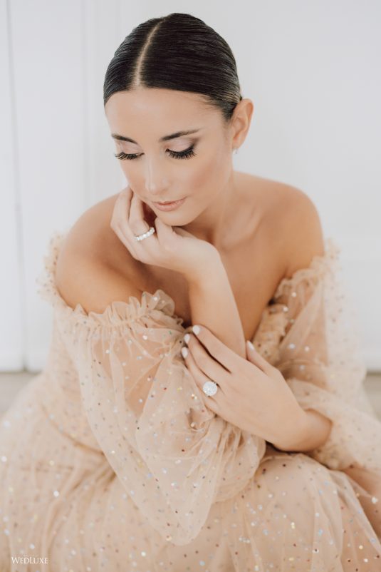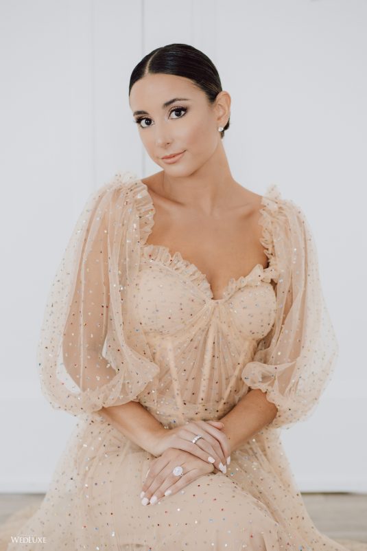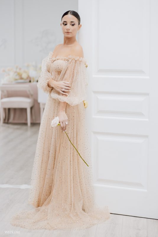 We love everything about this beautifully blush-hued styled shoot but we’re definitely smitten with balloon-sleeves so we are LOVING the model’s gorgeous corseted gown by Gemy Maalouf!