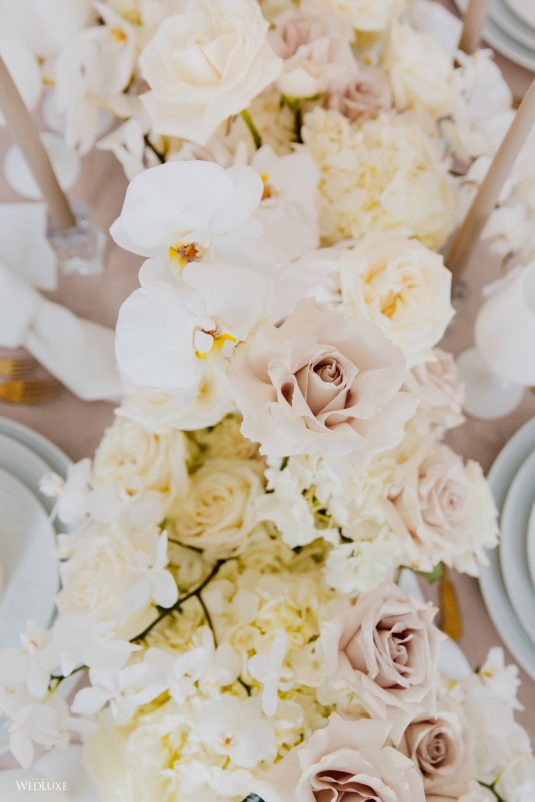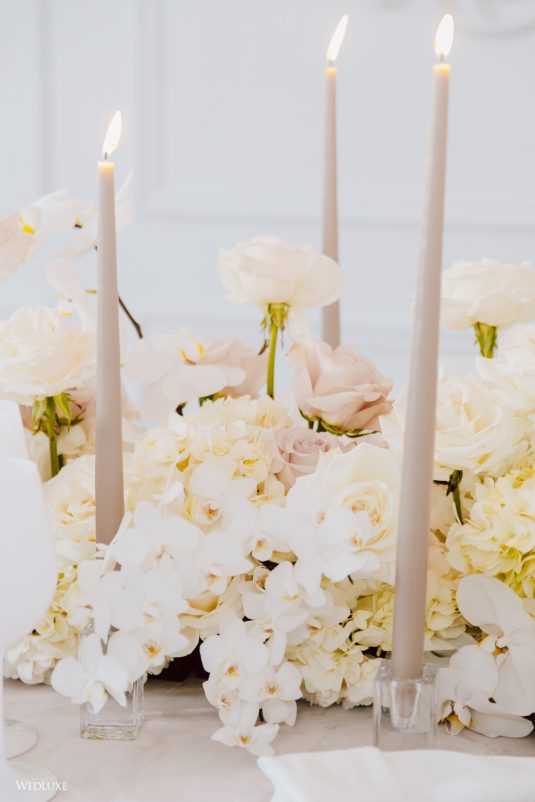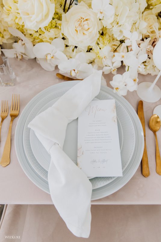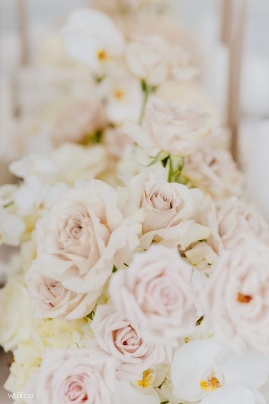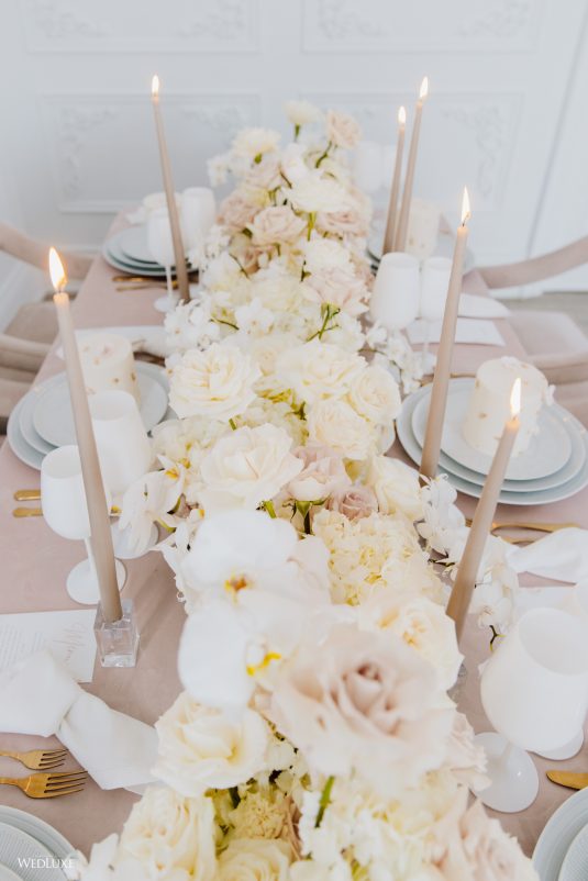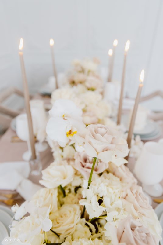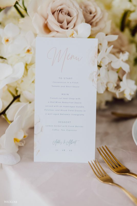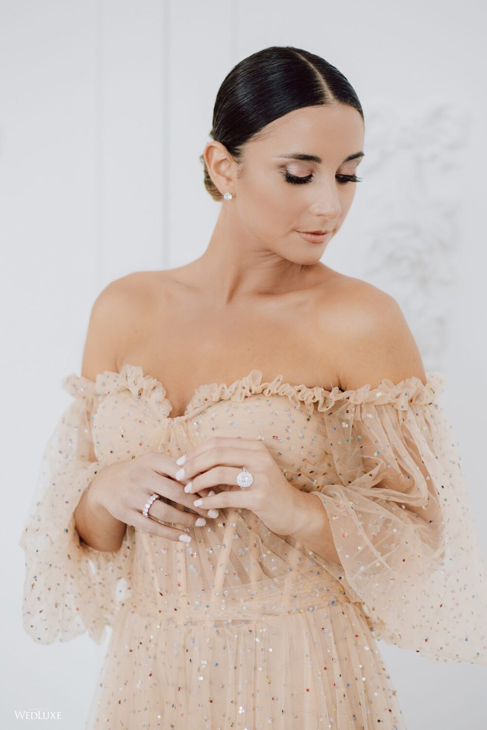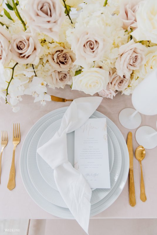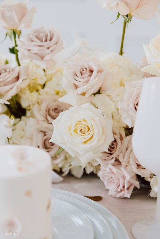 We love everything about this beautifully blush-hued styled shoot but we’re definitely smitten with balloon-sleeves so we are LOVING the model’s gorgeous corseted gown by Gemy Maalouf!