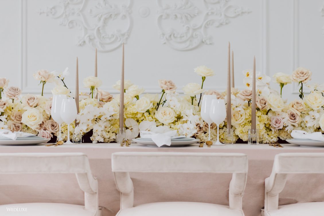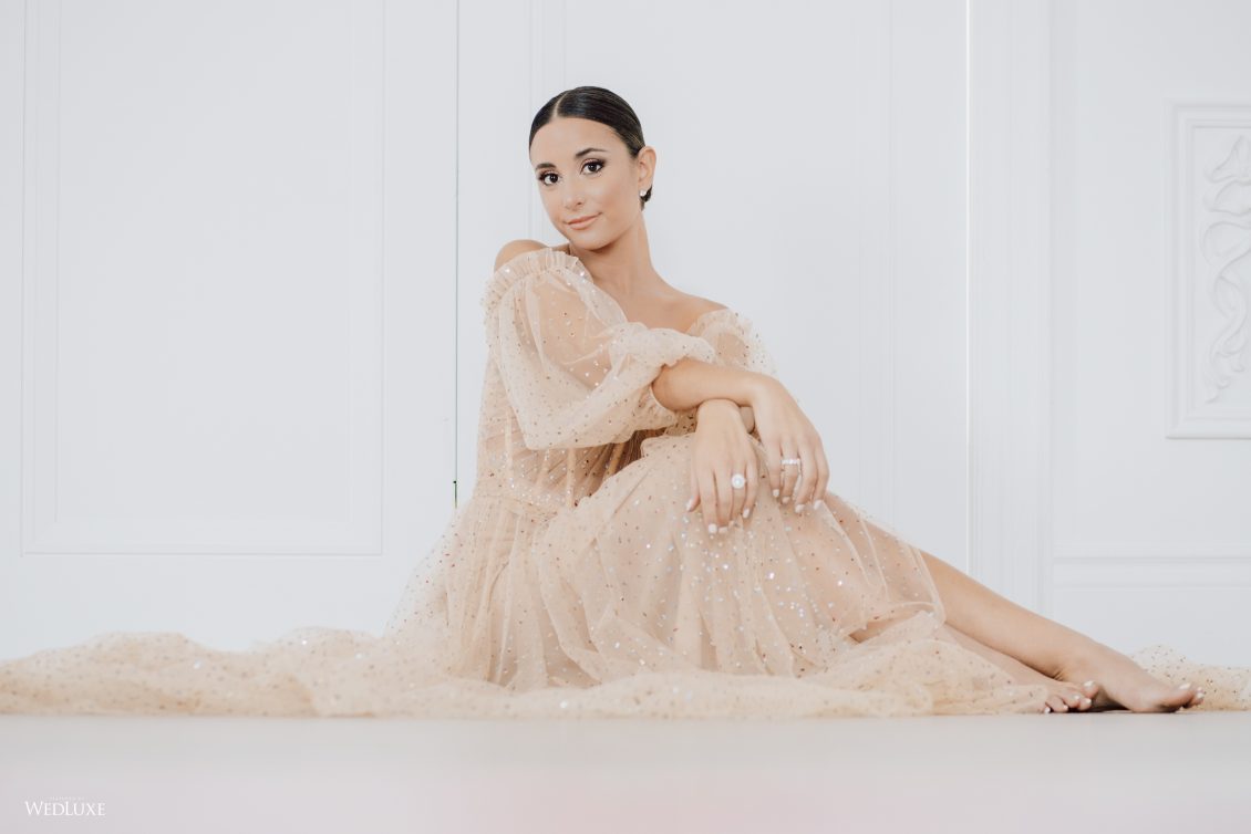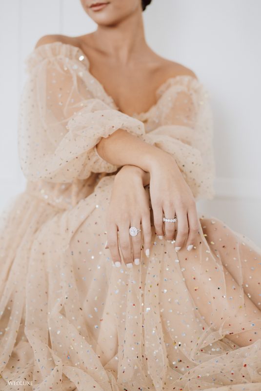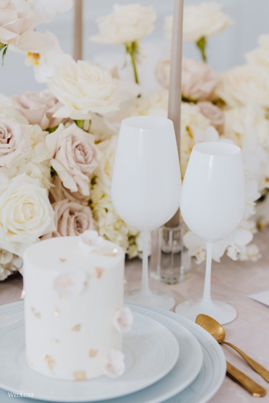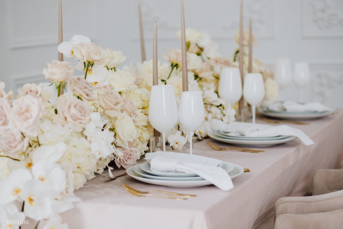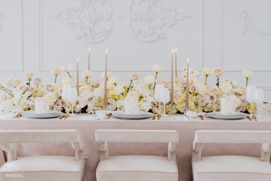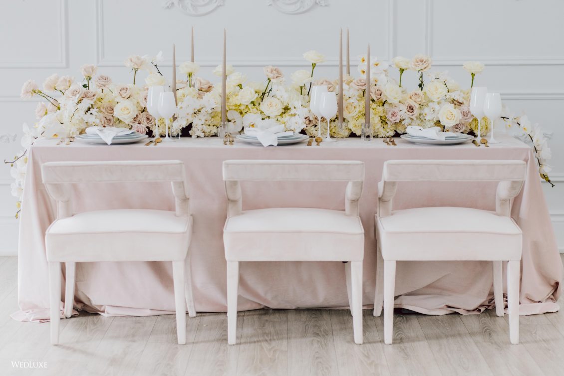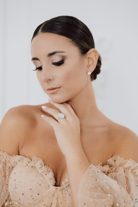 We love everything about this beautifully blush-hued styled shoot but we’re definitely smitten with balloon-sleeves so we are LOVING the model’s gorgeous corseted gown by Gemy Maalouf!