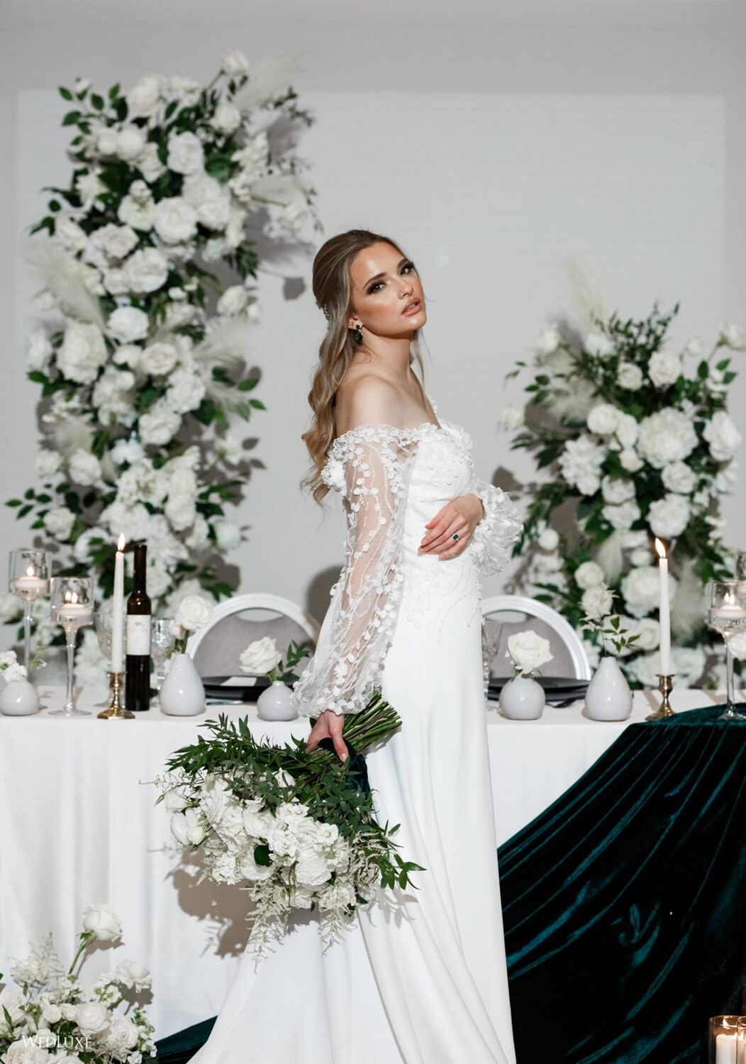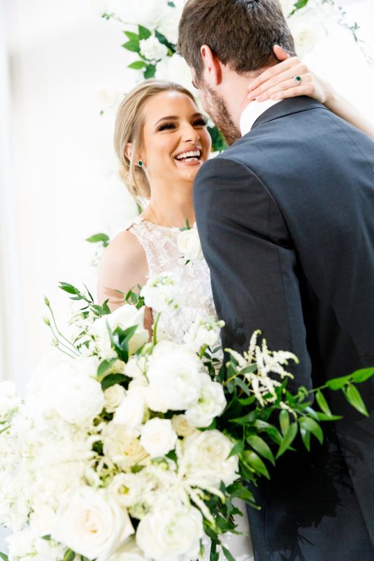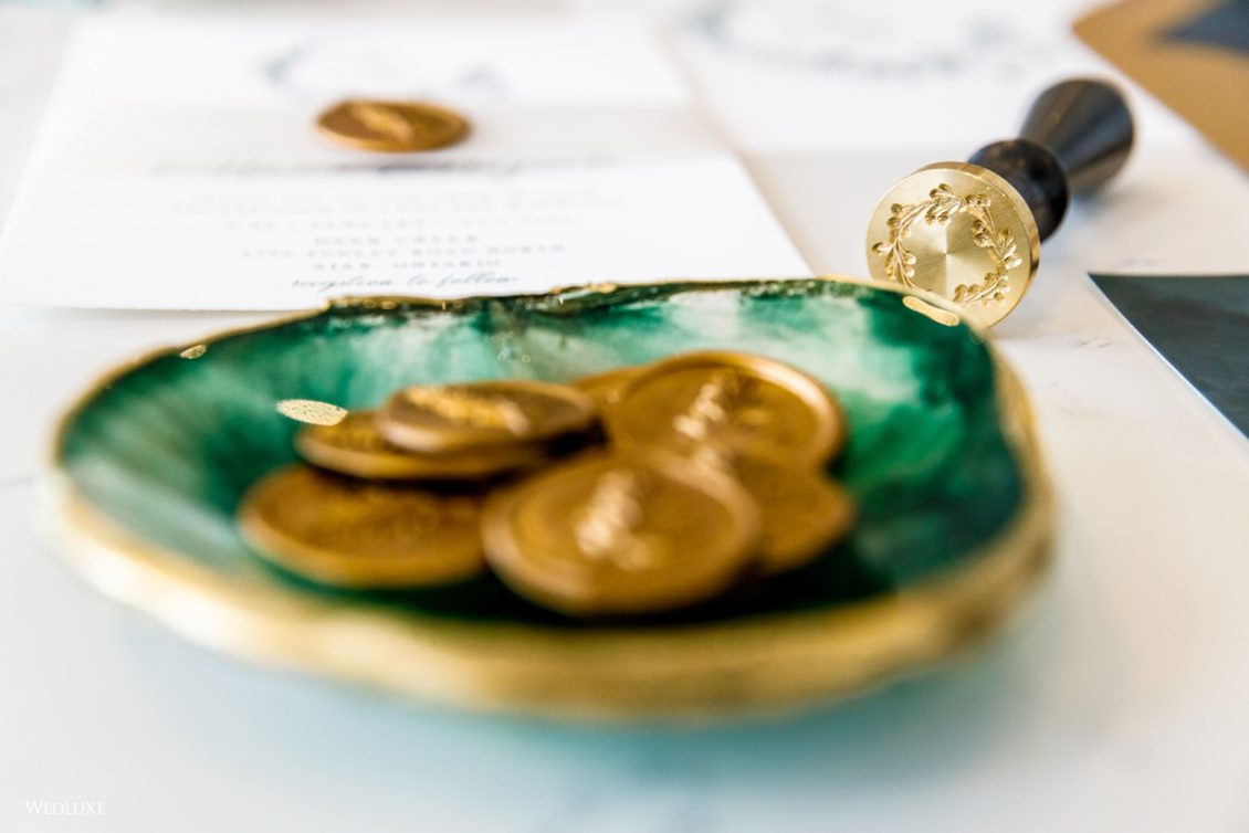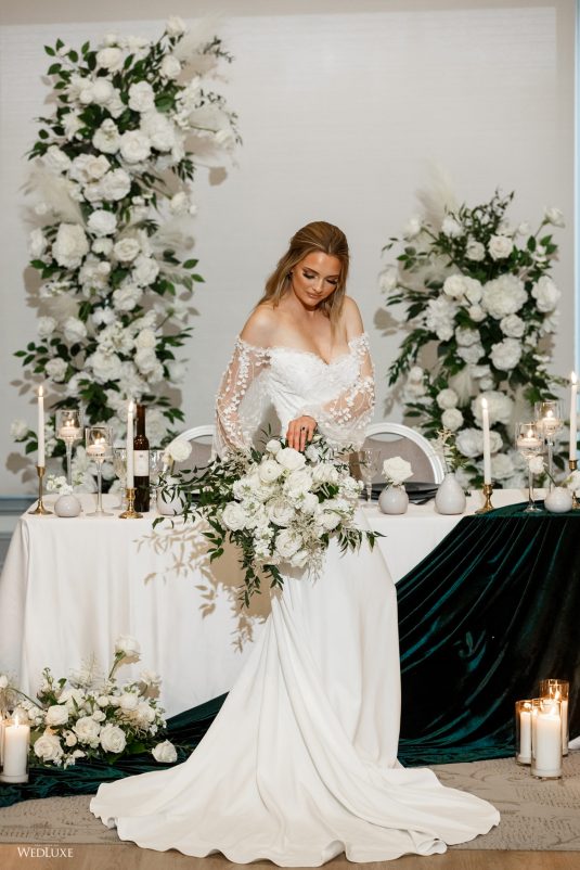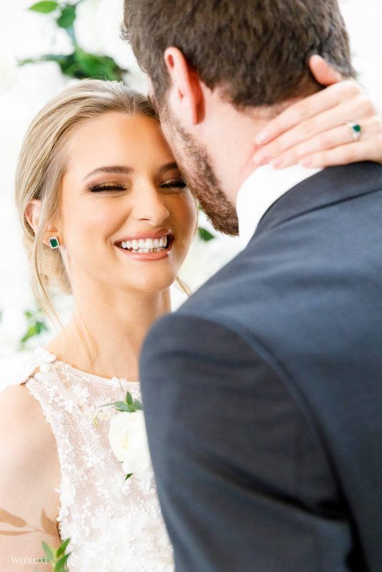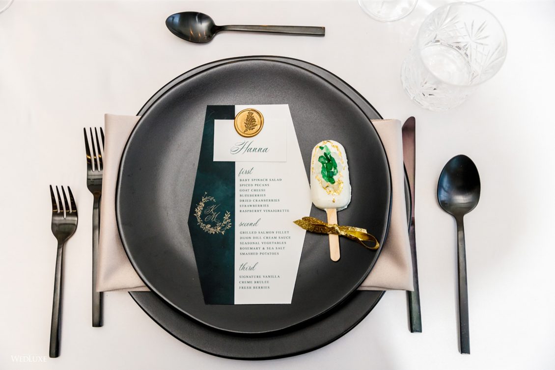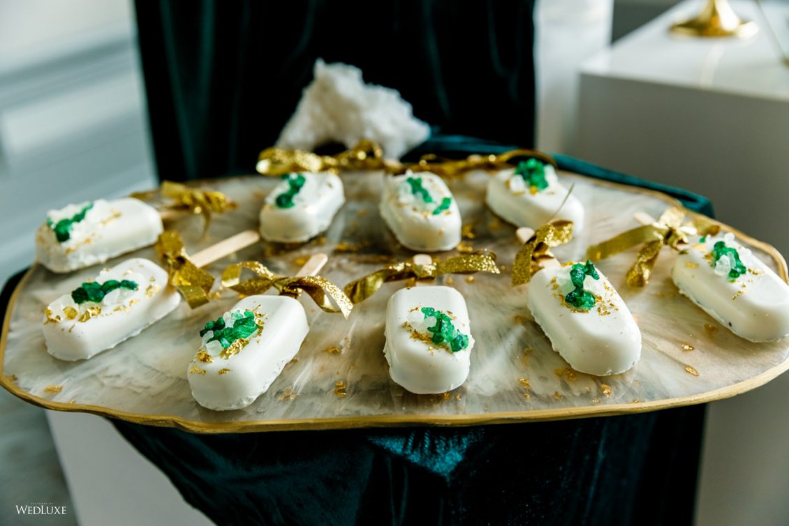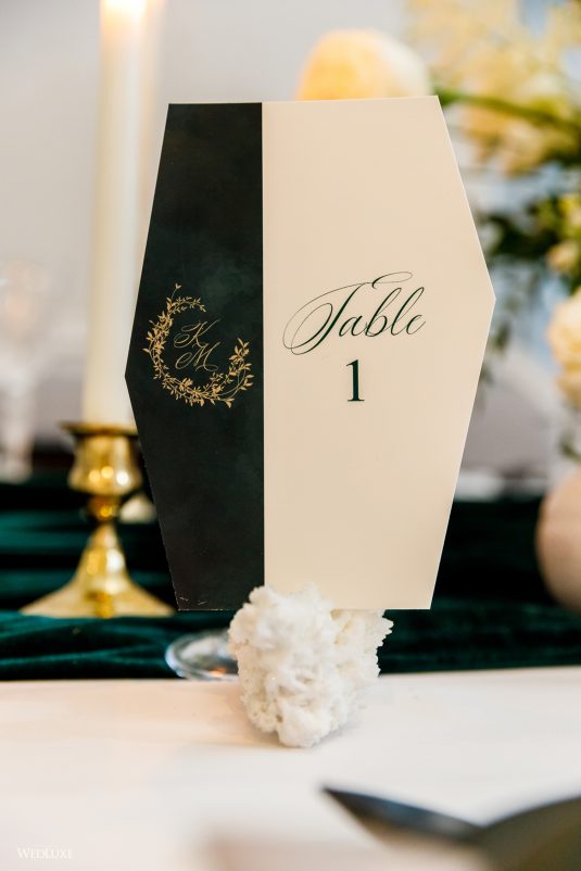 “Emerald Frost” was the guiding theme for this wintery, romantic styled shoot. We love the gorgeous green geode stone woven throughout… and the pop of dramatic black in the reception design. Also, LOVING the HMU for this shoot. Since we’ve been LIVING in comfy clothes and under lockdown for what feels like forever, we can’t wait to get dressed up again!