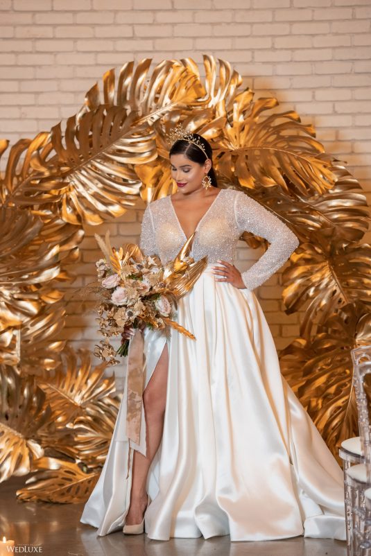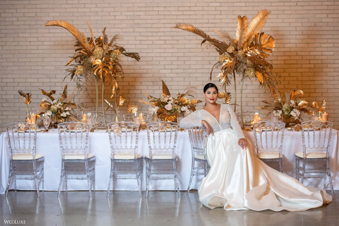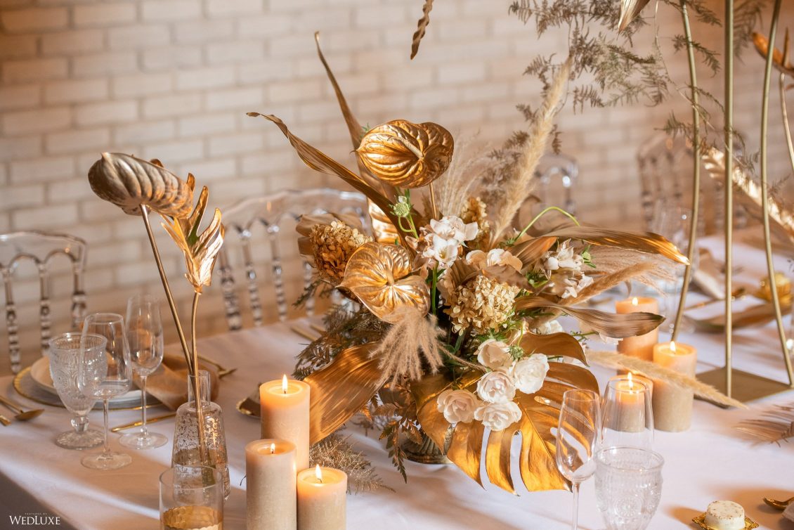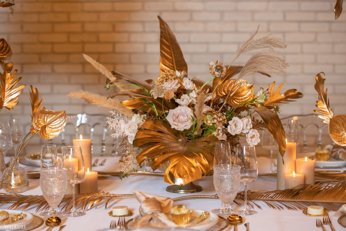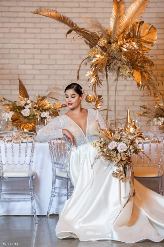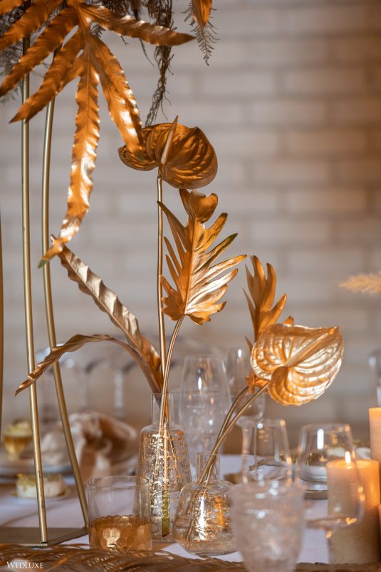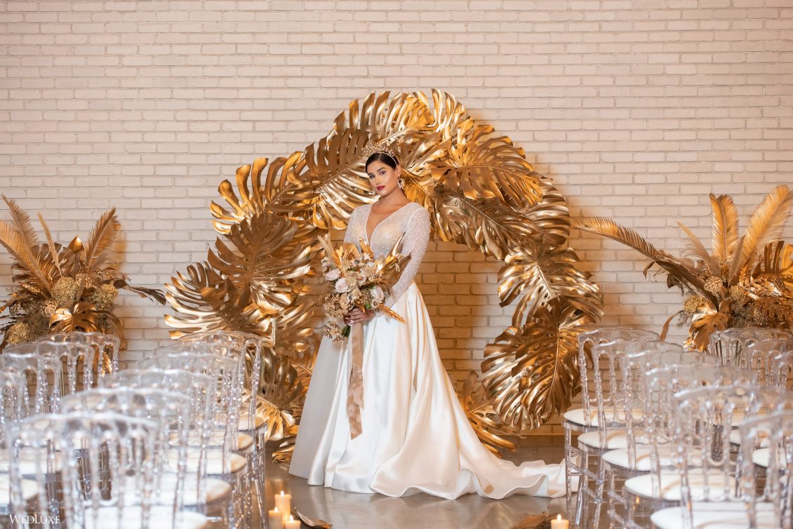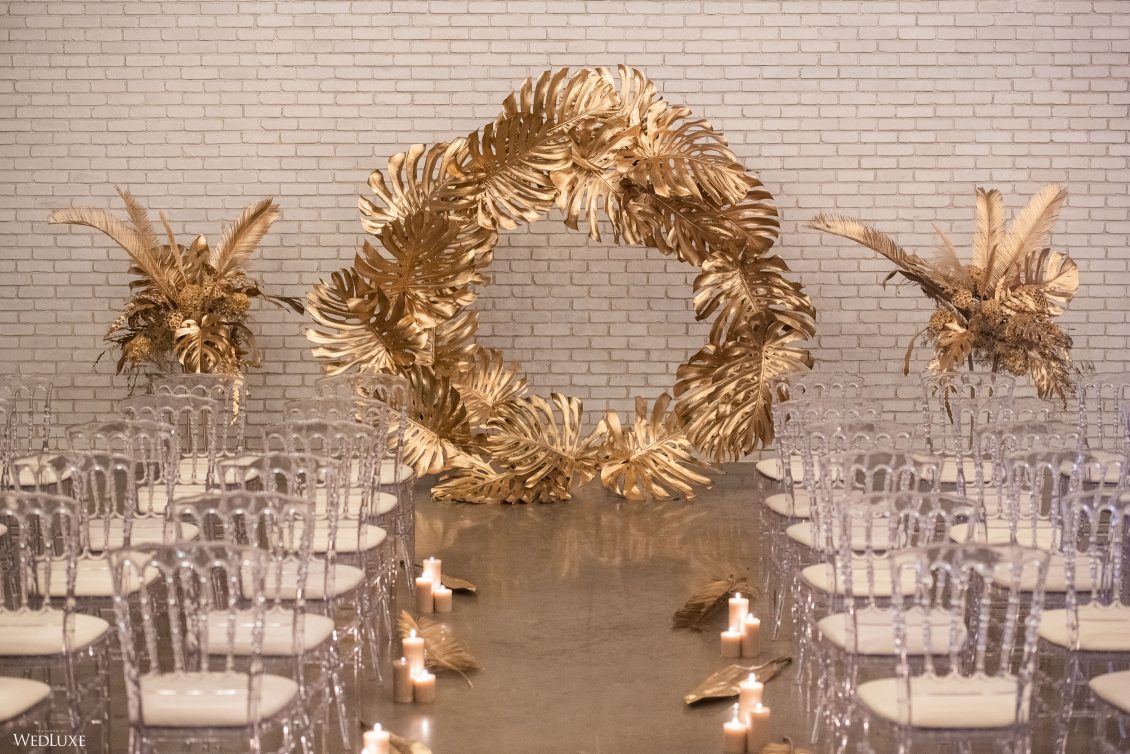 The ceremony arch of this styled shoot is made entirely of specially ordered GOLD monstera leaves, taking luxury to the next level! This wedding is for the bride looking for grandeur on her special day with an all-gold theme.