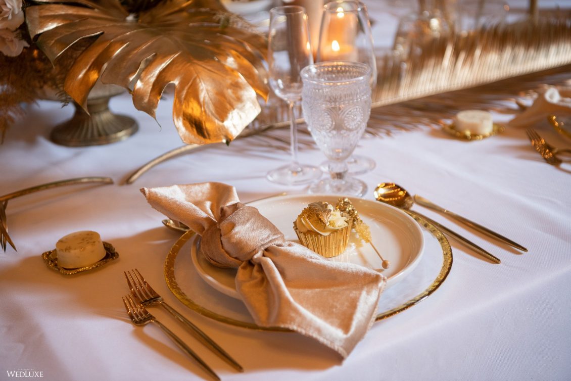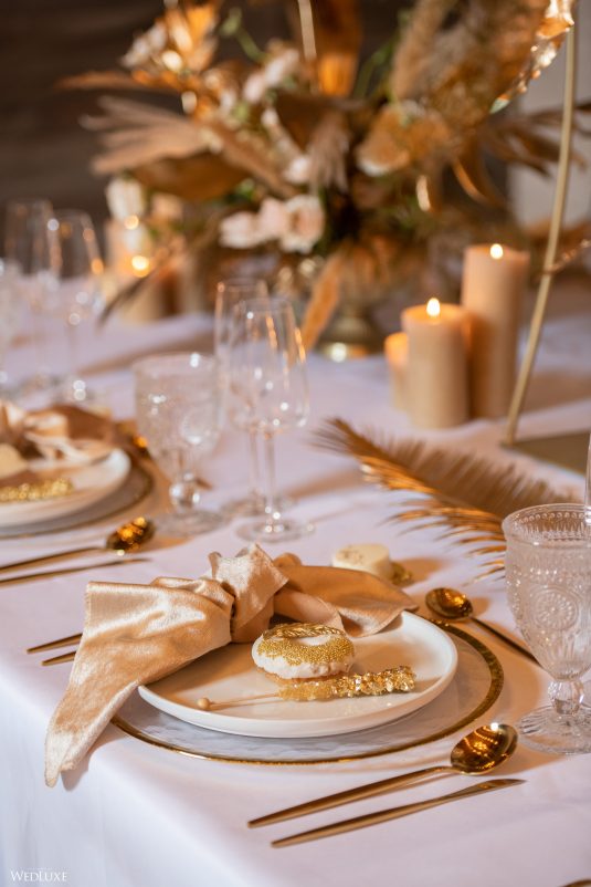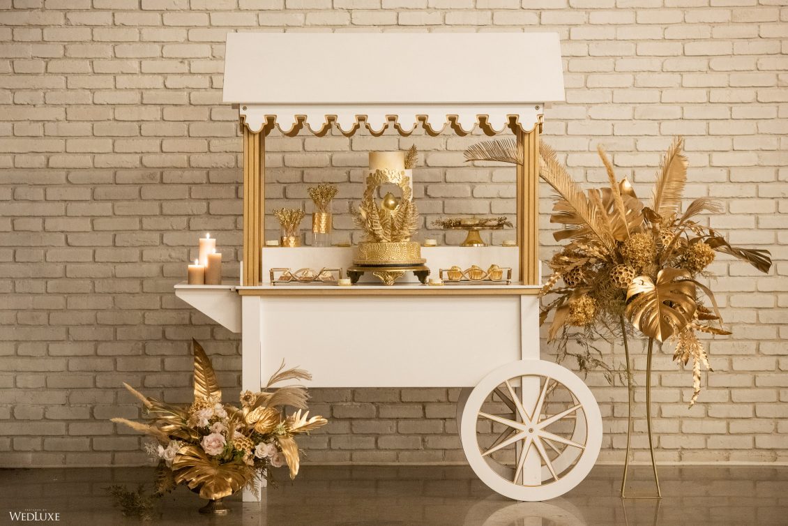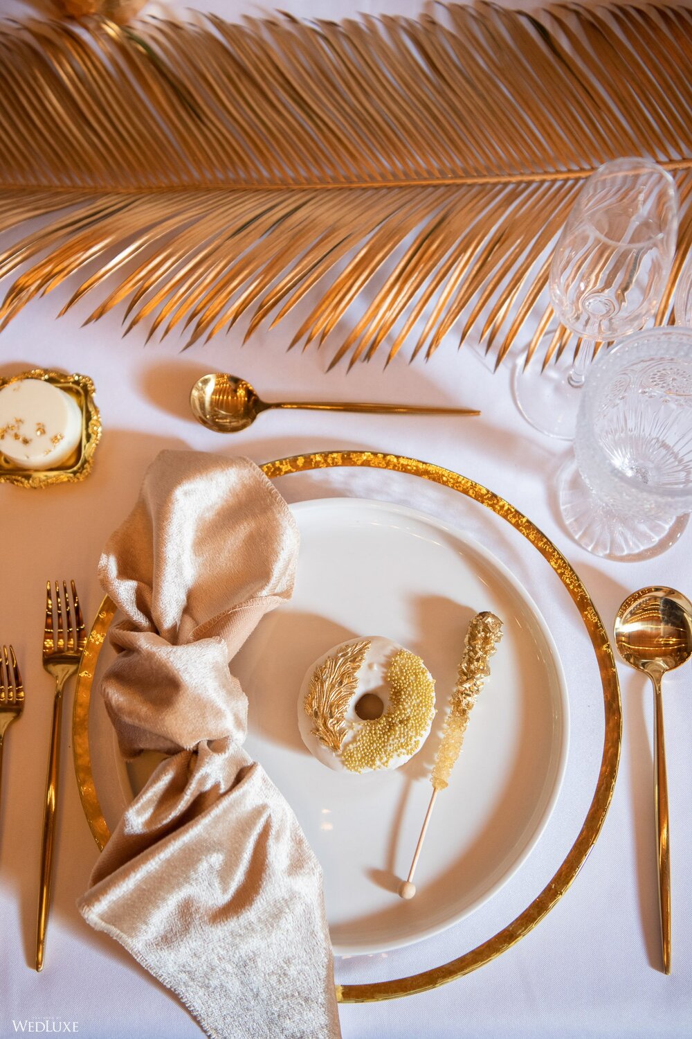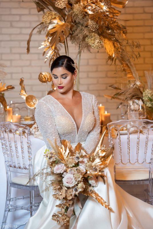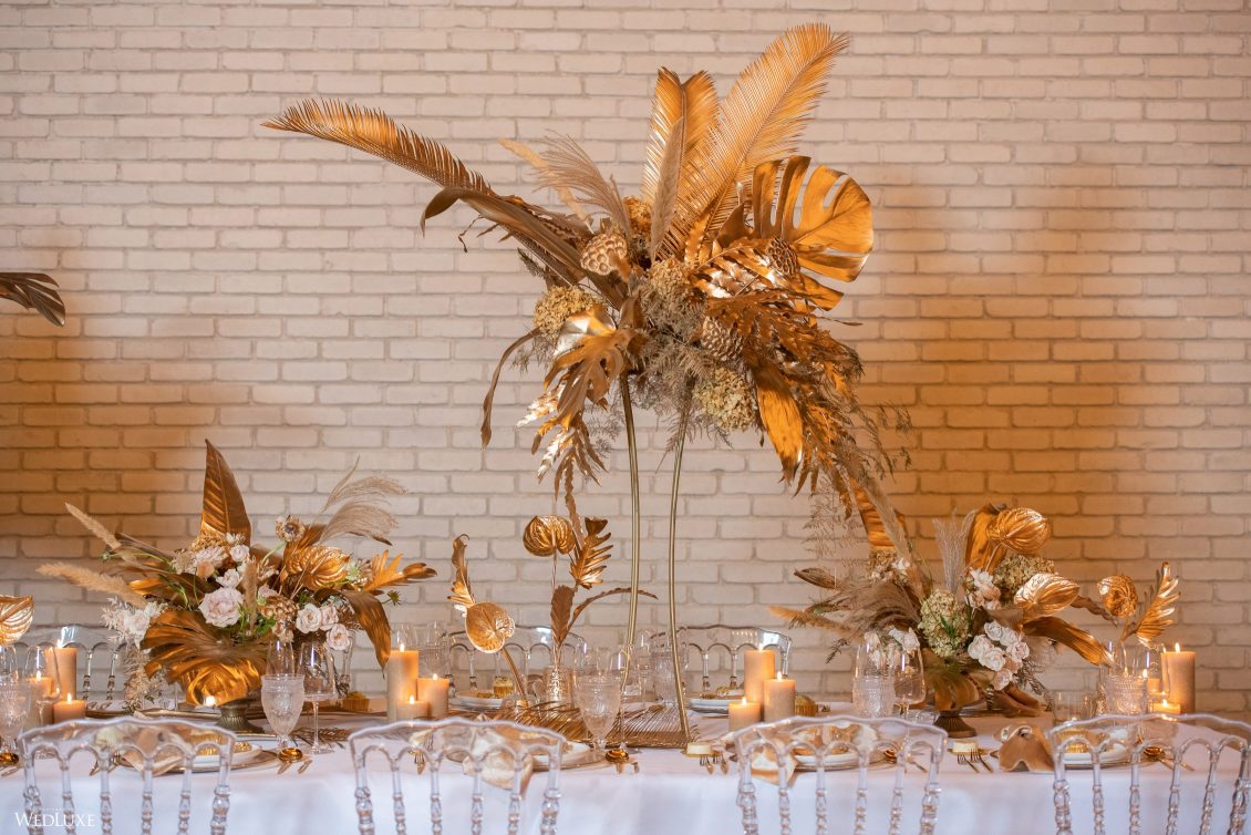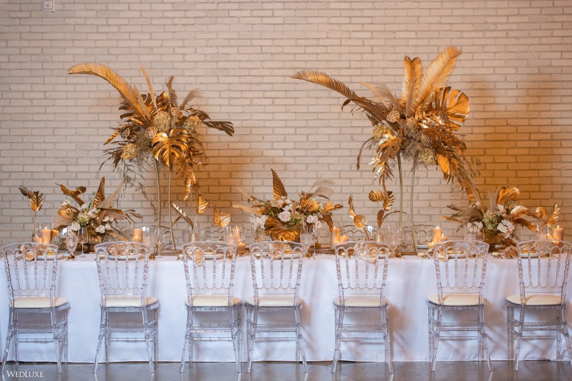 The ceremony arch of this styled shoot is made entirely of specially ordered GOLD monstera leaves, taking luxury to the next level! This wedding is for the bride looking for grandeur on her special day with an all-gold theme.