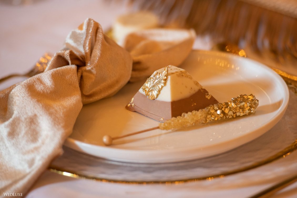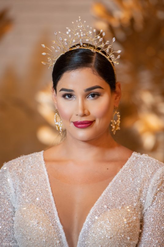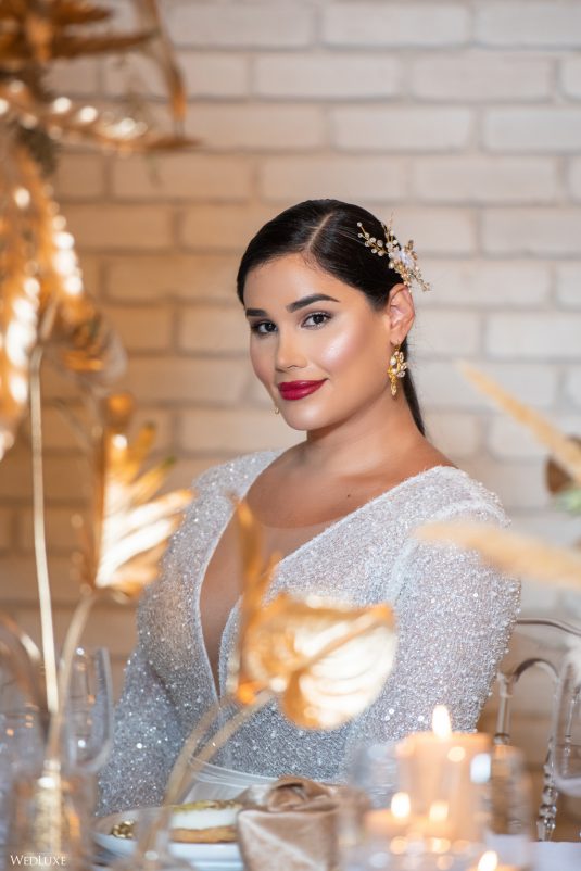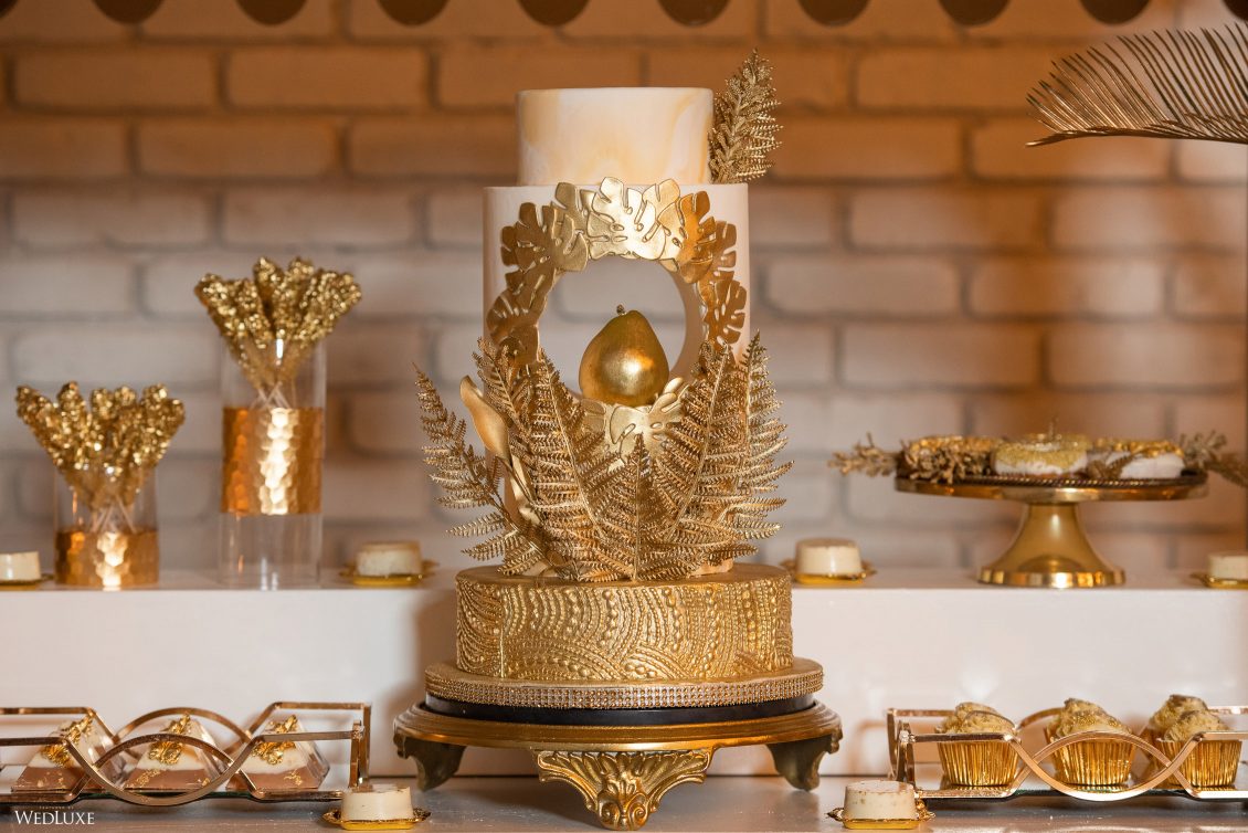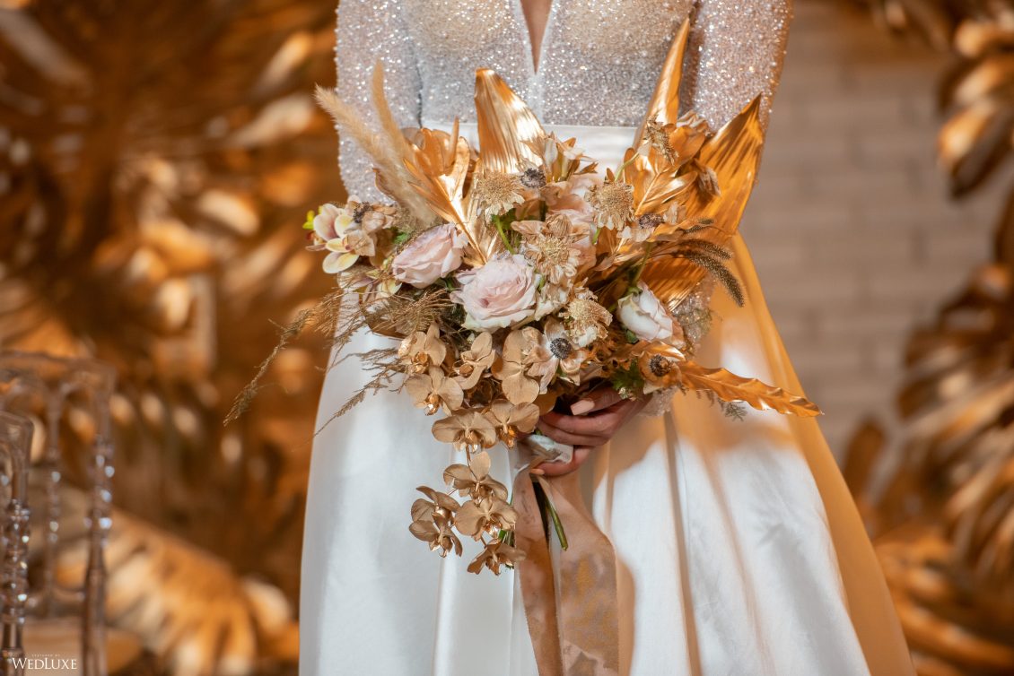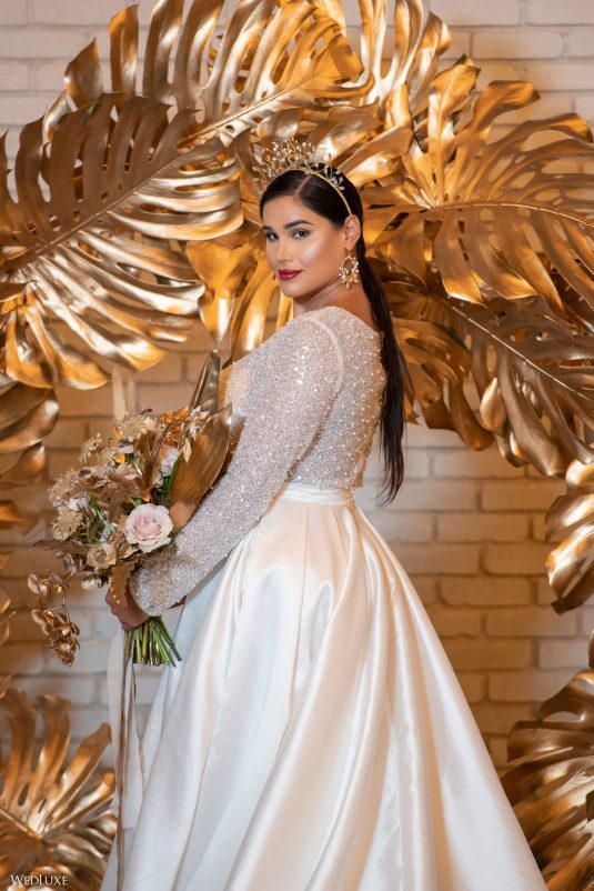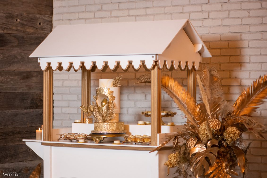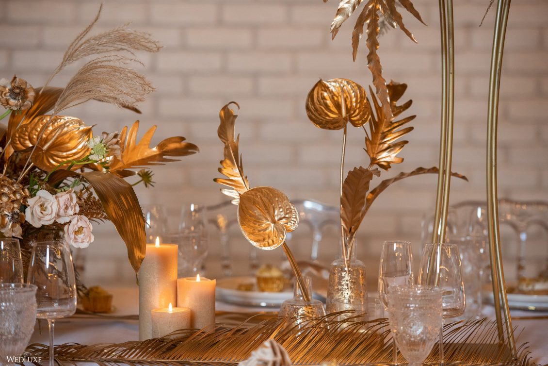 The ceremony arch of this styled shoot is made entirely of specially ordered GOLD monstera leaves, taking luxury to the next level! This wedding is for the bride looking for grandeur on her special day with an all-gold theme.