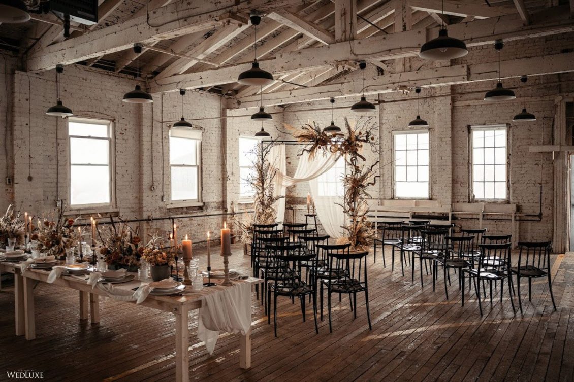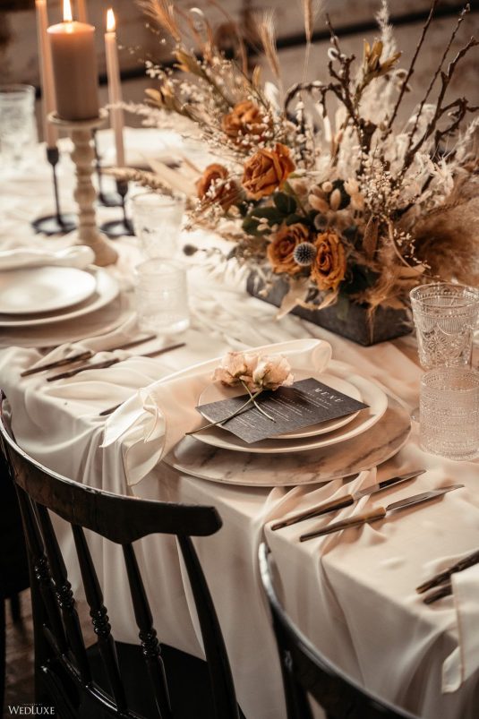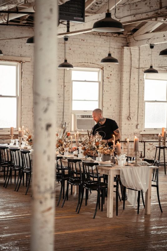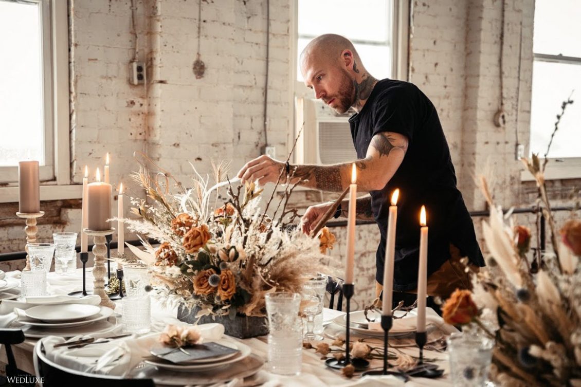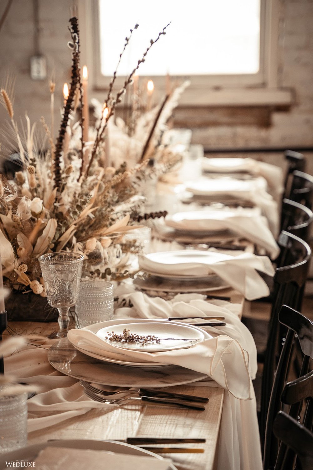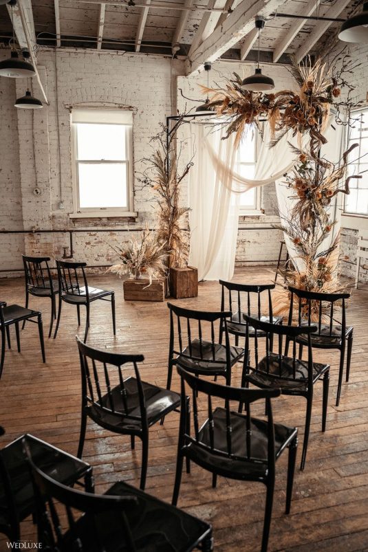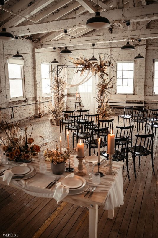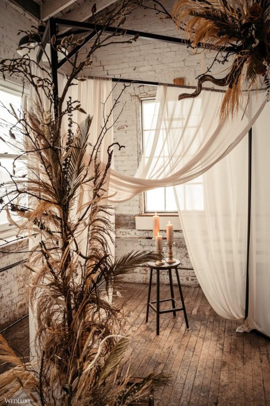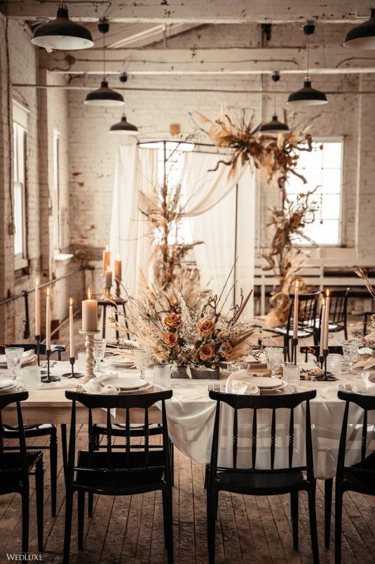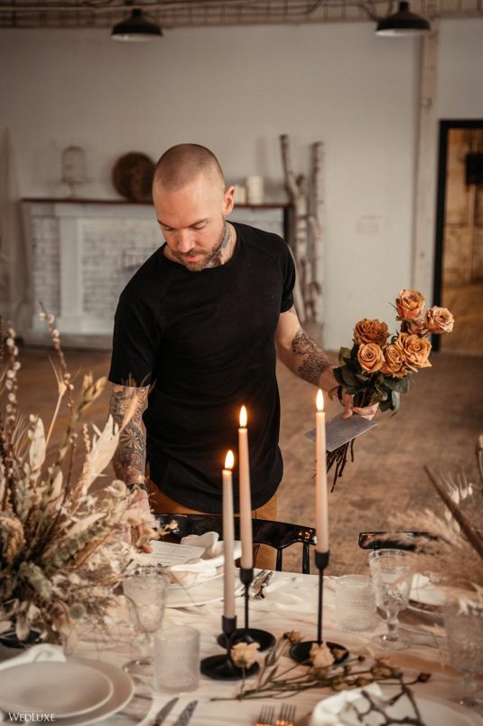 Designer Brock Stacey of Beaux Florals is ALL about community and building connection through floral design. We love his approach especially when we’re all longing for some social interaction! We also love the raw warmth and organic-meets-edgy vibe of this #microwedding ceremony and tablescape design that Brock created using flowy neutral fabrics, lots of candles, and one of the hottest trends of 2021: dried floral and organic grasses/stems interwoven with fresh blooms. Overall, this design has a definite edge, yet it’s still super inviting. Essentially, 2021 in a nutshell! ;)