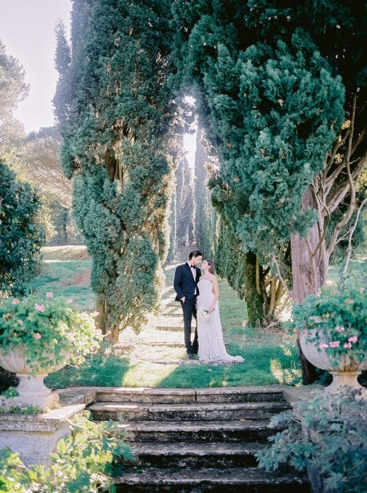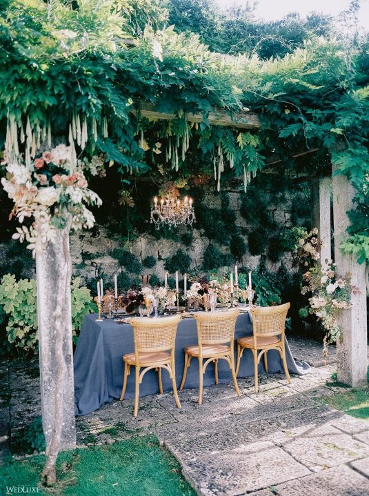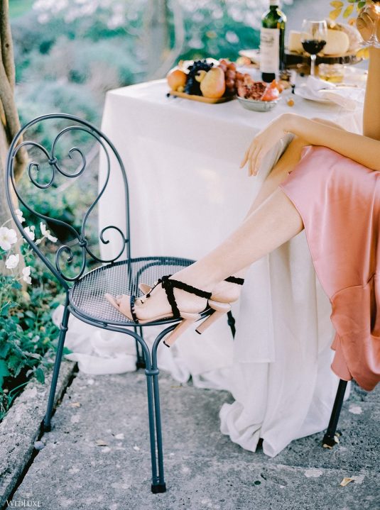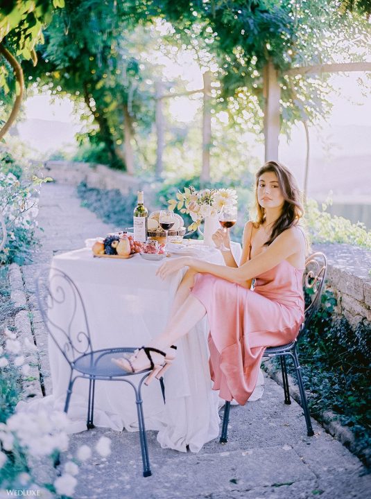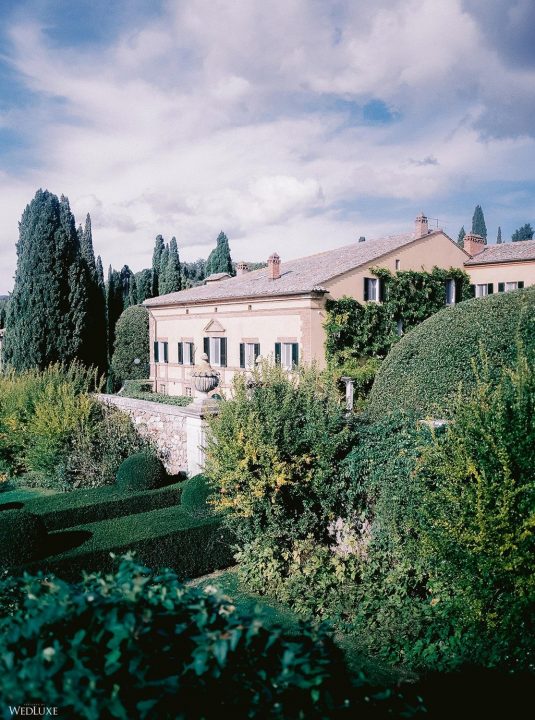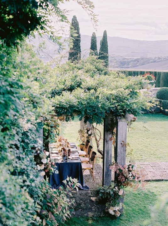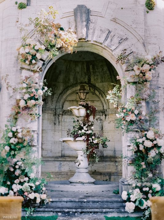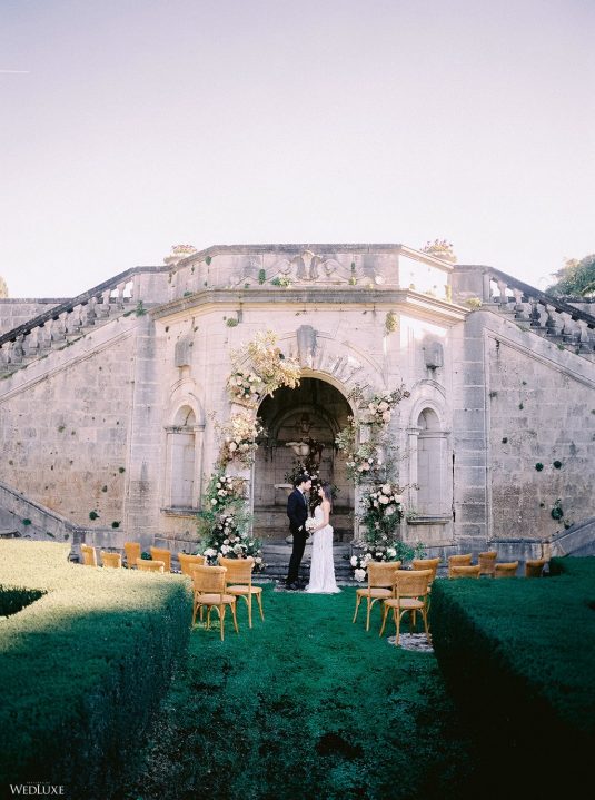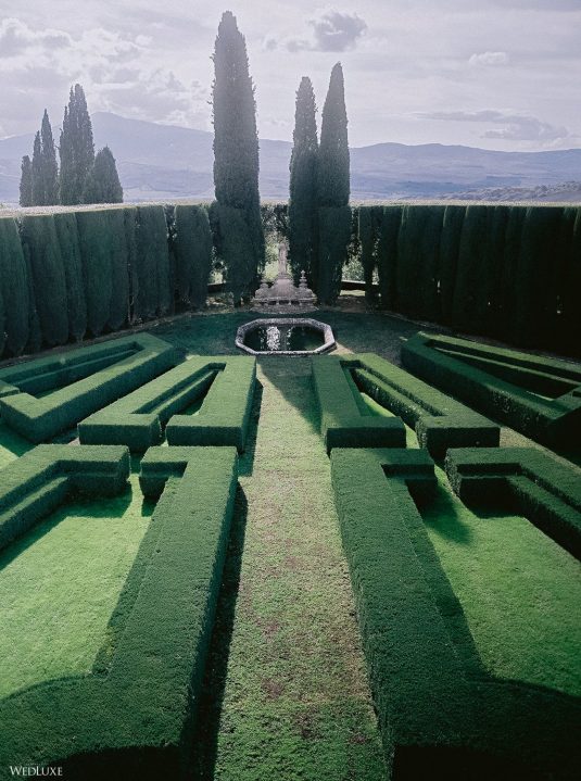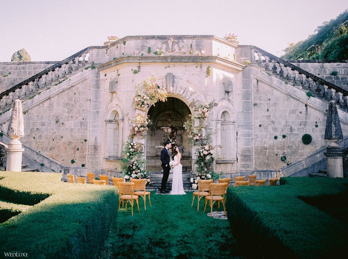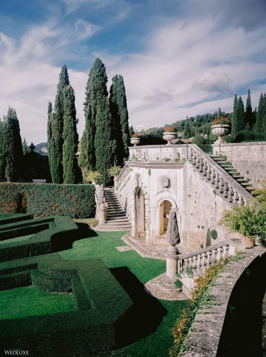 The inspiration for this Tuscan styled shoot is all about the 15th-century countryside homestead, La Foce, with its immaculately manicured late-summer gardens and Renaissance romance. The showstopper of this locale is an ornate Nymphaeum, a monument to spring nymphs, where lies a majestic grotto and secret fountain—the most magical and unexpected ceremony setting of the venue.