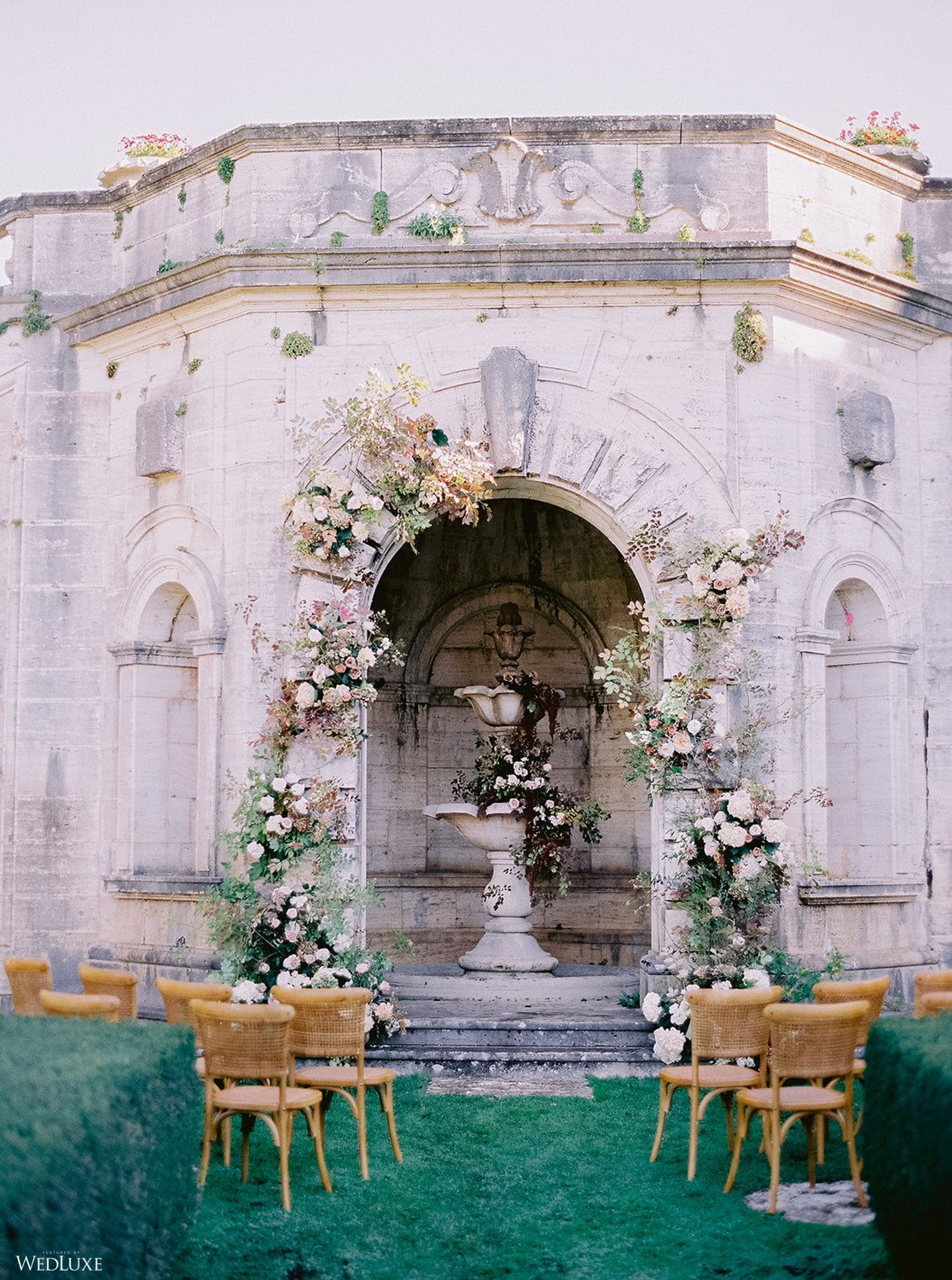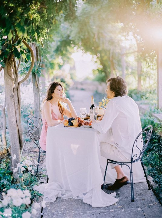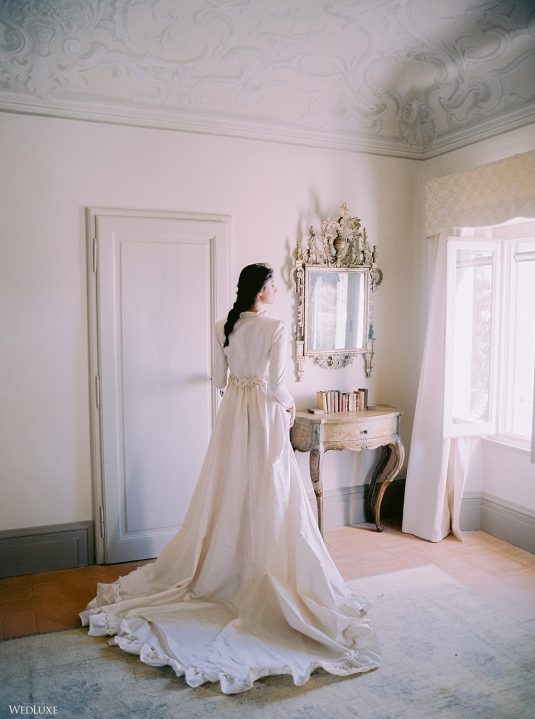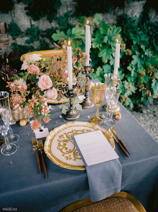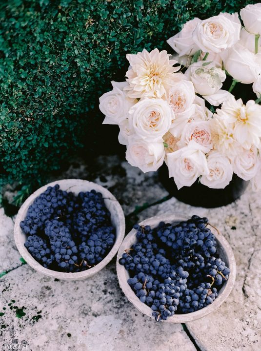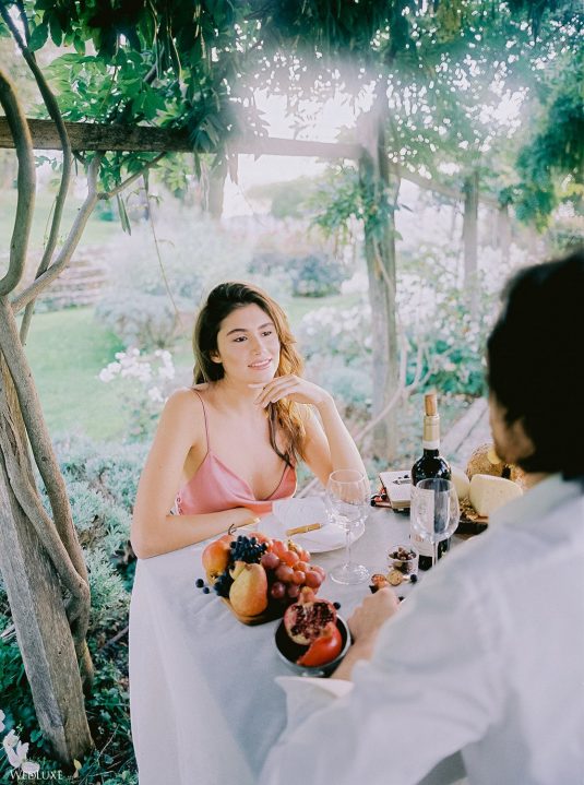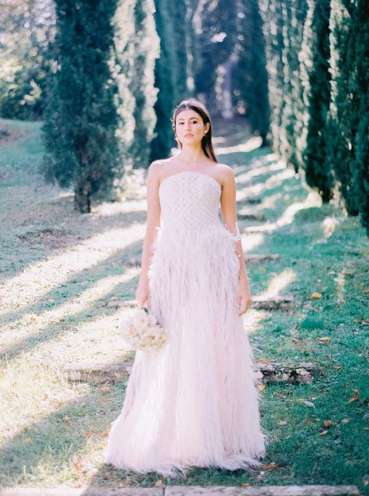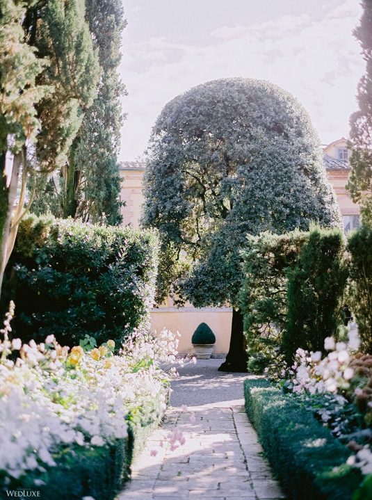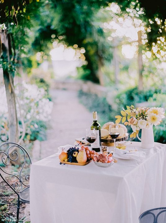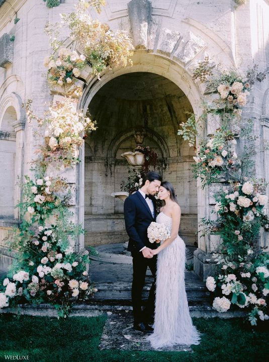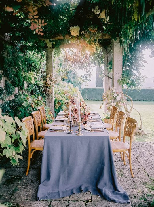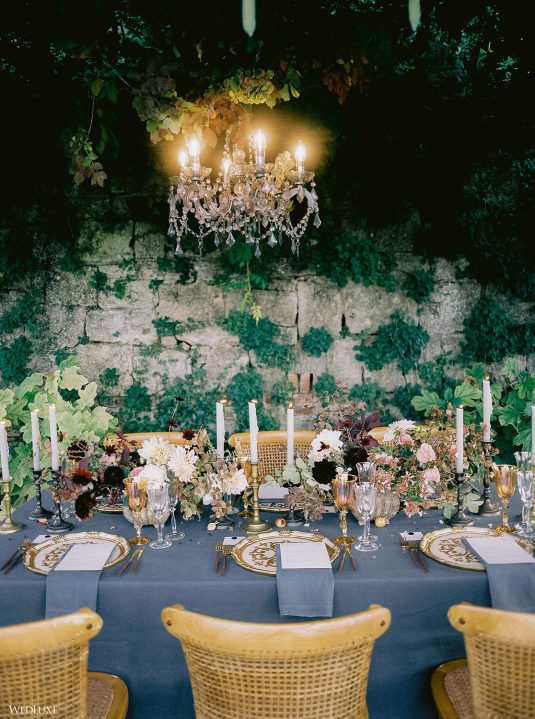 The inspiration for this Tuscan styled shoot is all about the 15th-century countryside homestead, La Foce, with its immaculately manicured late-summer gardens and Renaissance romance. The showstopper of this locale is an ornate Nymphaeum, a monument to spring nymphs, where lies a majestic grotto and secret fountain—the most magical and unexpected ceremony setting of the venue.