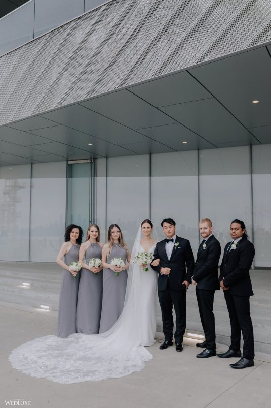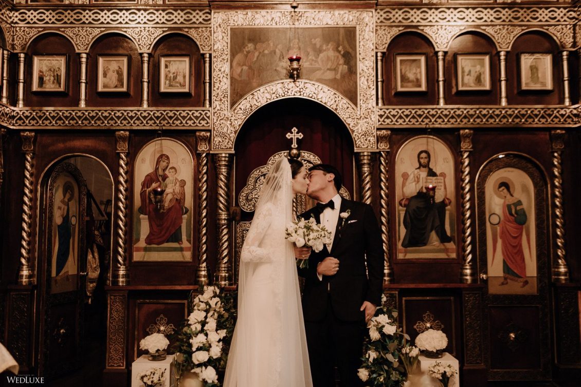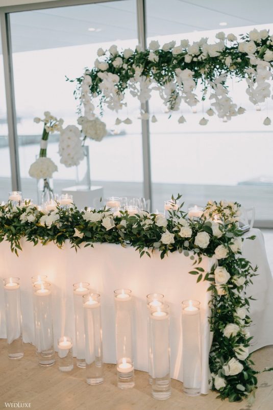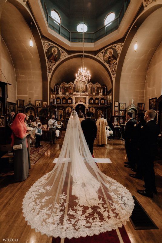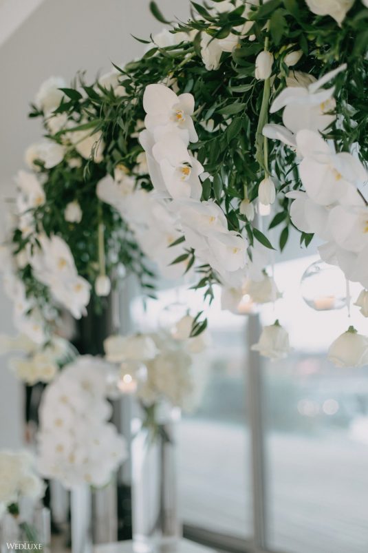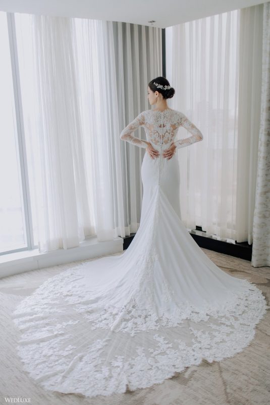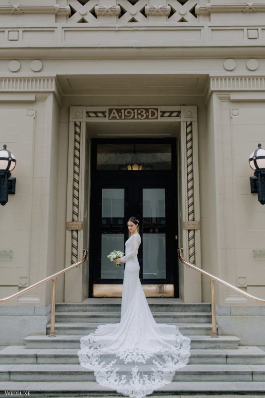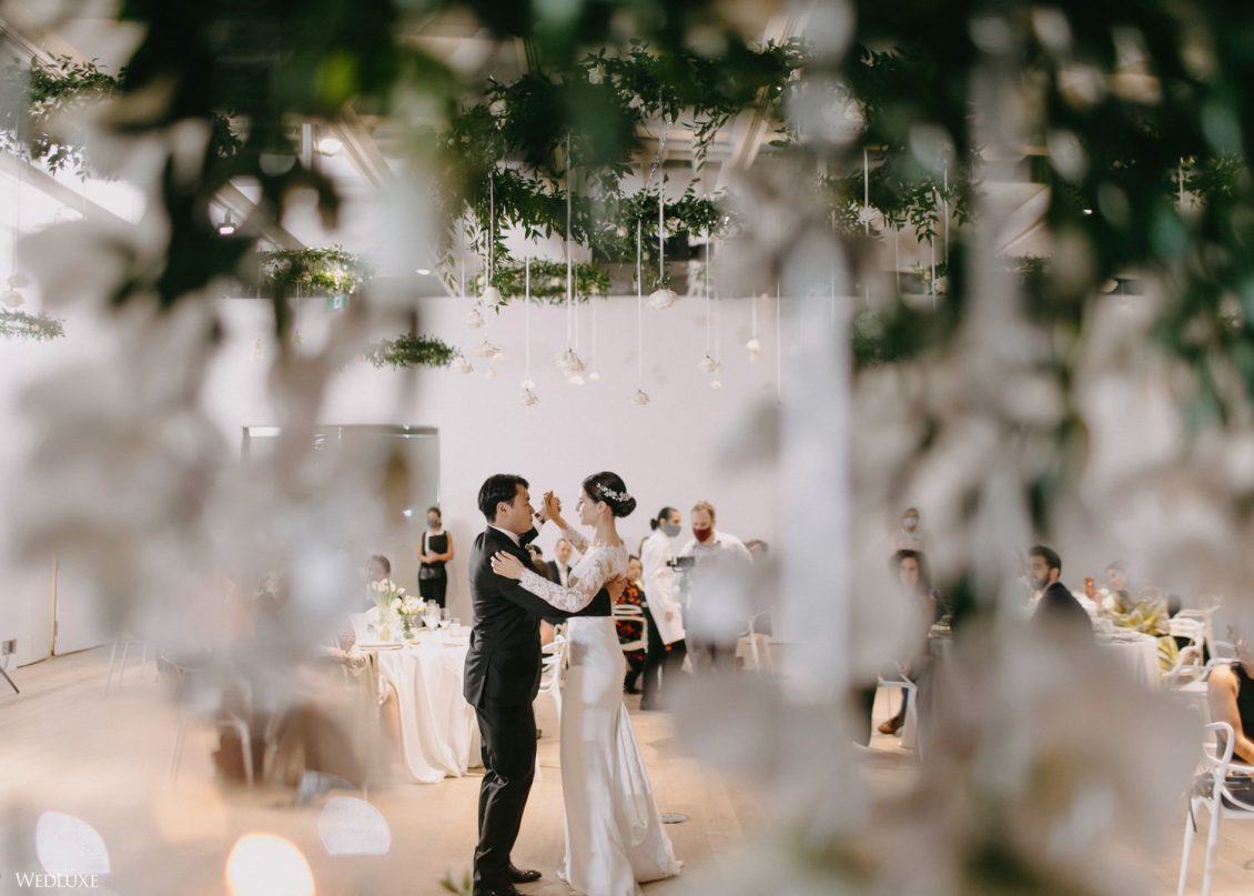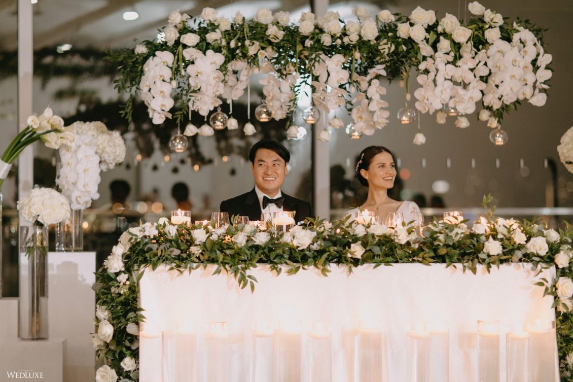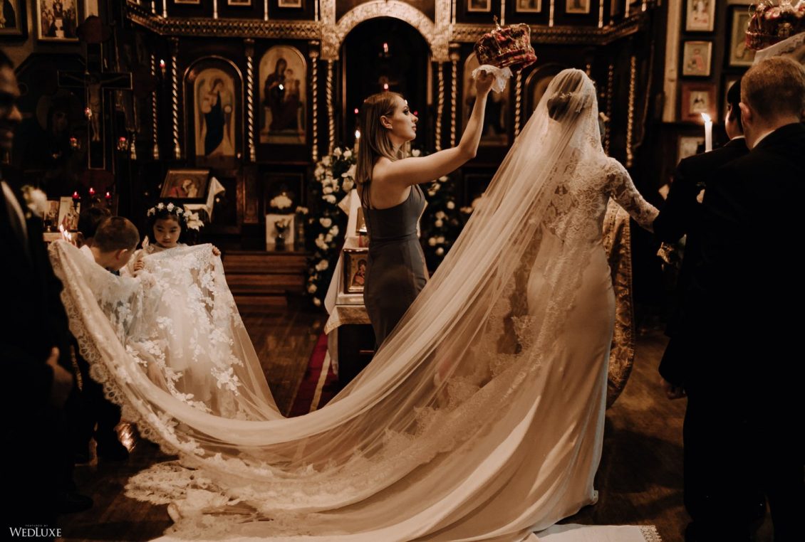 You won’t believe us when we say that this wedding was an intimate celebration with only 36 guests — the atmosphere created from elaborate floral installations and luxury details was classic yet modern! And we can’t forget about the bride’s gown and its GORGEOUS train, not to mention its matching cathedral-length veil (the bride’s favorite wedding design detail!) by Pronovias.