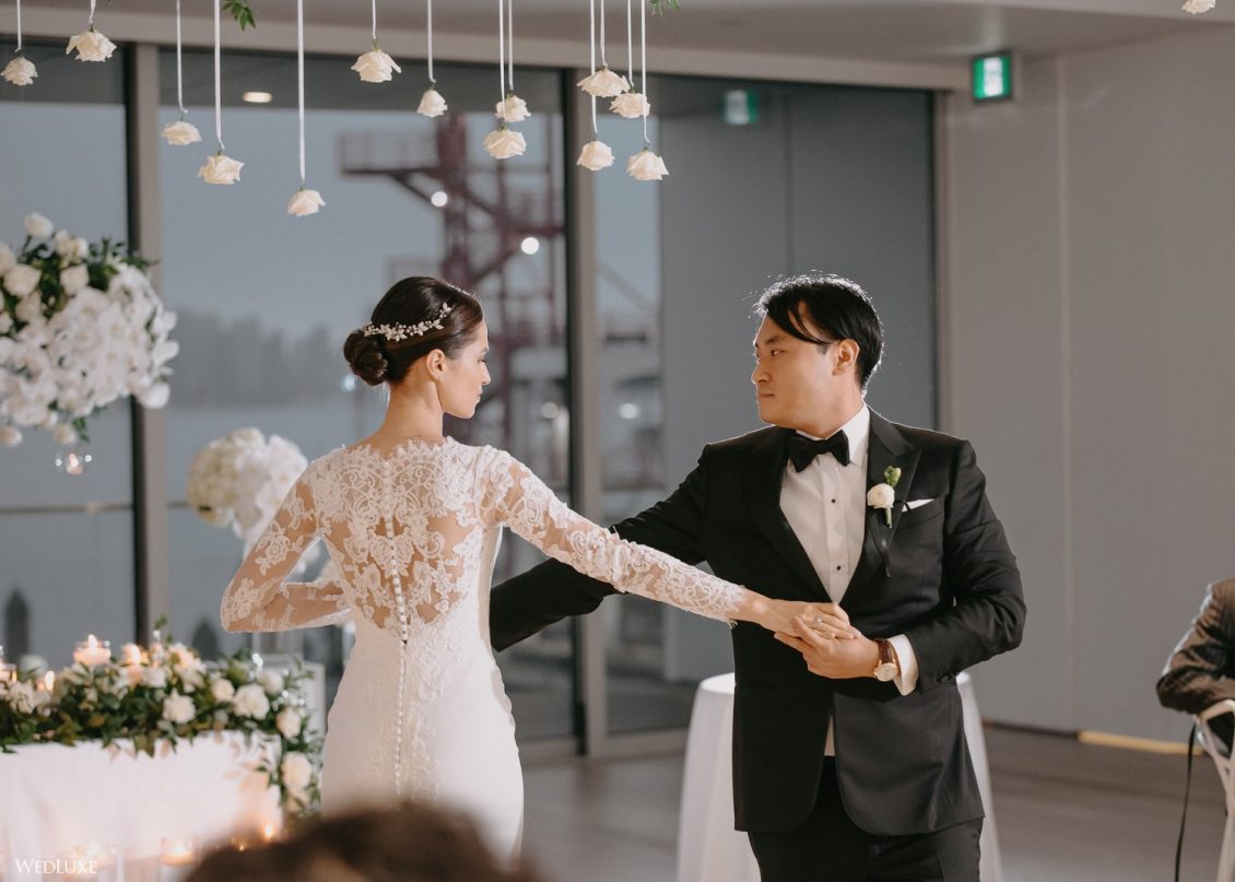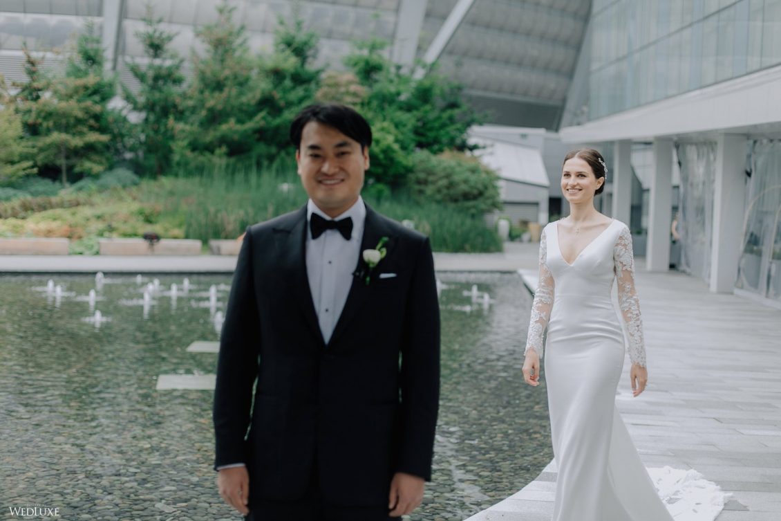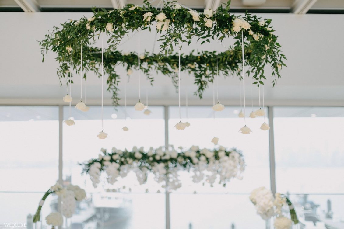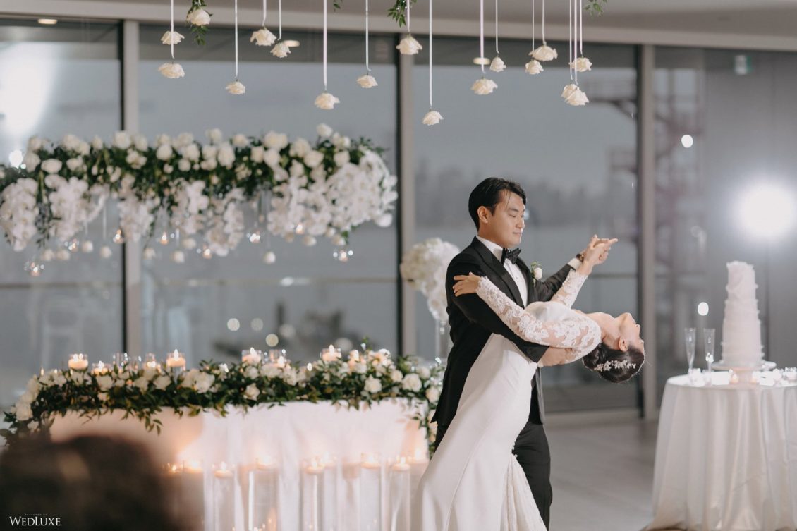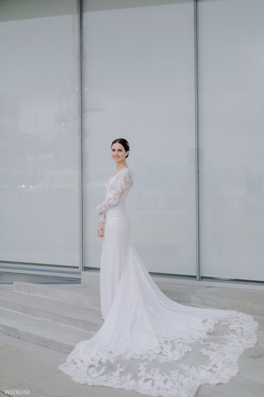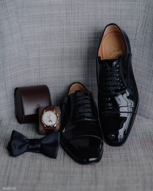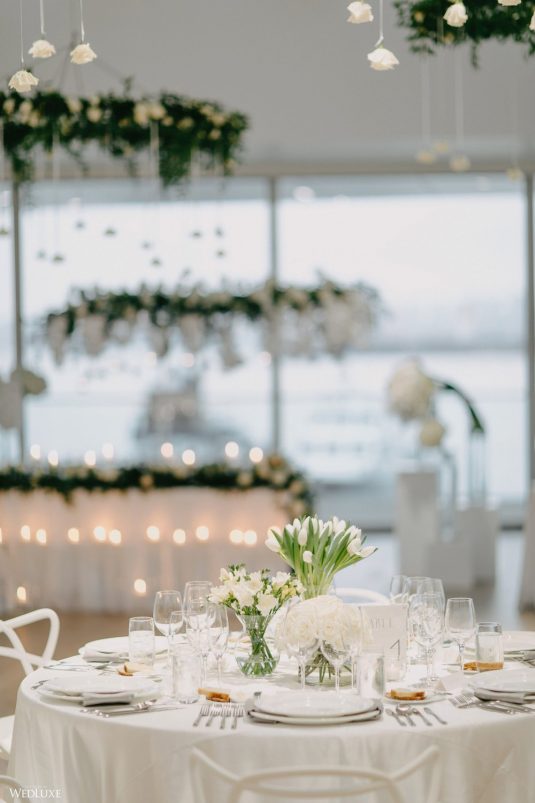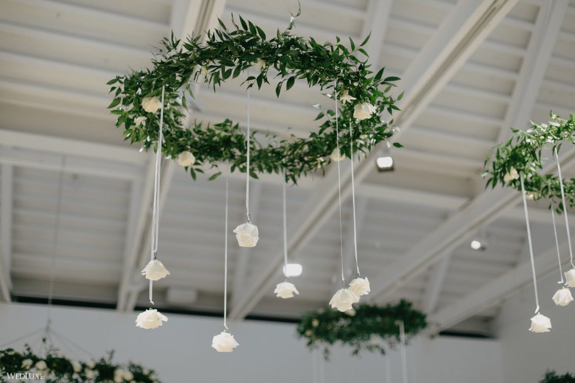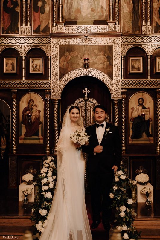You won’t believe us when we say that this wedding was an intimate celebration with only 36 guests — the atmosphere created from elaborate floral installations and luxury details was classic yet modern! And we can’t forget about the bride’s gown and its GORGEOUS train, not to mention its matching cathedral-length veil (the bride’s favorite wedding design detail!) by Pronovias.