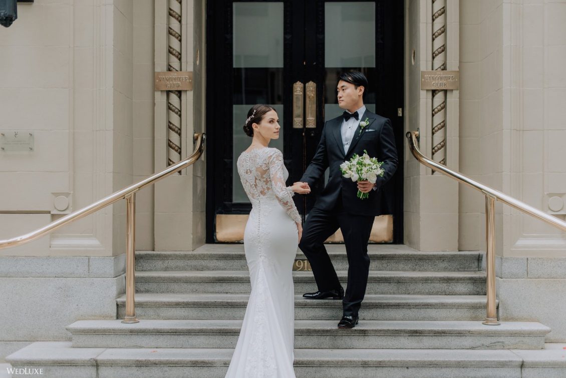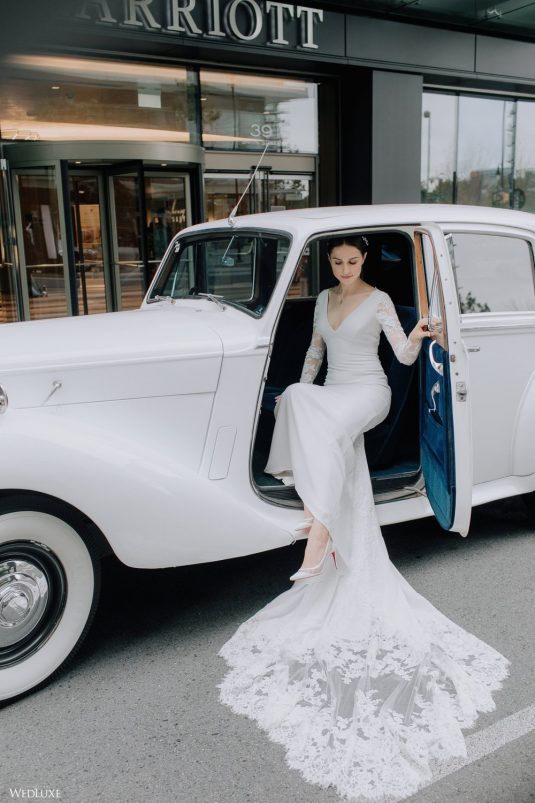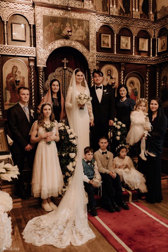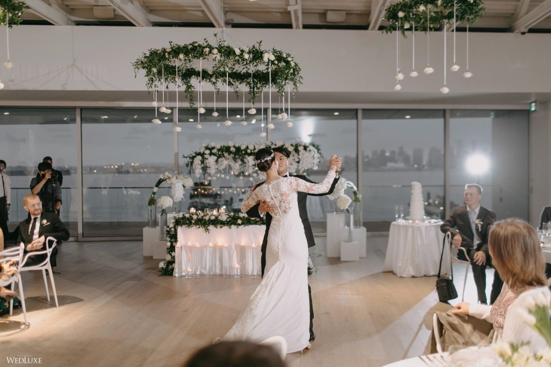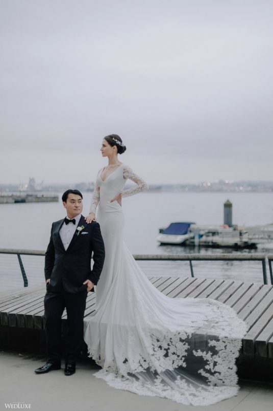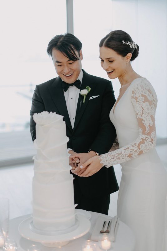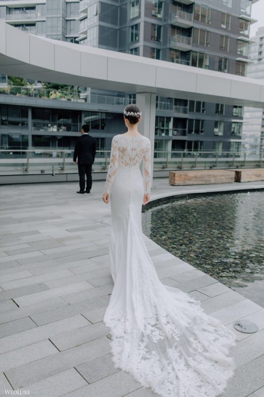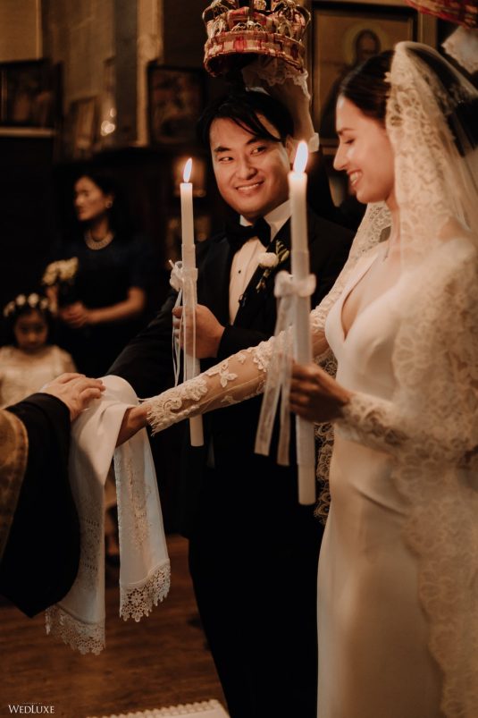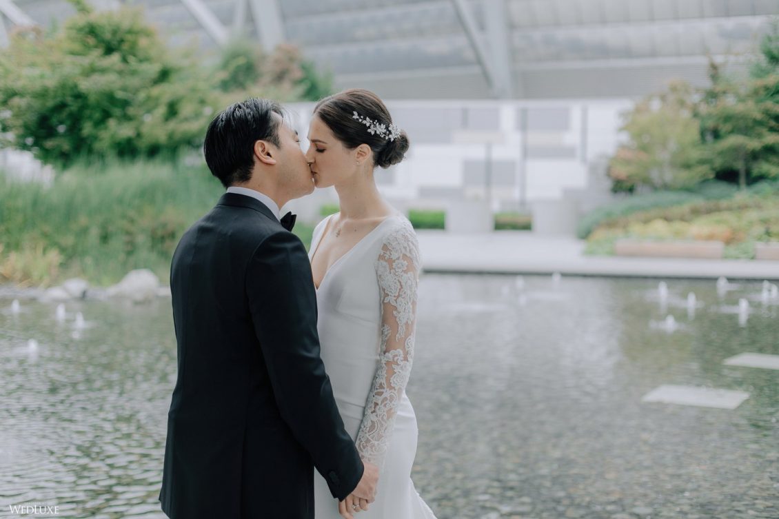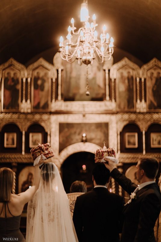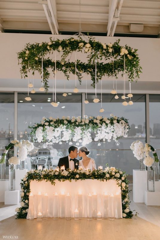 You won’t believe us when we say that this wedding was an intimate celebration with only 36 guests — the atmosphere created from elaborate floral installations and luxury details was classic yet modern! And we can’t forget about the bride’s gown and its GORGEOUS train, not to mention its matching cathedral-length veil (the bride’s favorite wedding design detail!) by Pronovias.