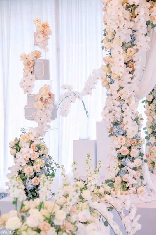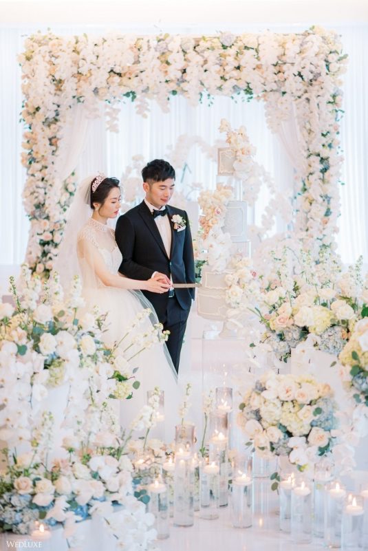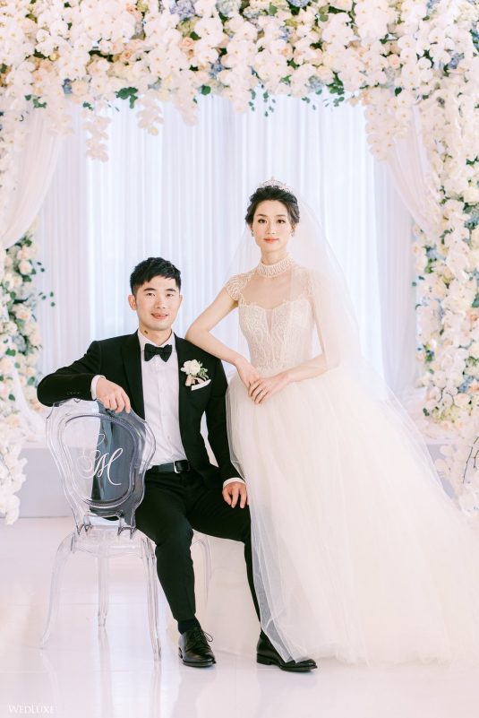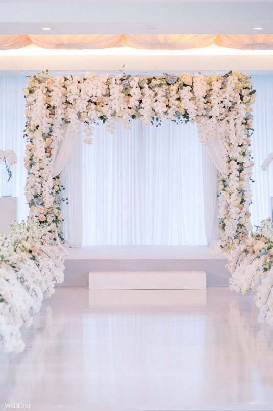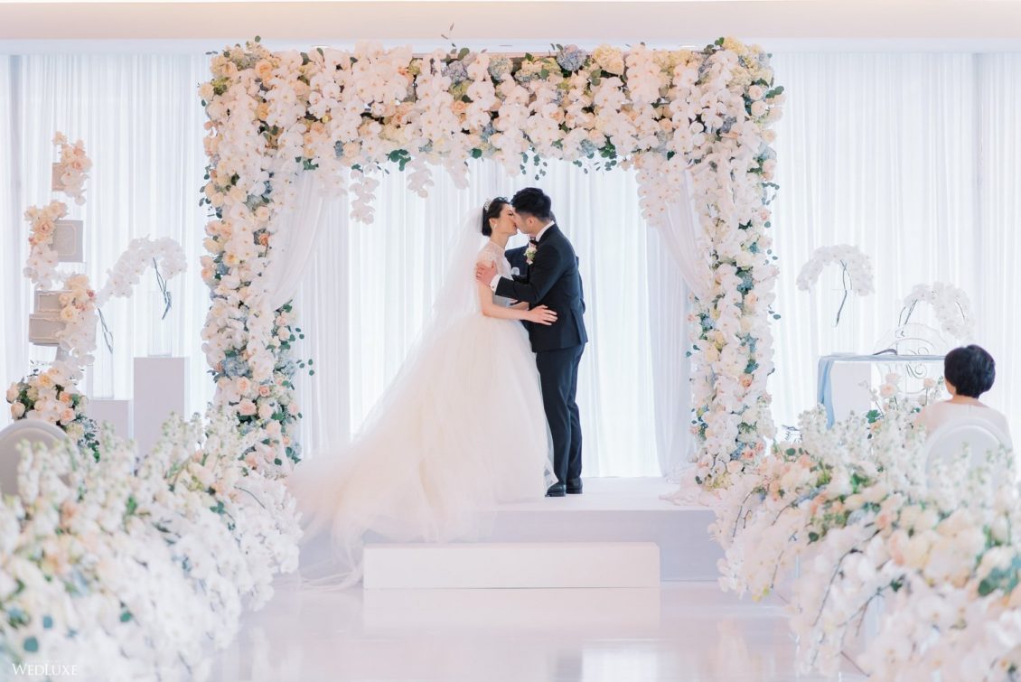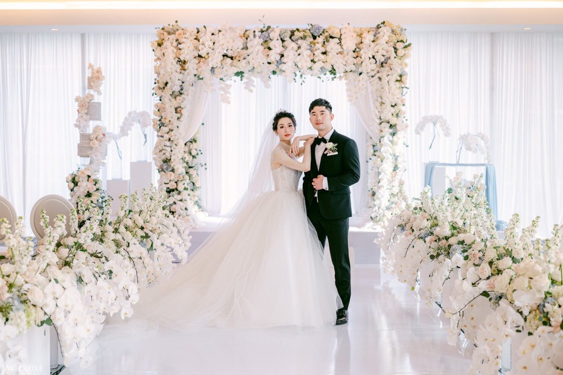 Co-founder [of Paradise Events] Liting Chan designed a breathtaking, statement-making floral arch that sat on a white stage as the ceremony’s focal point. Covered in thousands of blooms, including white phalaenopsis orchids shipped in from Holland, it framed the couple perfectly.