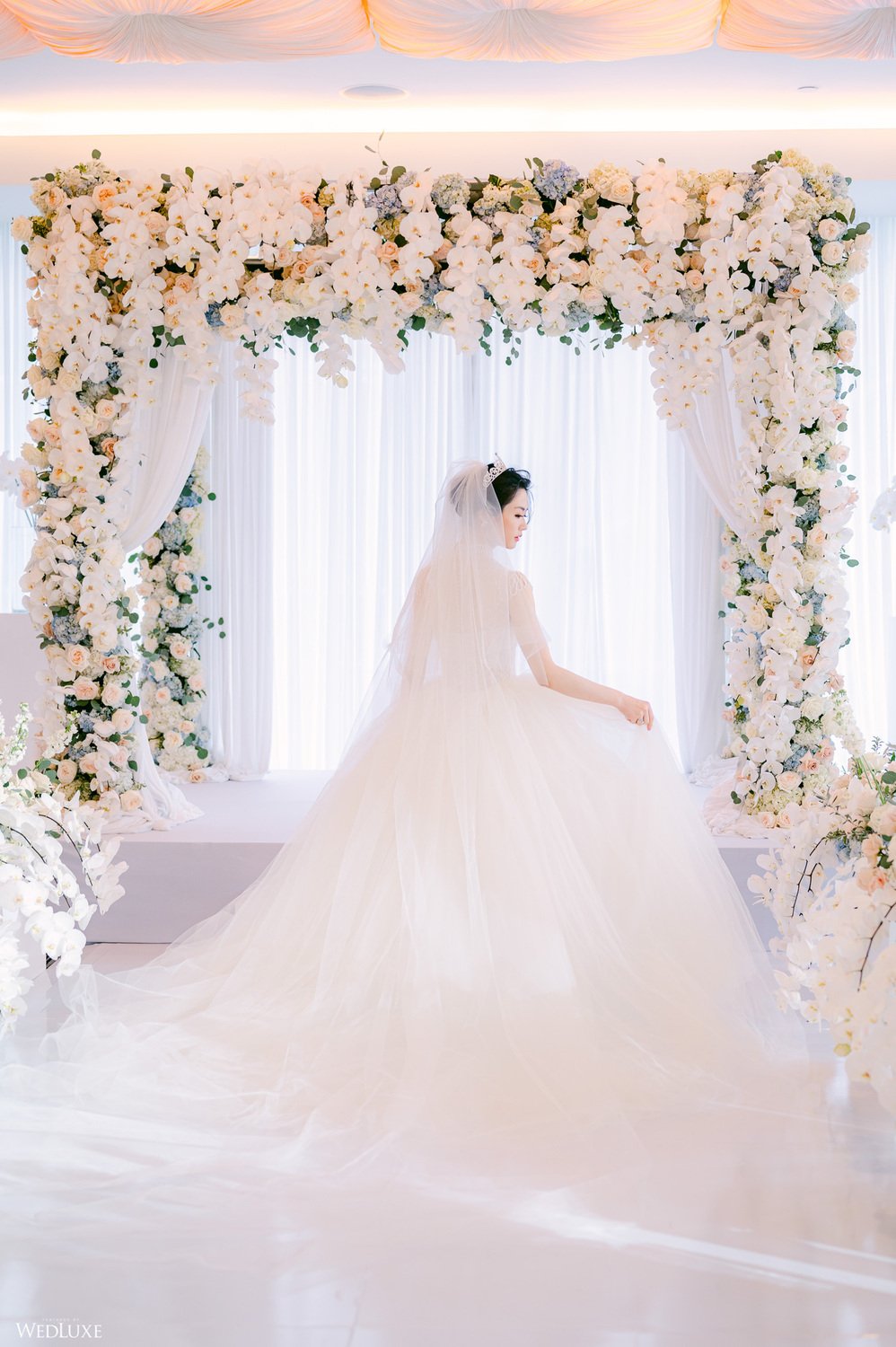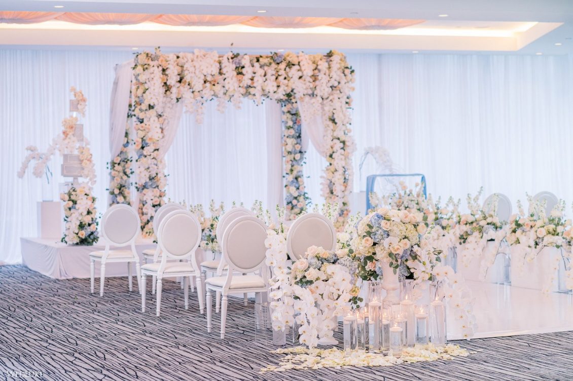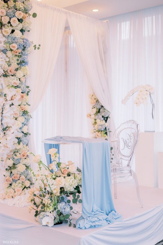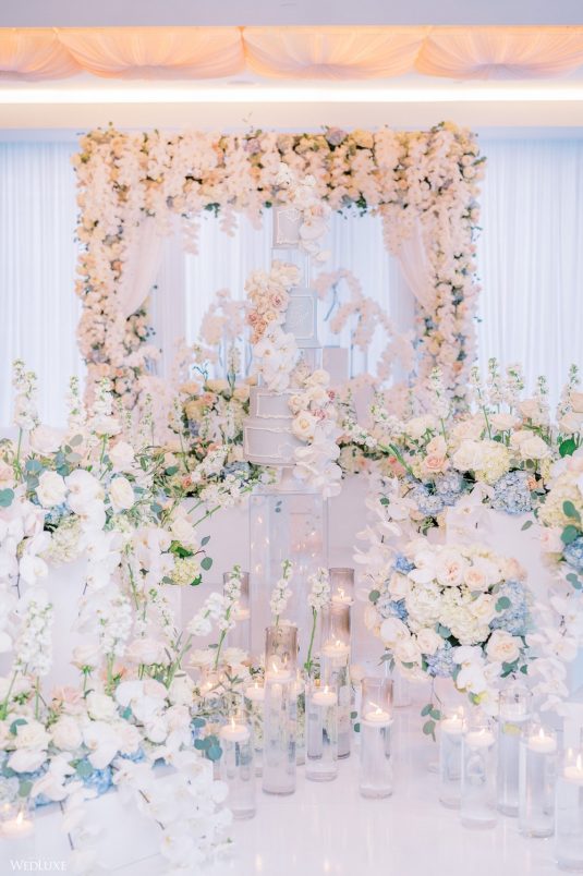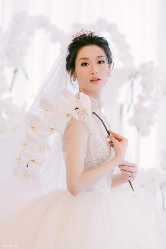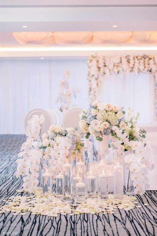 Co-founder [of Paradise Events] Liting Chan designed a breathtaking, statement-making floral arch that sat on a white stage as the ceremony’s focal point. Covered in thousands of blooms, including white phalaenopsis orchids shipped in from Holland, it framed the couple perfectly.