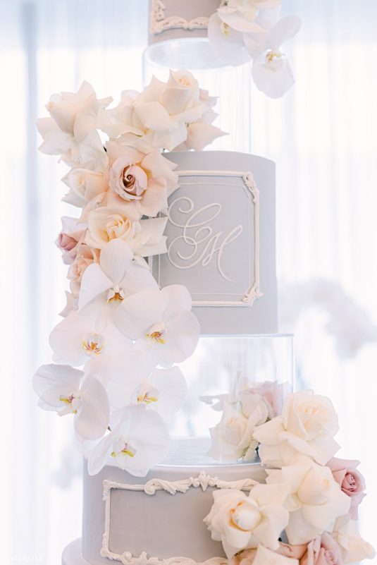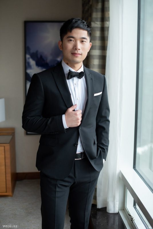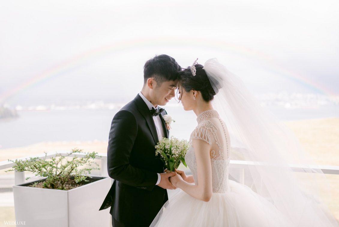 One of the couple’s favourite moments of the day was just as they were preparing for their first look on the patio of their stunning corner suite at the Fairmont Pacific Rim. A full rainbow appeared in the ocean behind them. “Words cannot describe how beautiful and how stunning the entire scene was. We could prepare a dream venue, the most elegant gown, but we could never have prepared a real rainbow!” shares Moses.