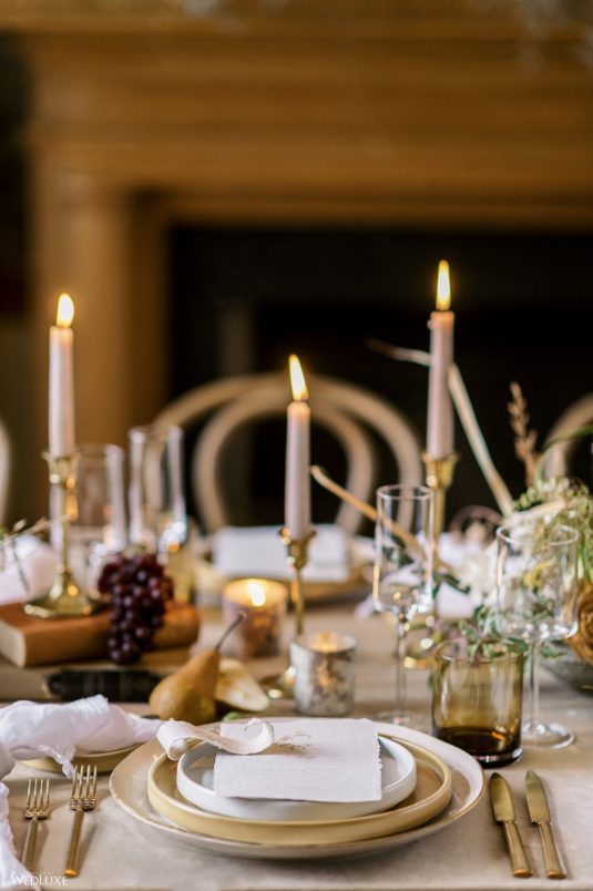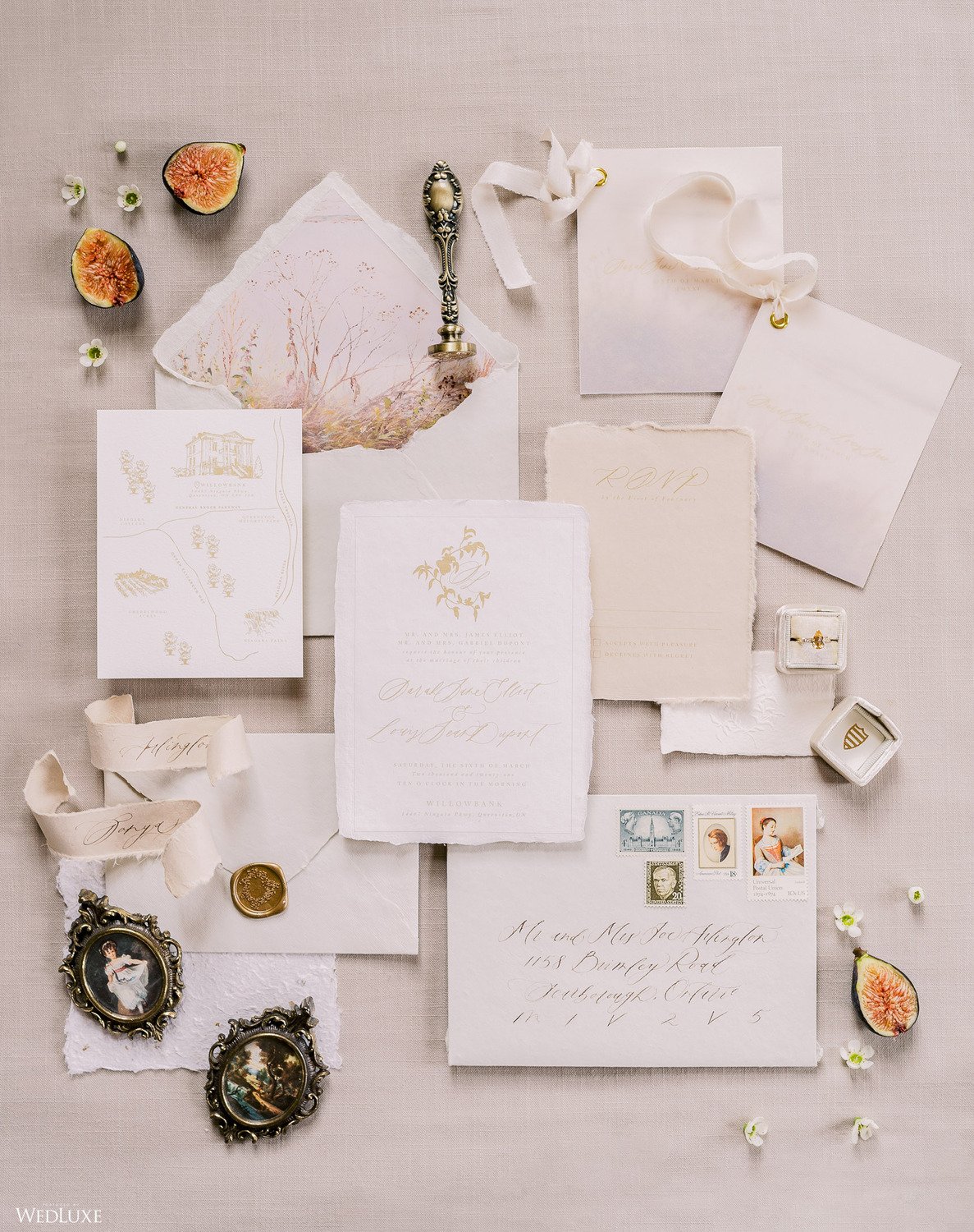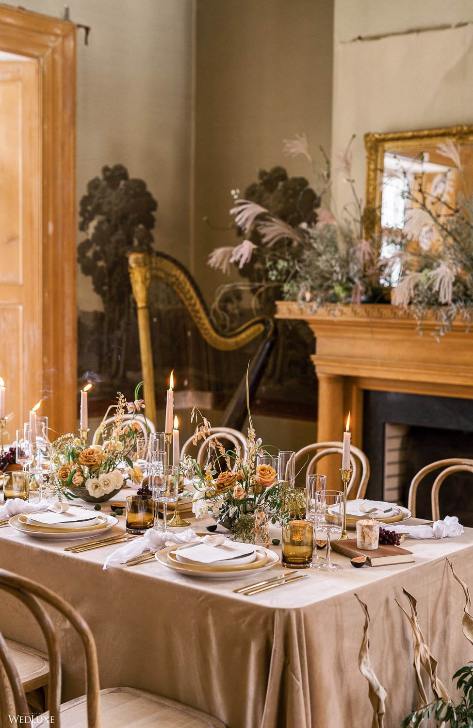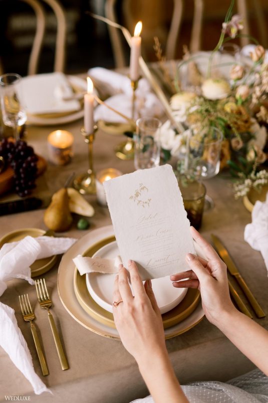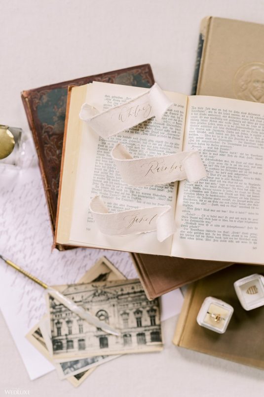 “Throughout the shoot, we incorporated different heirloom items that you could potentially find in a family archive – the antique books that we added to the tablescape; postcards, old photos, and the antique music score from our flat-lay detail are just some of the many examples,” shares Rainbow Chan Weddings.
