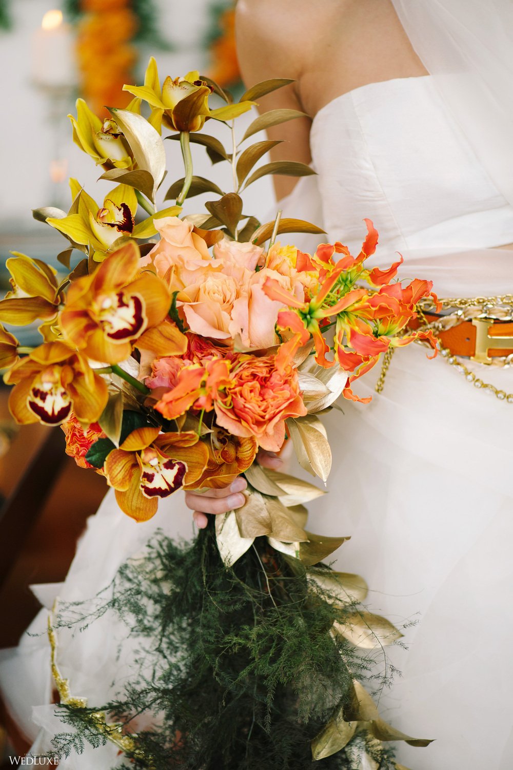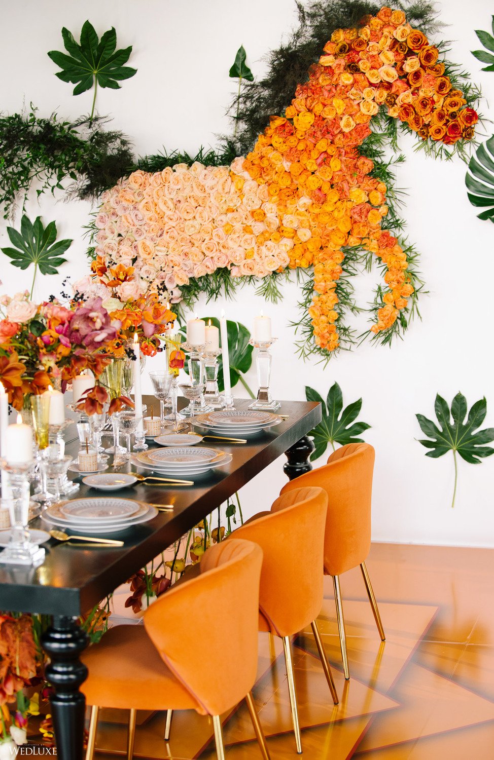 Lavish floral design is showcased throughout this shoot, including a unique floral installation underneath the table, which used cymbidium and Banda orchids, vandal roses, and glories lilies!