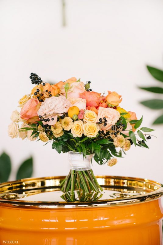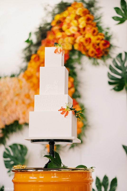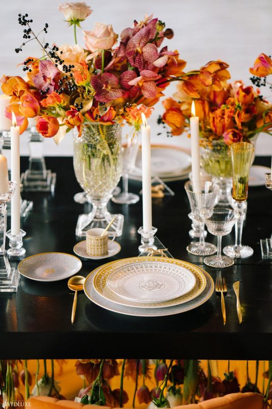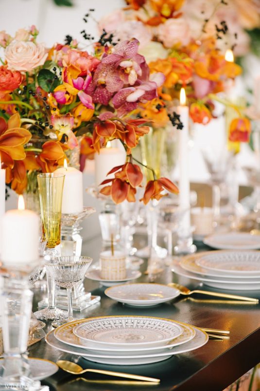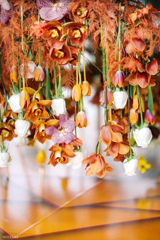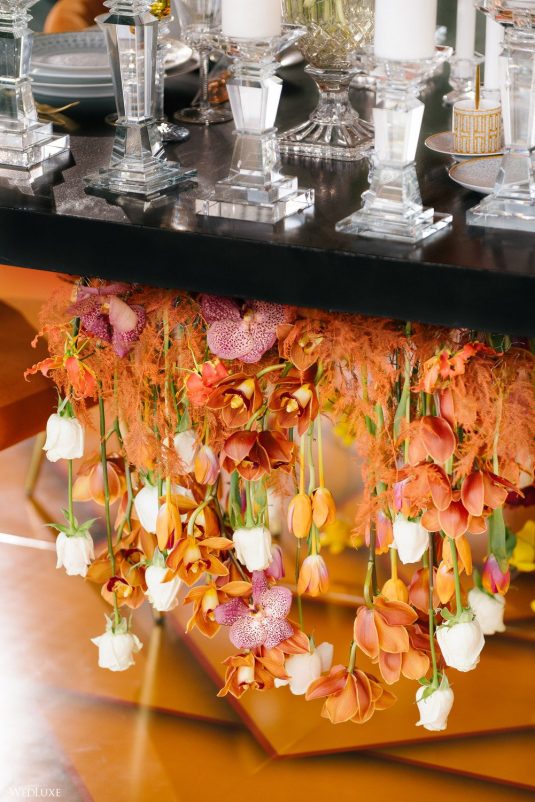 Lavish floral design is showcased throughout this shoot, including a unique floral installation underneath the table, which used cymbidium and Banda orchids, vandal roses, and glories lilies!