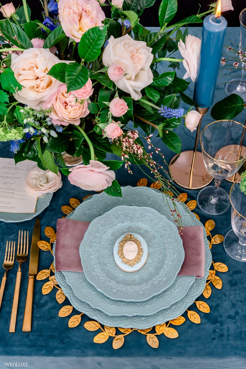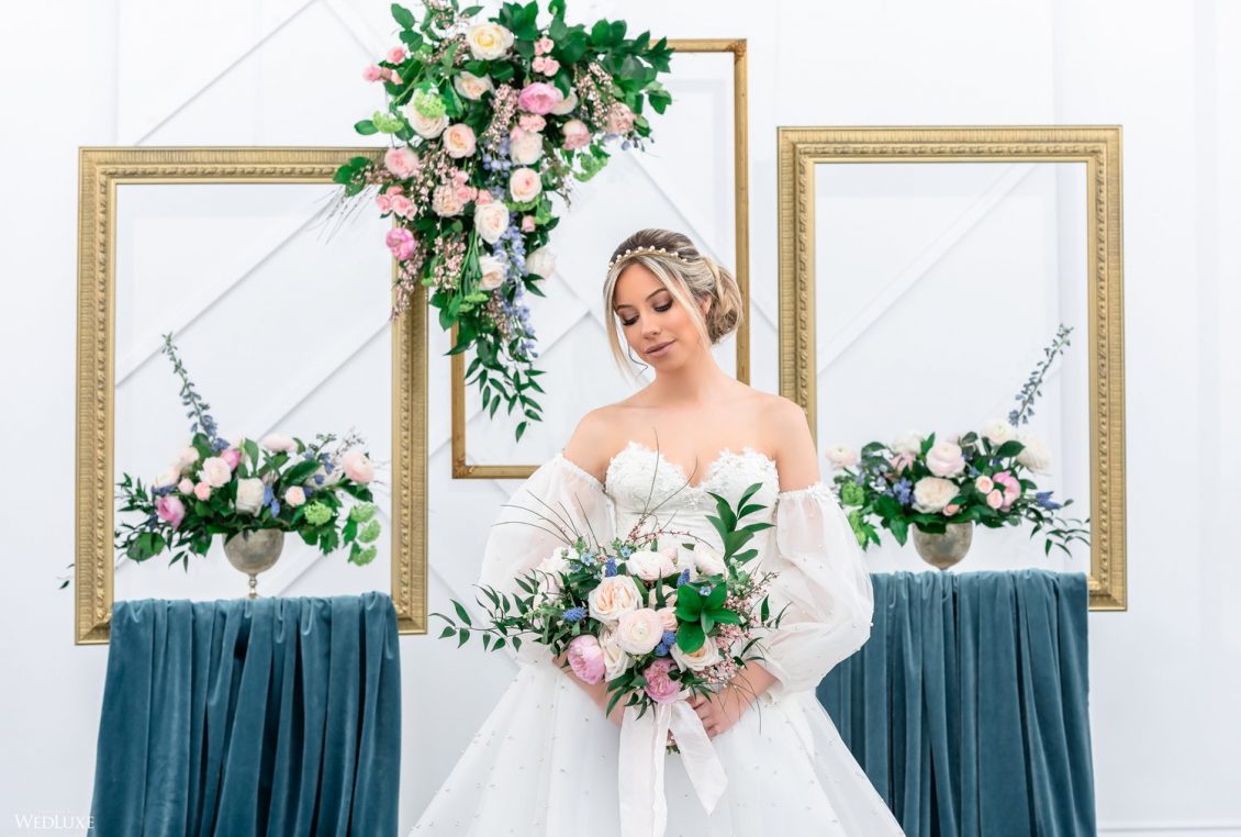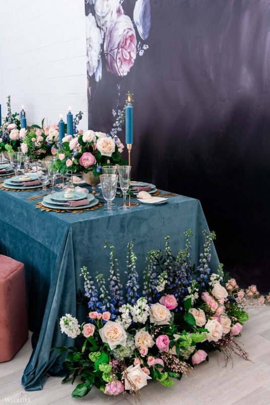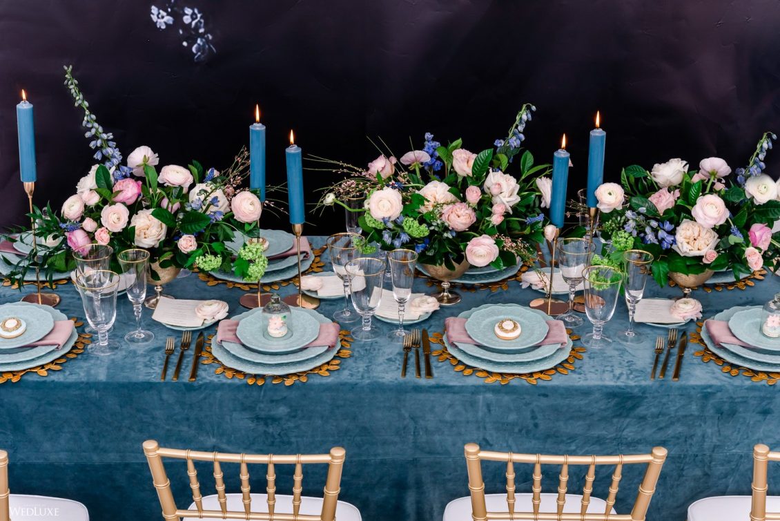 Inspired by the still life artworks by the Dutch masters, this Summer/Fall 2021 Glitterati Style File is all about the intersection of the traditional and modern, all awash in feminine touches of course! We’re obsessed with how beautifully the delicate floral design executed by Fleurisma Events Inc compliments the blue and gold decor. Do we see a colour palette trend forming? *wink* *wink*
