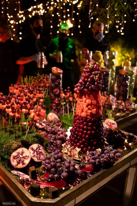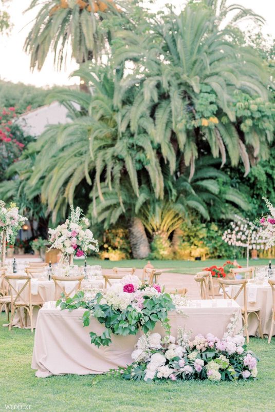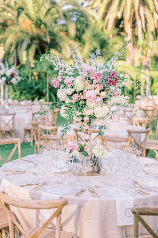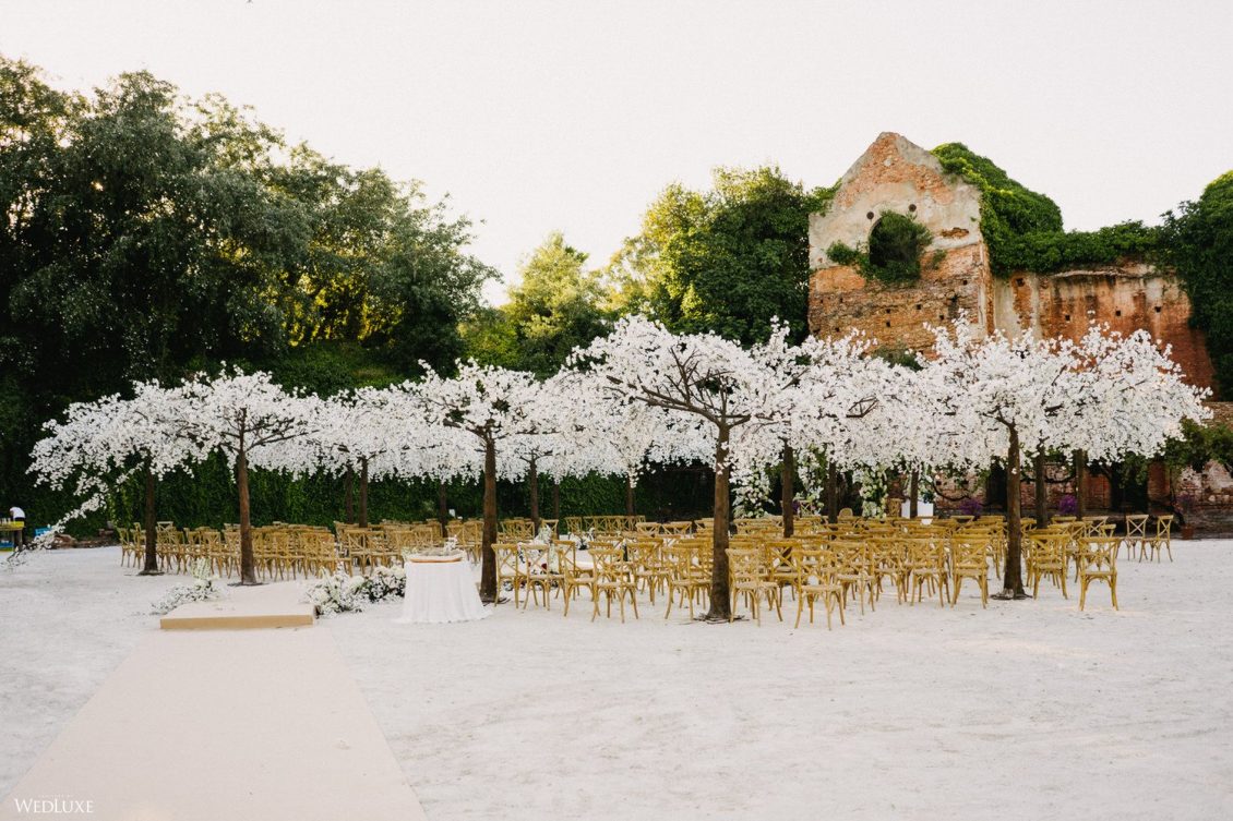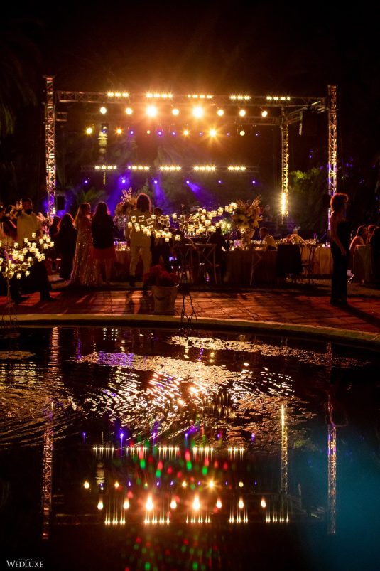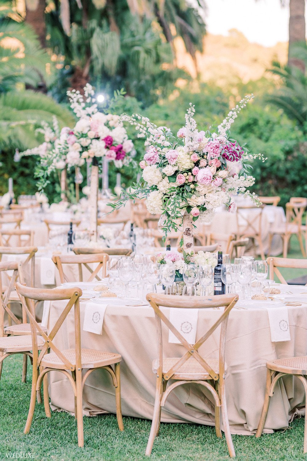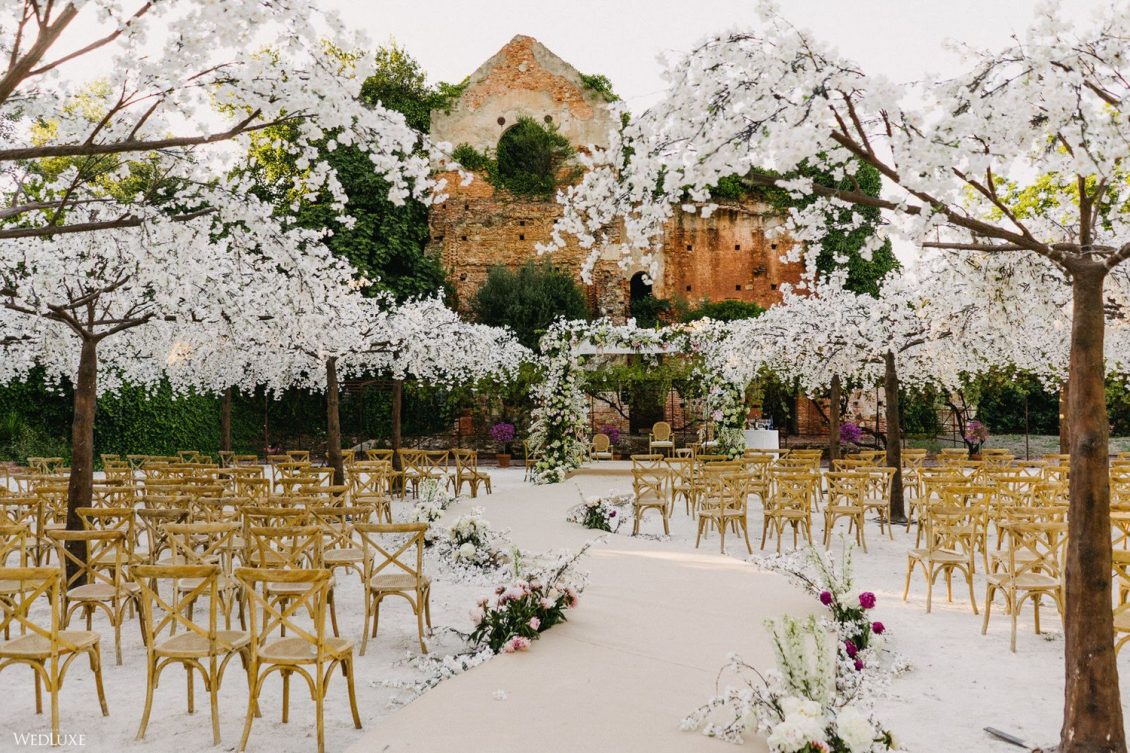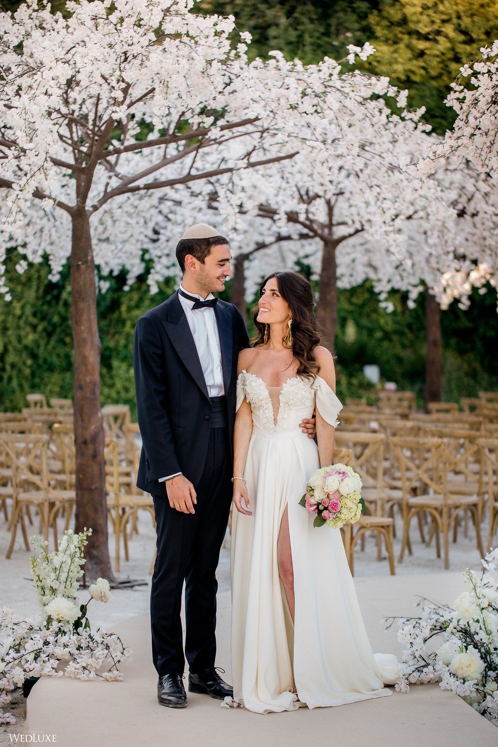 Couple Ava and Alexis traveled from Paris, France, to Marbella, Spain to celebrate their wedding in style! The bride wore a custom gown as she walked down the aisle through a forest of almond blossom trees, after which the couple and their guests enjoyed an equally magical reception. “Around the fountain of the reception area, [Pedro Navarro] placed over a thousand candles on specially designed asymmetric structures so that the dinner and dance area was framed by candlelight,” describes Tara of We Do Unique Weddings.