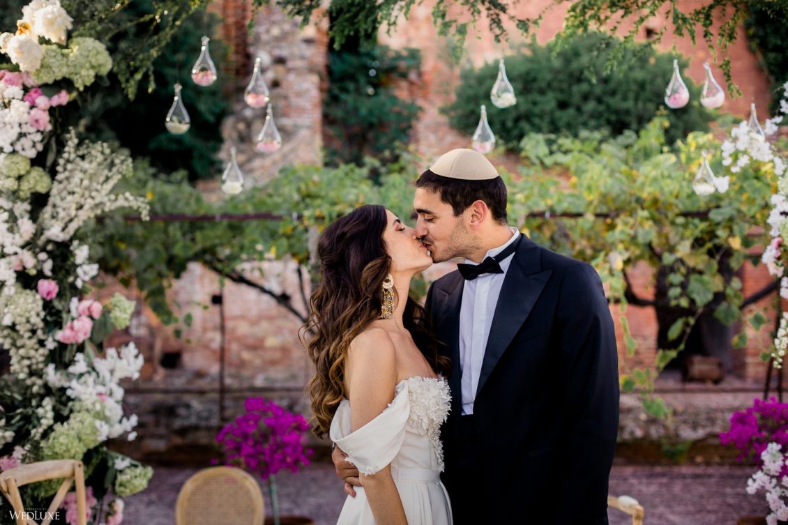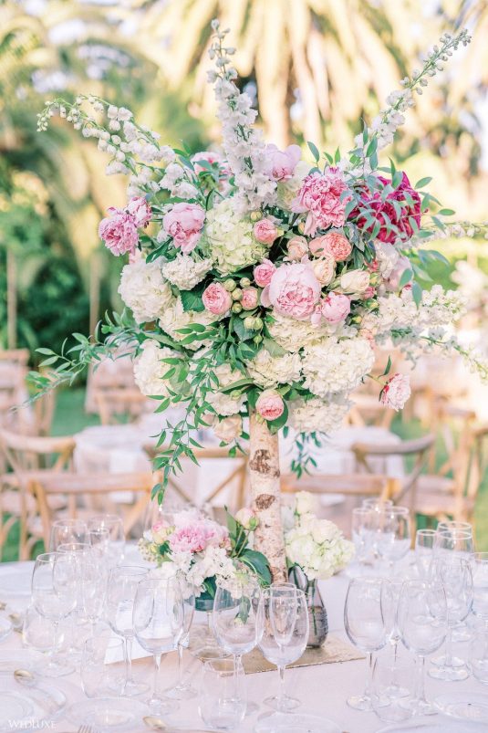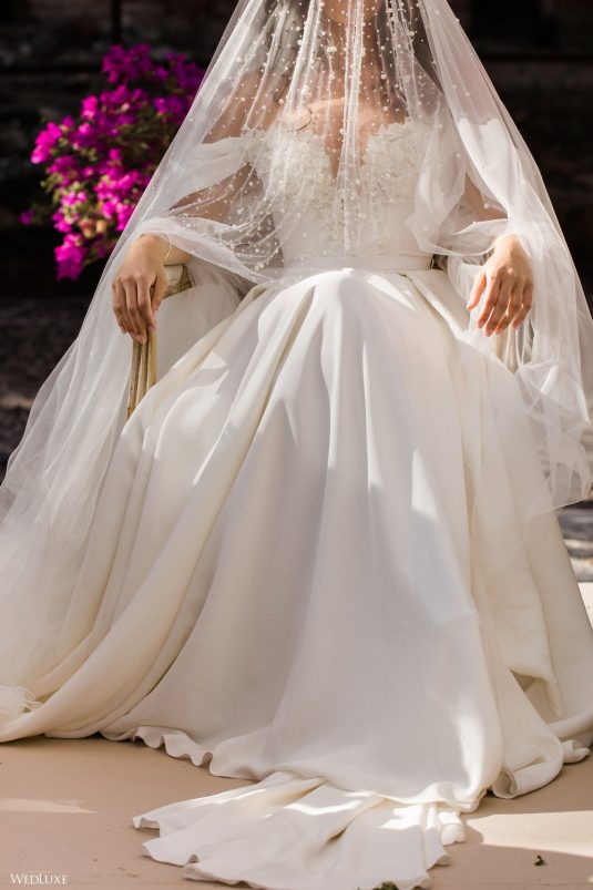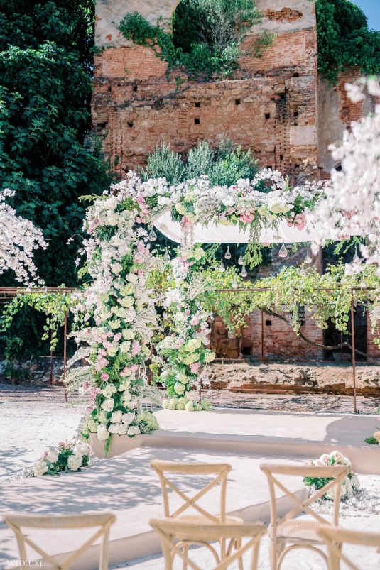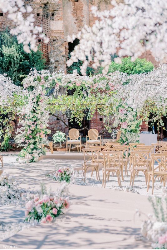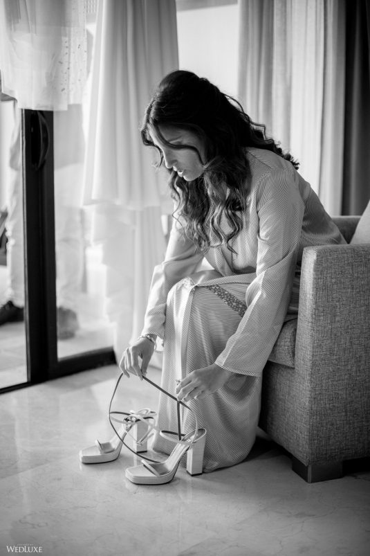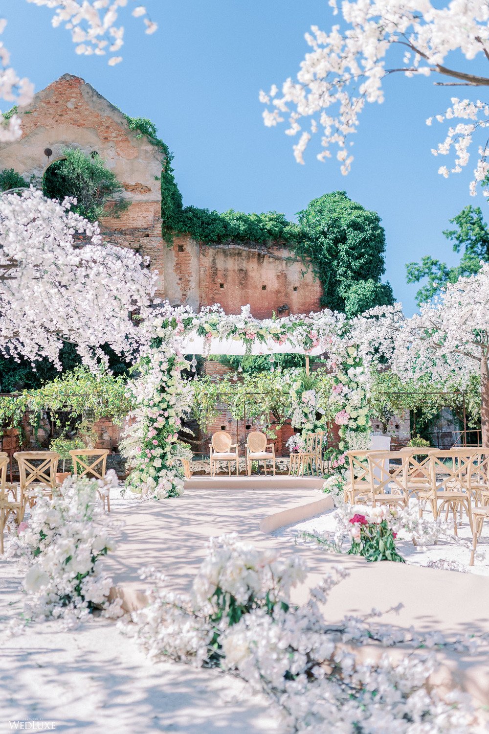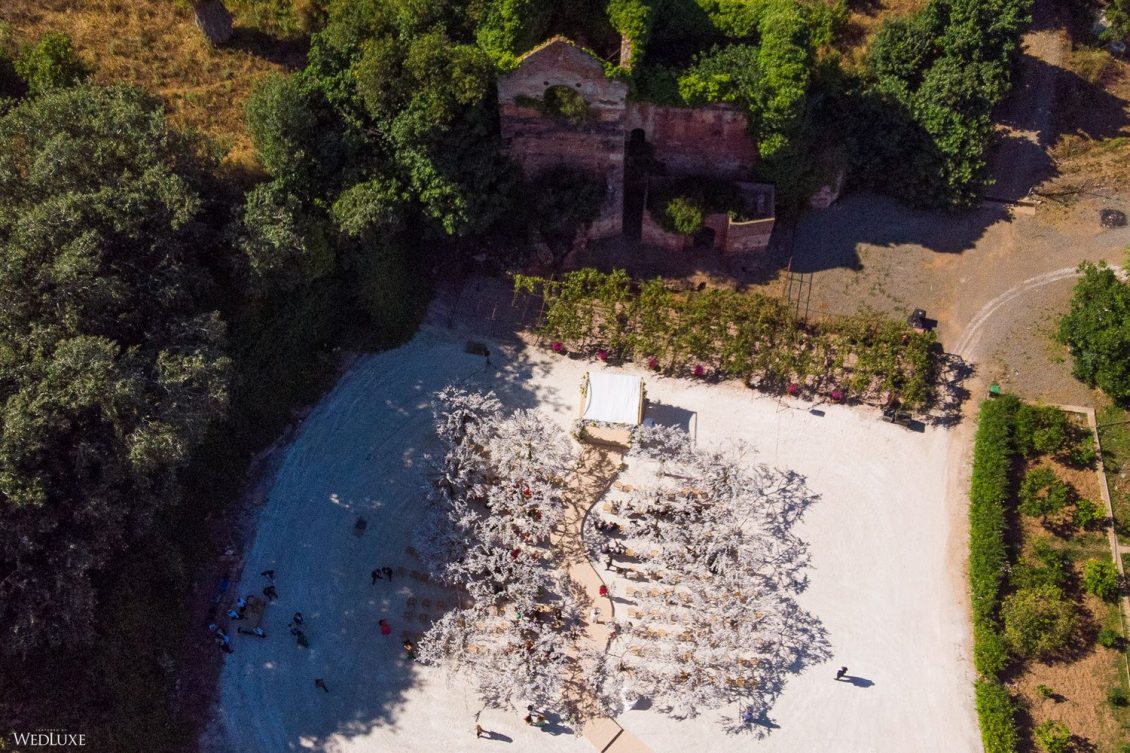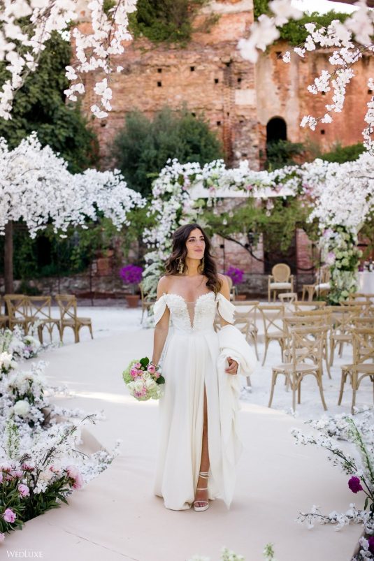 Couple Ava and Alexis traveled from Paris, France, to Marbella, Spain to celebrate their wedding in style! The bride wore a custom gown as she walked down the aisle through a forest of almond blossom trees, after which the couple and their guests enjoyed an equally magical reception. “Around the fountain of the reception area, [Pedro Navarro] placed over a thousand candles on specially designed asymmetric structures so that the dinner and dance area was framed by candlelight,” describes Tara of We Do Unique Weddings.