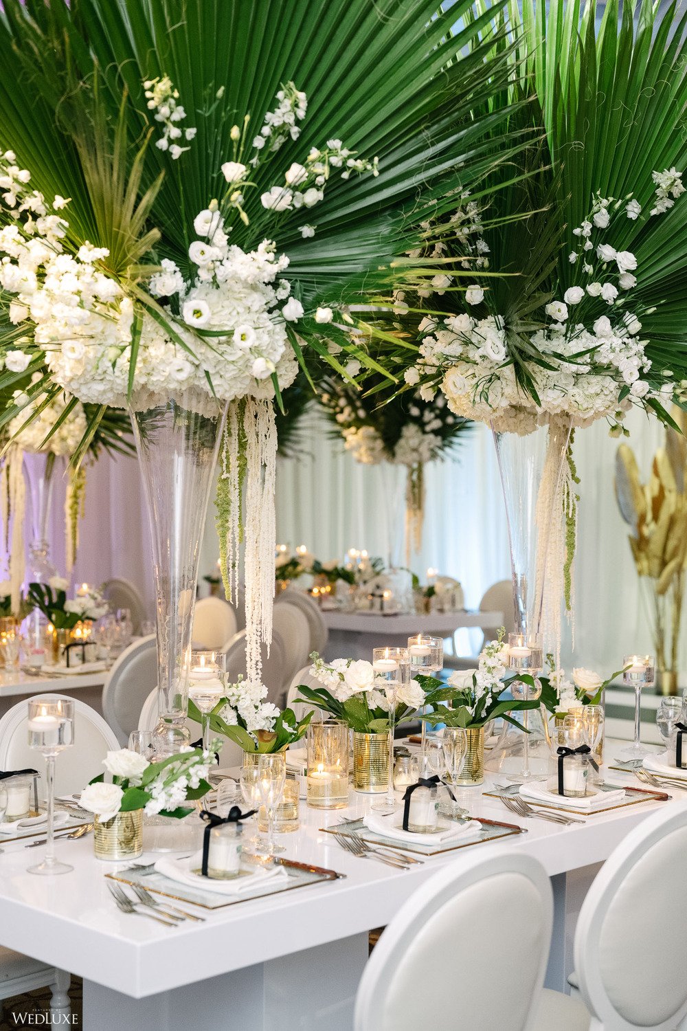 “We love to stand out and wanted to make sure our wedding was different and made a statement!” shares couple Christine and Dani of their luxe Toronto wedding—and to that, we say mission accomplished! This wedding gives us major Miami vibes, full of green palm fronds and a modern, white and gold-accented palette!